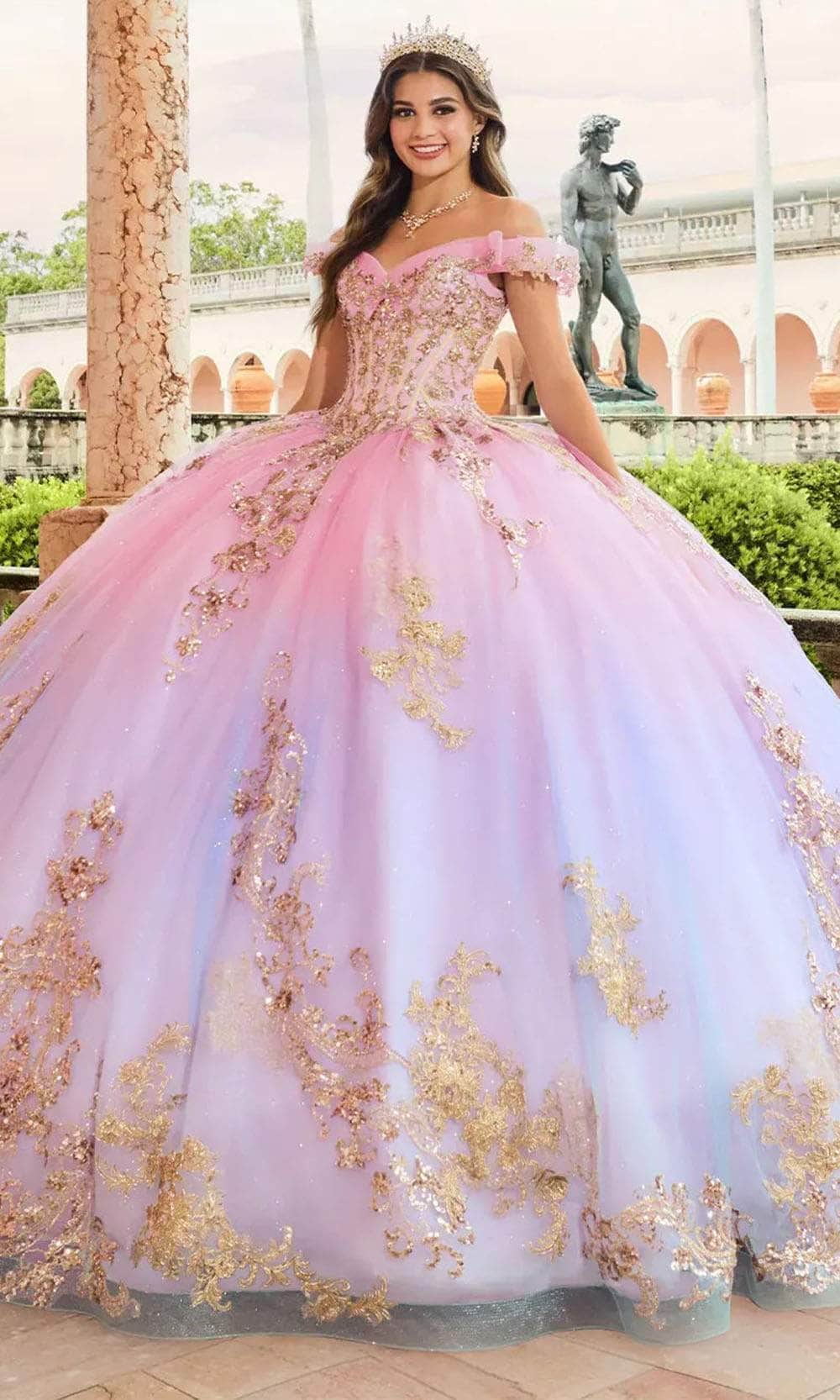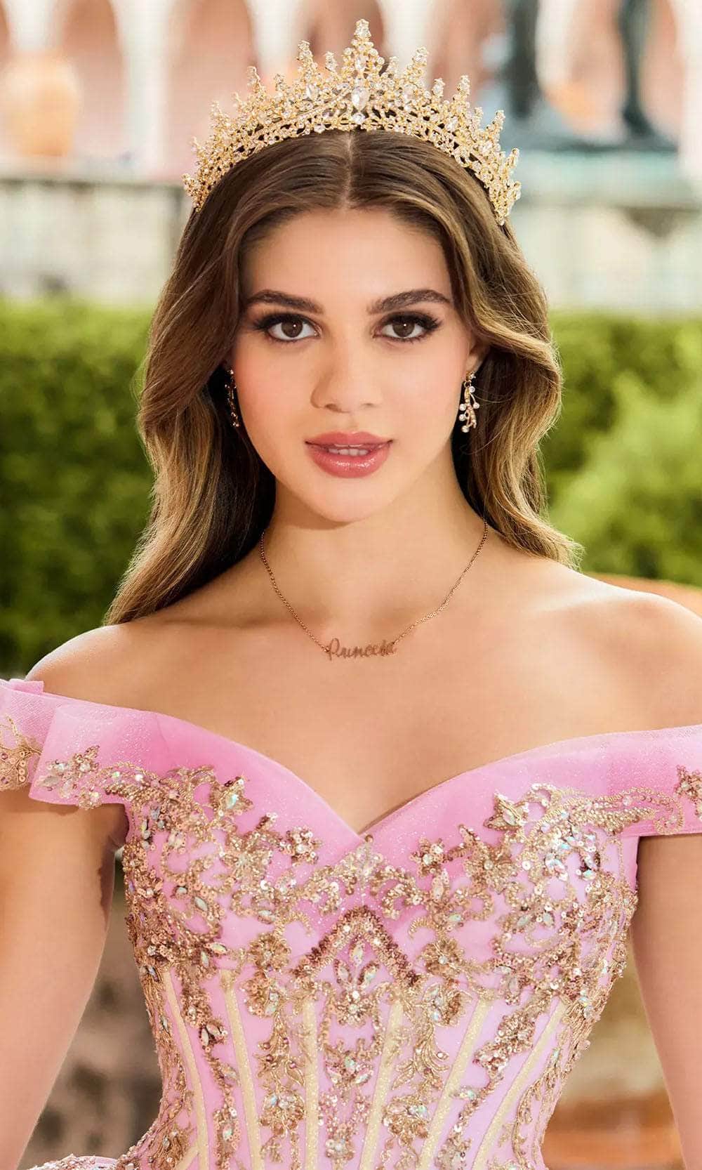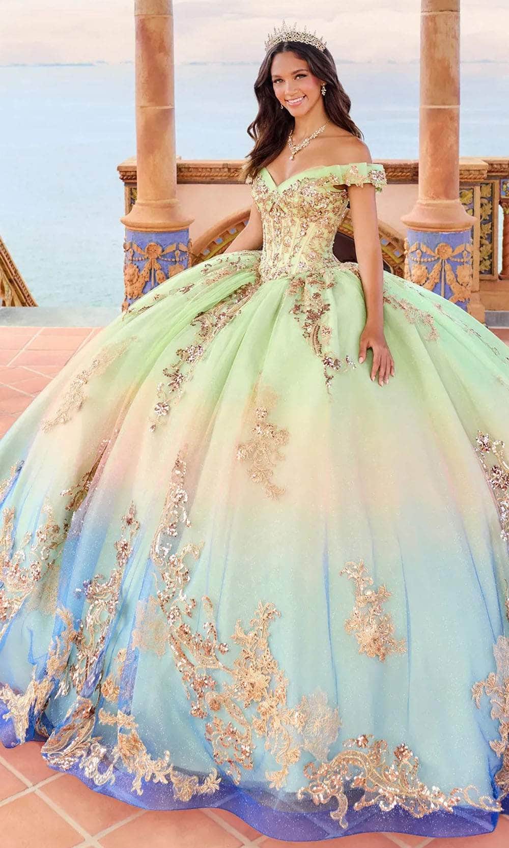 Step into an enchanting dream with Princesa by Ariana Vara PR30152, an exquisite Quinceañera gown that exudes breathtaking charm. Delicate lace appliques, unique ombre glitter tulle, and shimmering sequins create a mesmerizing effect. The sweetheart neckline and off-the-shoulder design add an ethereal touch to your look, while the spectacular one-of-a-kind ombre skirt guarantees to make your special day truly magical. Revel in the enchantment of this meticulously crafted Princesa by Ariana Vara PR30152, tailored to create unforgettable moments on your Quinceañera celebration. Models are wearing Cotton Candy, Lime Sorbet, and Peach Rainbow colors.