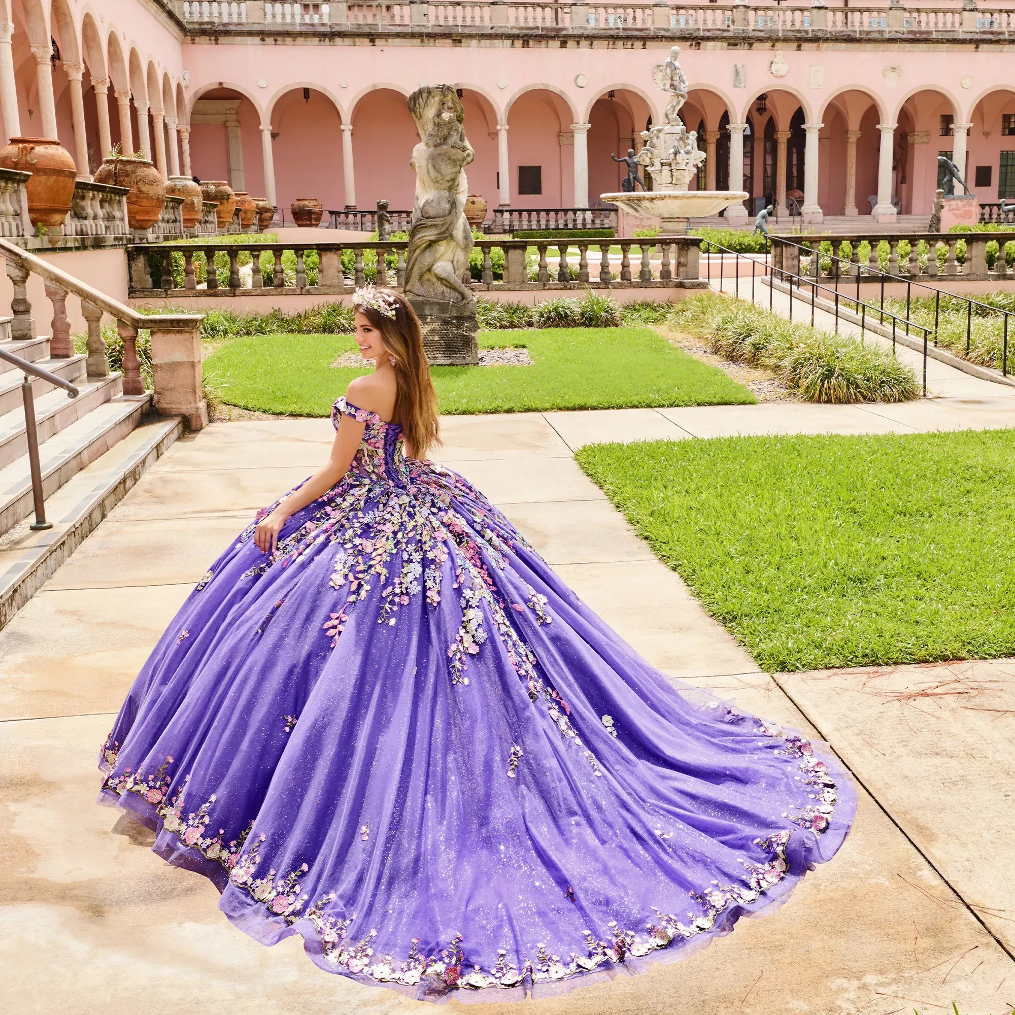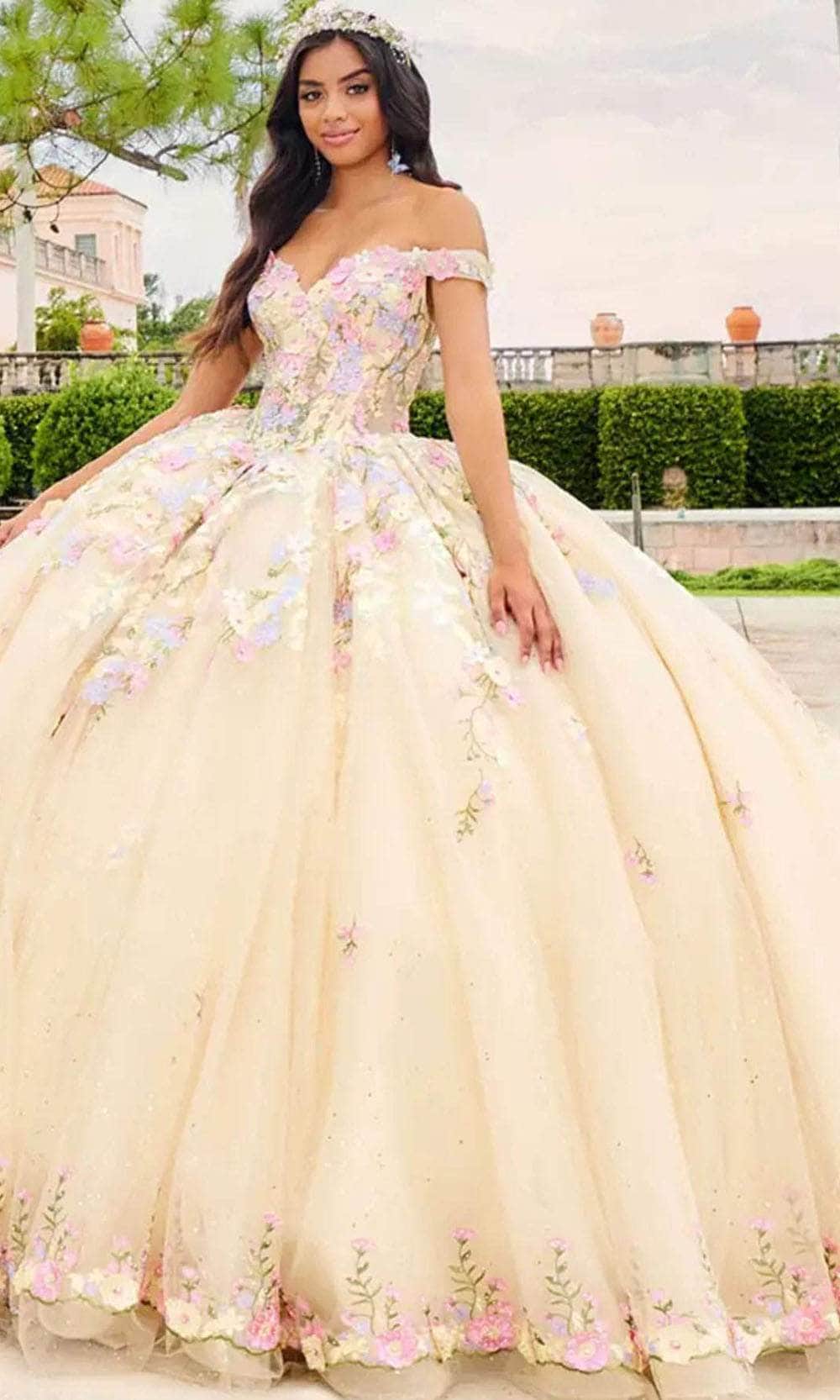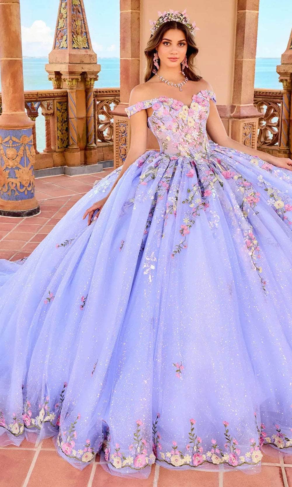 Immerse yourself in the whimsical enchantment of Ivonne-D PR30155, a Quinceañera gown as captivating as a blooming floral garden. Crafted from sparkling glitter tulle and adorned with delicate three-dimensional floral detailing, this one-of-a-kind ballgown ensures an unforgettable statement on your special day. The breathtaking cathedral train and a pretty matching caplet add the finishing touches to this spectacular Quinceañera Ivonne-D PR30155, promising to make your celebration truly magical and filled with timeless beauty. Models are wearing CHAMPAGNE/MULTI, PURPLE/MULTI and PERIWINKLE/MULTI colors.