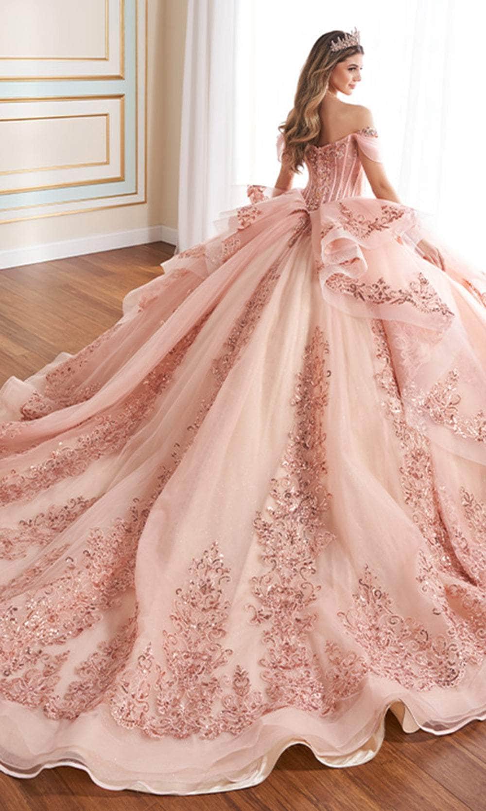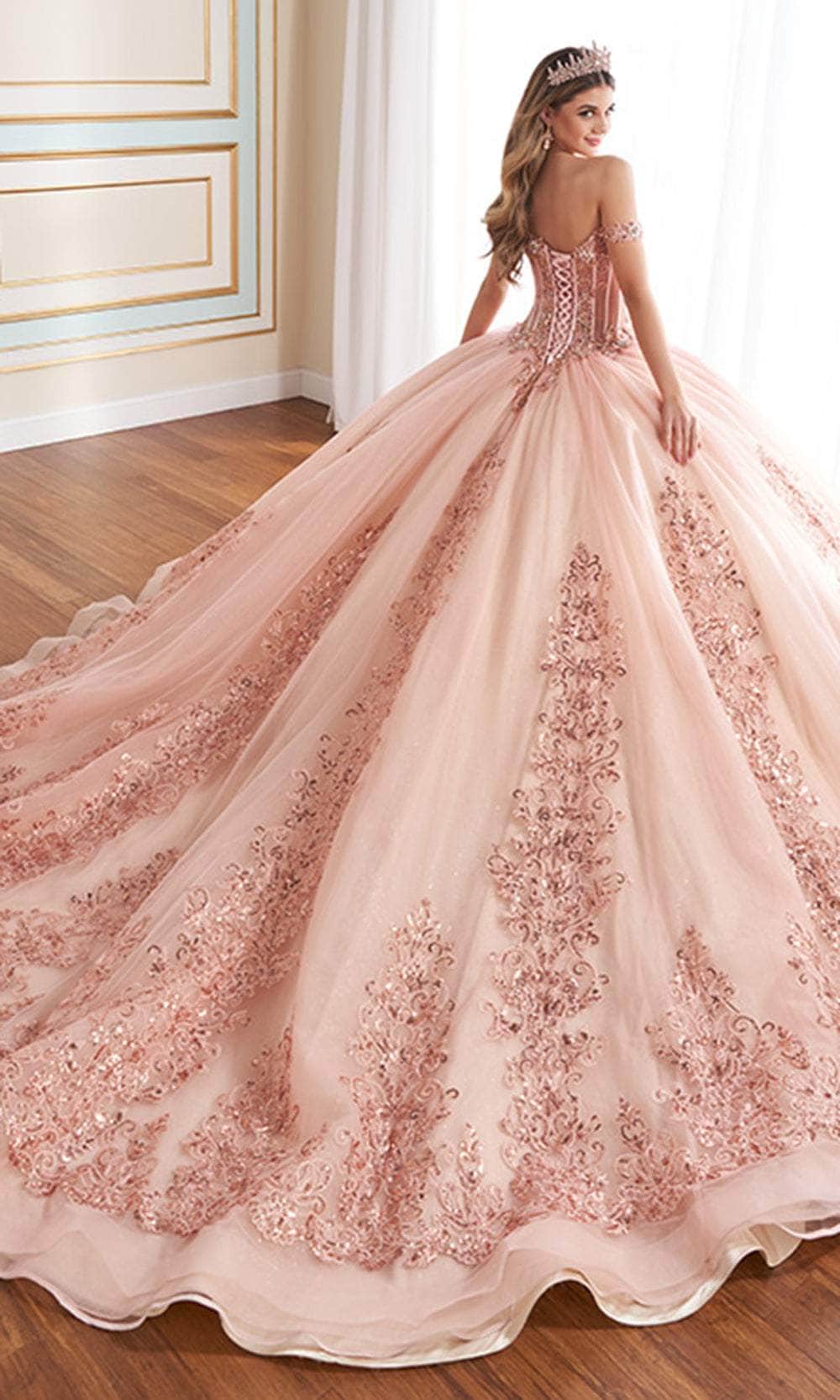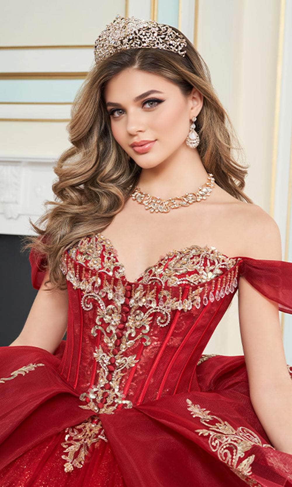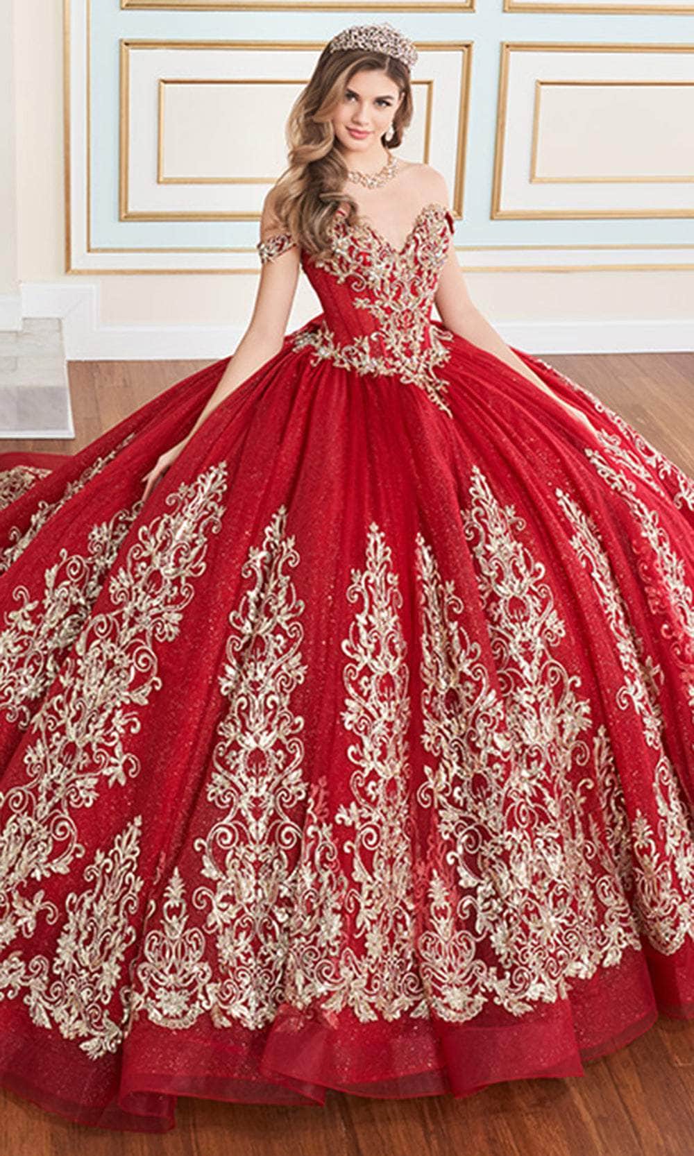Embrace the magic of your Quinceañera in the enchanting Princesa by Ariana Vara PR30171 gown. This dazzling dress is crafted from shimmering glitter tulle and beautifully detailed with lace appliqués, promising a look that exudes elegance. The Basque bodice features a sweetheart neckline adorned with sparkling stone accents and charming covered buttons for added sophistication. Semi-sheer corseting lends a touch of fantasy, while the optional off-the-shoulder straps provide a customizable style. The gown is completed with a voluminous overskirt, ensuring a grand entrance that will leave a lasting impression. Embrace the magic of your Quinceañera in the enchanting Princesa by Ariana Vara PR30171 gown. This dazzling dress is crafted from shimmering glitter tulle and beautifully detailed with lace appliqués, promising a look that exudes elegance. The Basque bodice features a sweetheart neckline adorned with sparkling stone accents and charming covered buttons for added sophistication. Semi-sheer corseting lends a touch of fantasy, while the optional off-the-shoulder straps provide a customizable style. The Princesa by Ariana Vara PR30171 is completed with a voluminous overskirt, ensuring a grand entrance that will leave a lasting impression.
