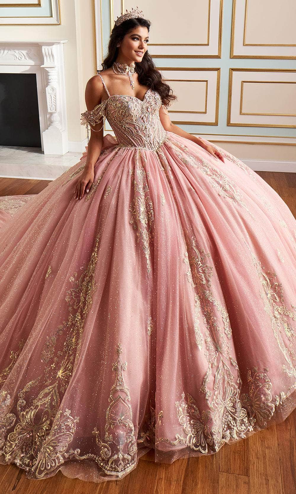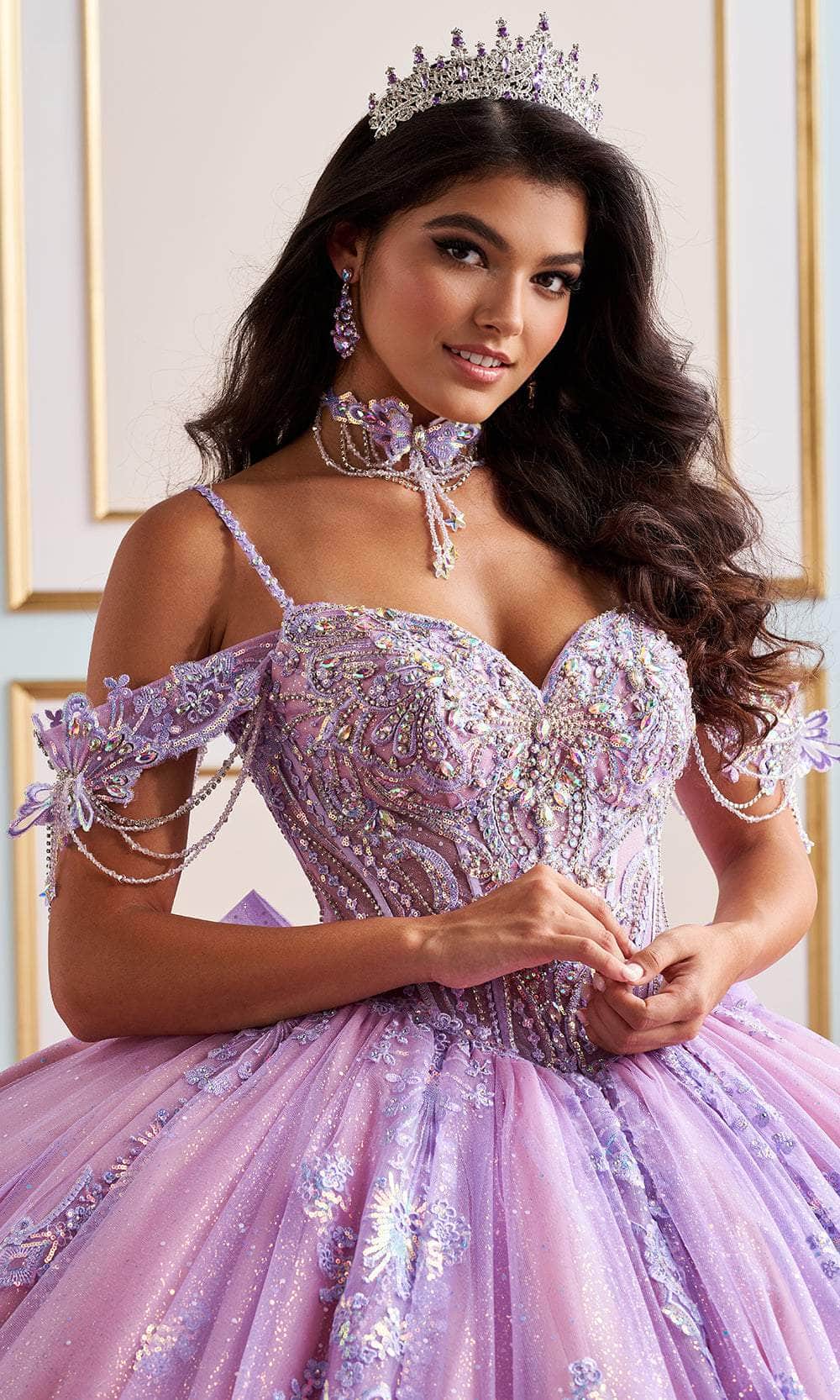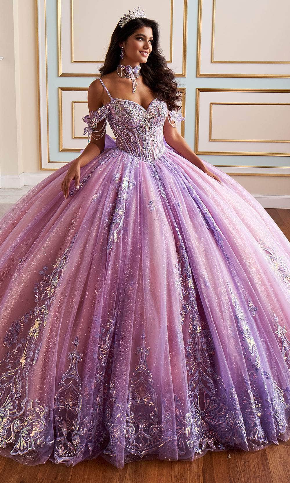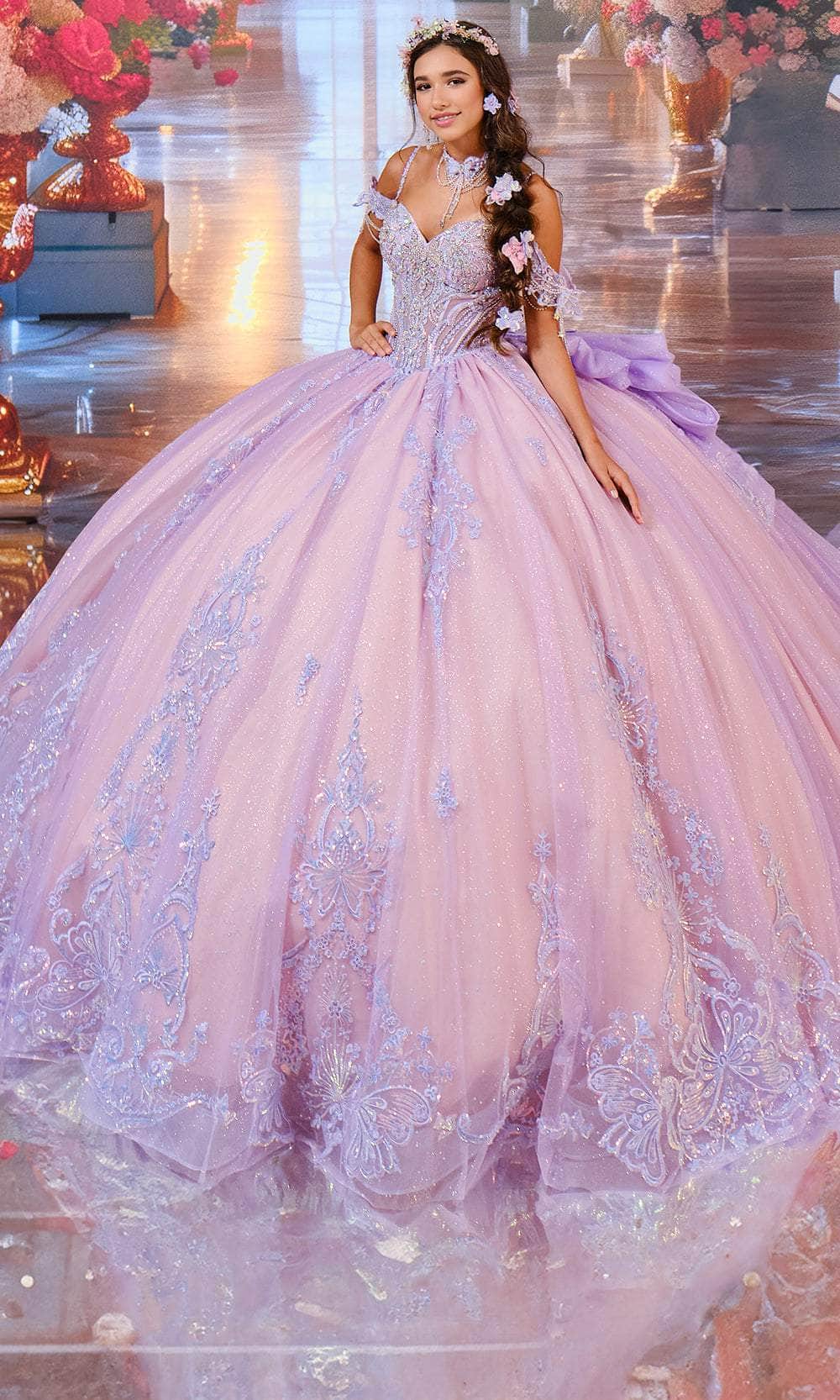 Embrace the magic of your Quinceanera with the Princesa by Ariana Vara PR30198, a two-tone ball gown that exudes fairytale charm. The sleeveless sweetheart bodice and Basque waistline create an elegant silhouette, while the glitter tulle with intricate metallic lace appliques add a mesmerizing sparkle. Stone accents and shimmering sequins catch the light beautifully, ensuring all eyes are on you. This gown offers versatility with detachable off-the-shoulder straps and an oversized bow with a train, allowing you to customize your look for the big day. With functional side pockets, the Princesa by Ariana Vara PR30198 masterpiece seamlessly blends style and practicality. Models are wearing Rose Gold, Wine/Gold, and Lavender/Rose colors.