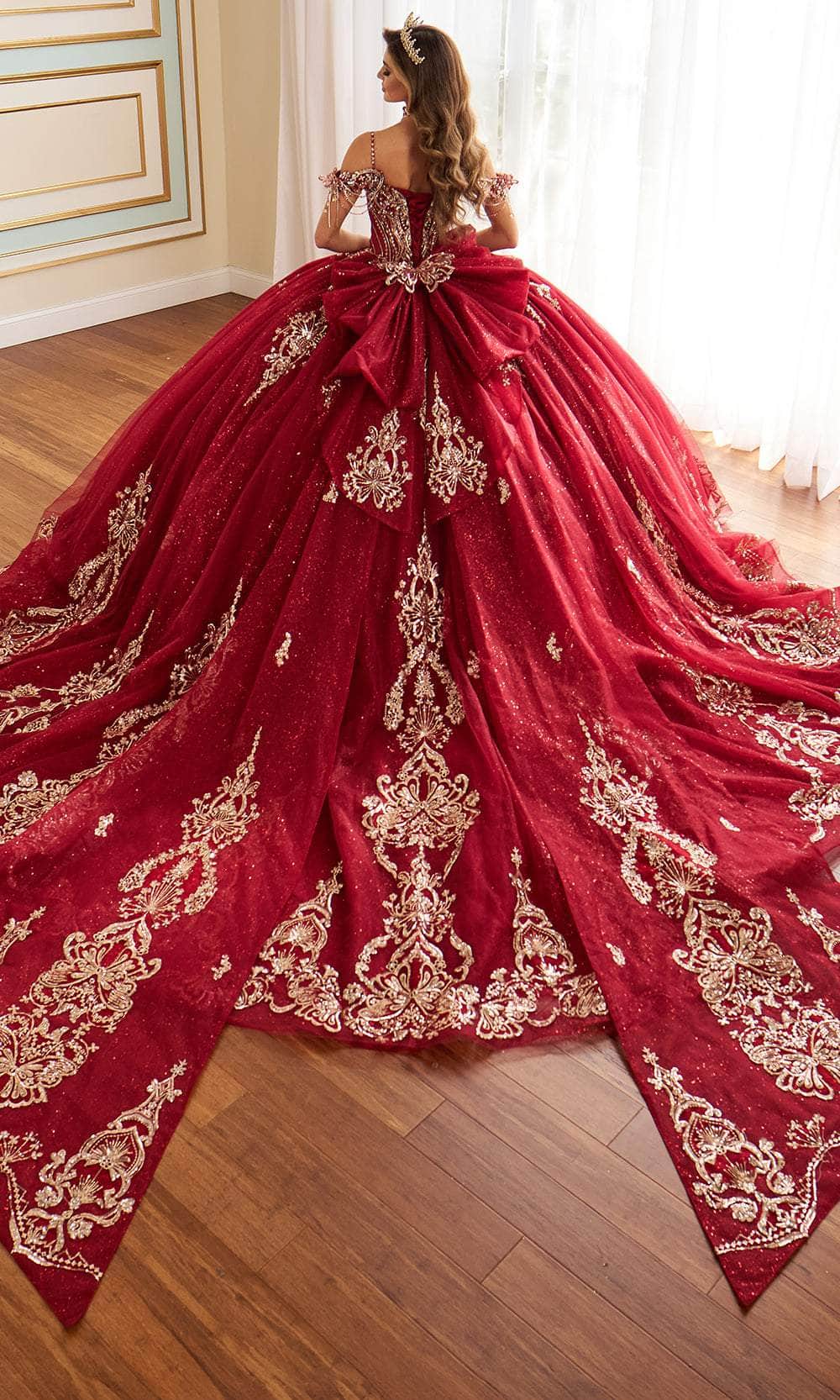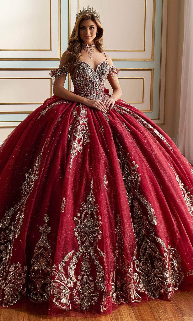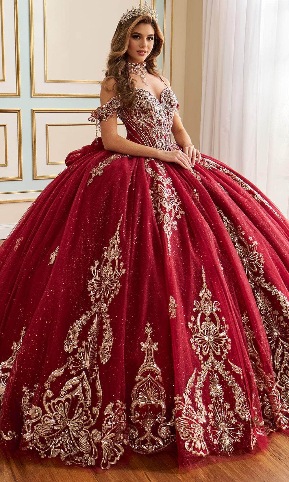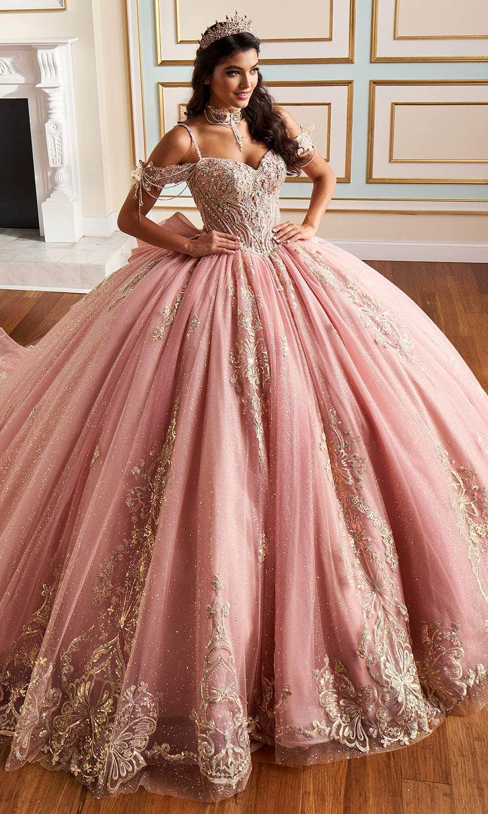 Embrace the magic of your Quinceanera with the Princesa by Ariana Vara PR30198, a two-tone ball gown that exudes fairytale charm. The sleeveless sweetheart bodice and Basque waistline create an elegant silhouette, while the glitter tulle with intricate metallic lace appliques add a mesmerizing sparkle. Stone accents and shimmering sequins catch the light beautifully, ensuring all eyes are on you. This gown offers versatility with detachable off-the-shoulder straps and an oversized bow with a train, allowing you to customize your look for the big day. With functional side pockets, the Princesa by Ariana Vara PR30198 masterpiece seamlessly blends style and practicality. Models are wearing Rose Gold, Wine/Gold, and Lavender/Rose colors.