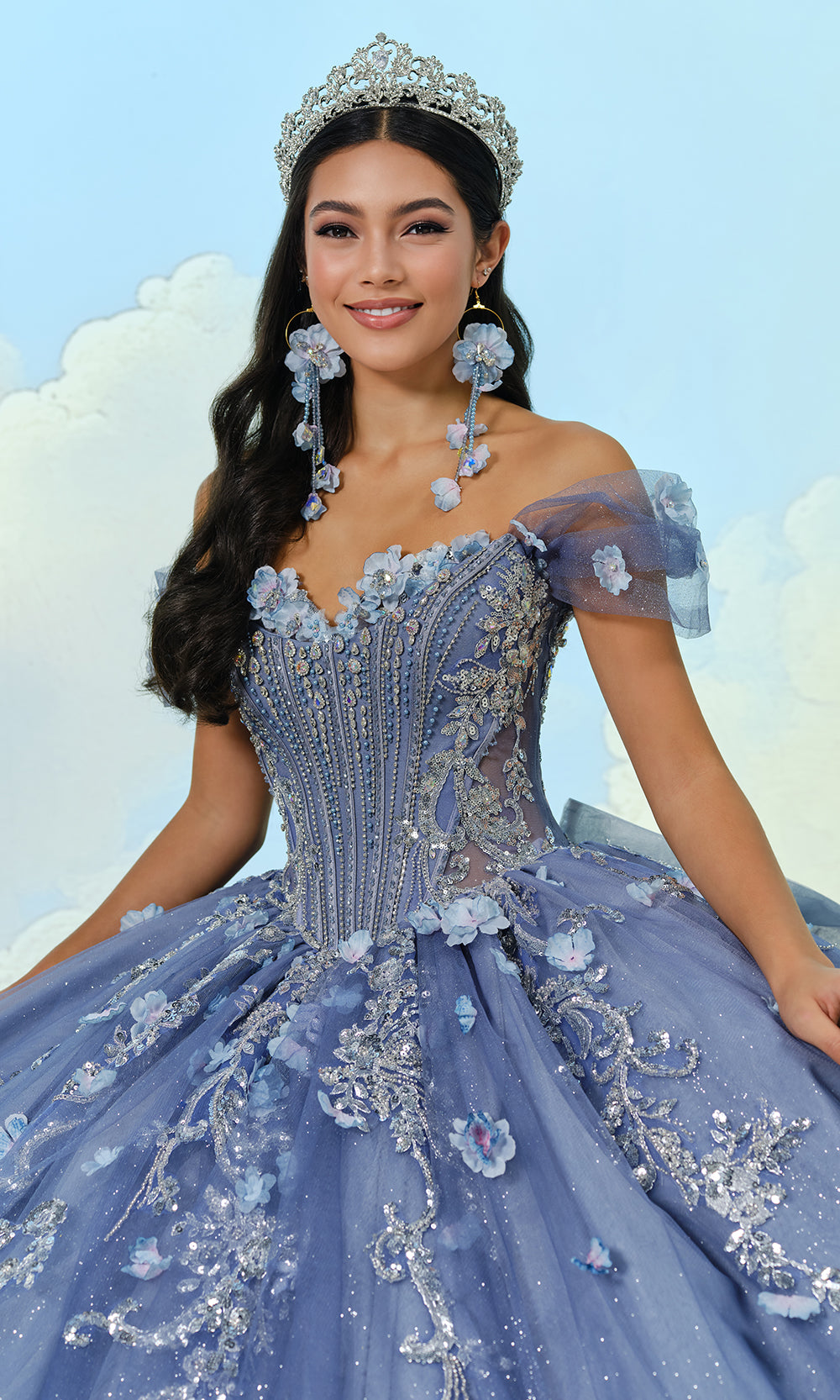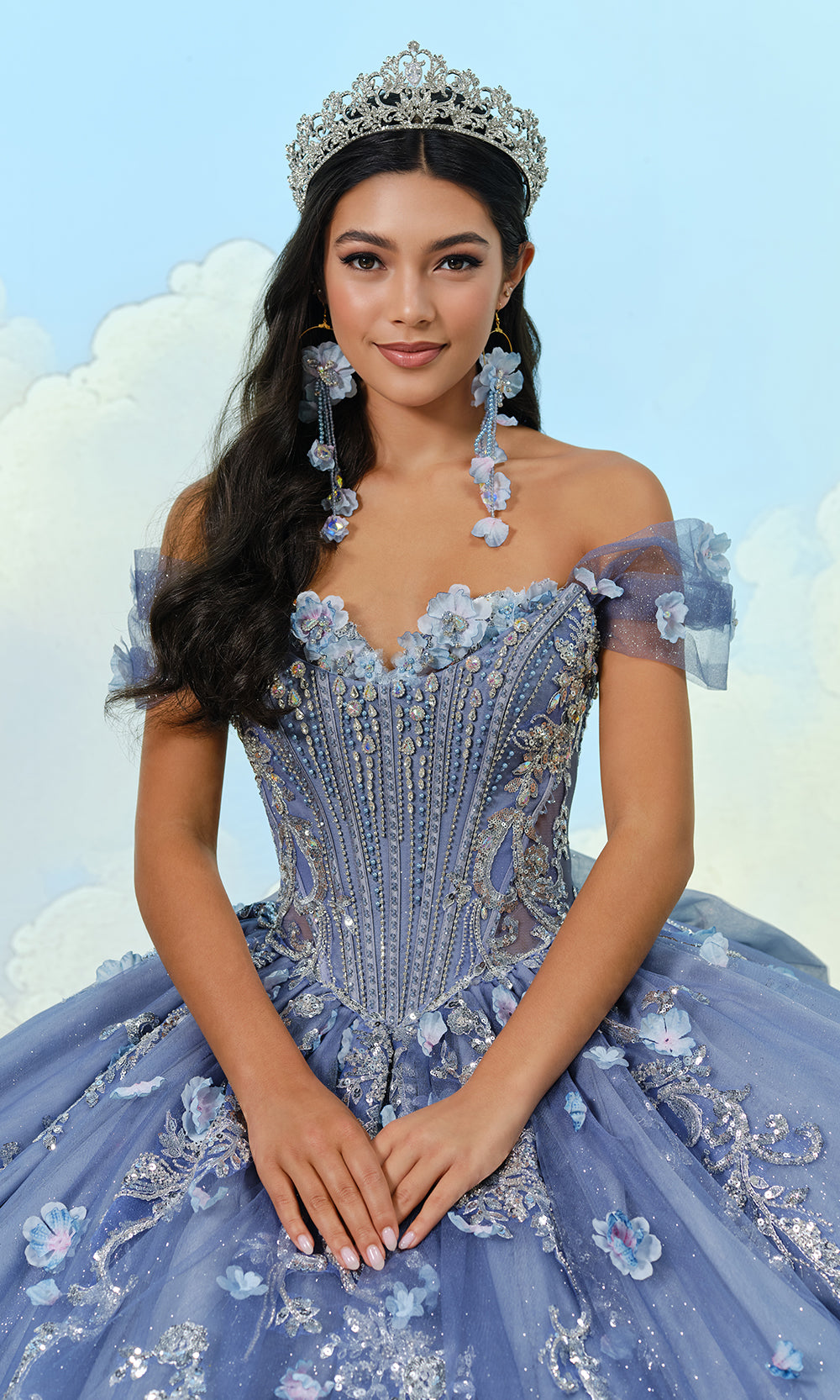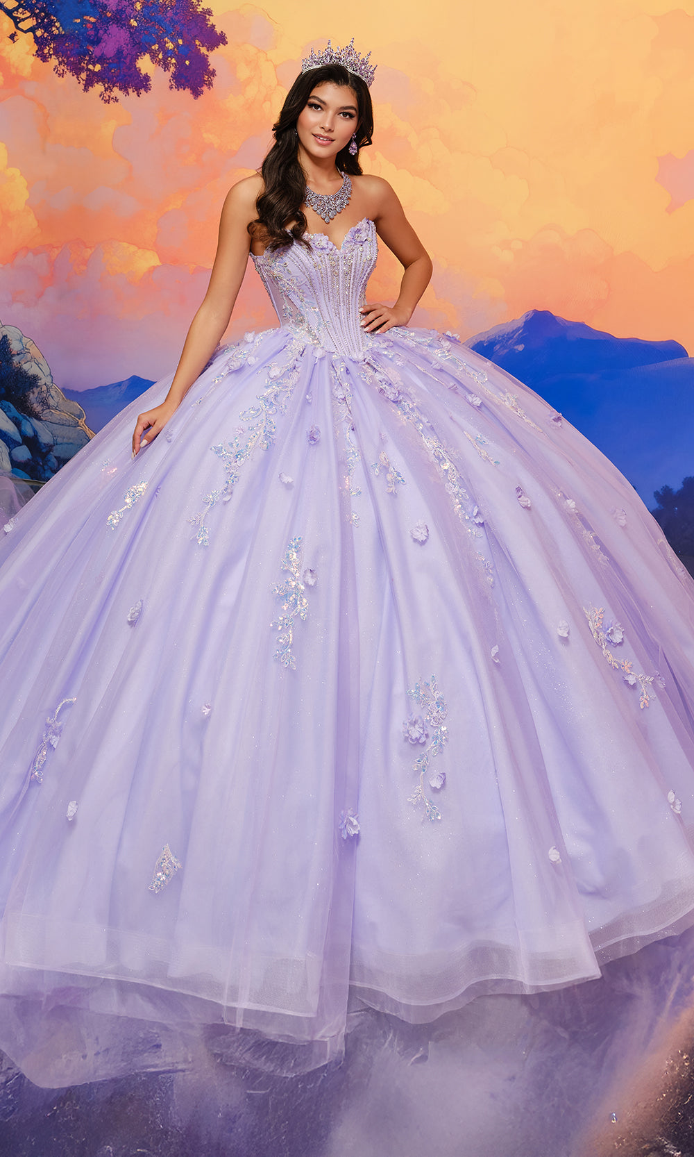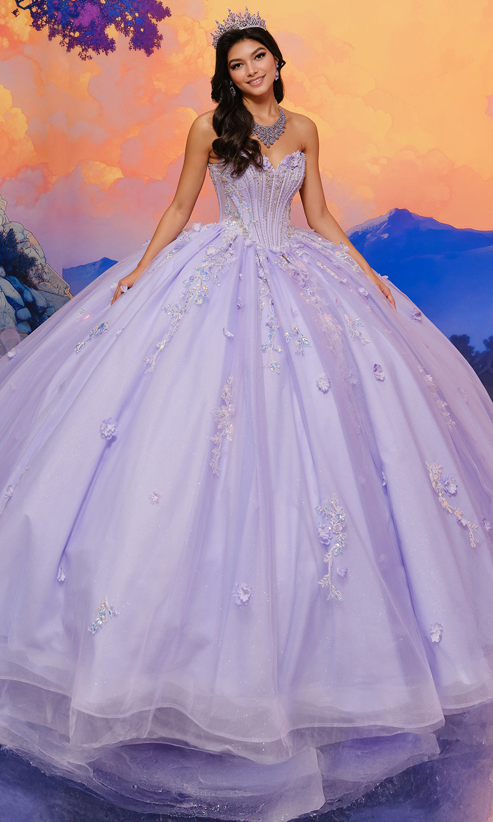 Delicate floral embellishments and a whimsical bow detail set the tone for Princesa by Ariana Vara PR30202. The strapless sweetheart neckline and detachable off-shoulder straps add charm, while the corset bodice sculpts the waist. Layers of sparkling tulle create a voluminous ballgown skirt adorned with dimensional flowers and shimmering beaded accents throughout. A long sweep train and detachable back bow completes the fantasy with every step. Make an entrance to remember with the stunning silhouette of Princesa by Ariana Vara PR30202. Models are wearing French Vanilla, Lilac, and Slate colors.