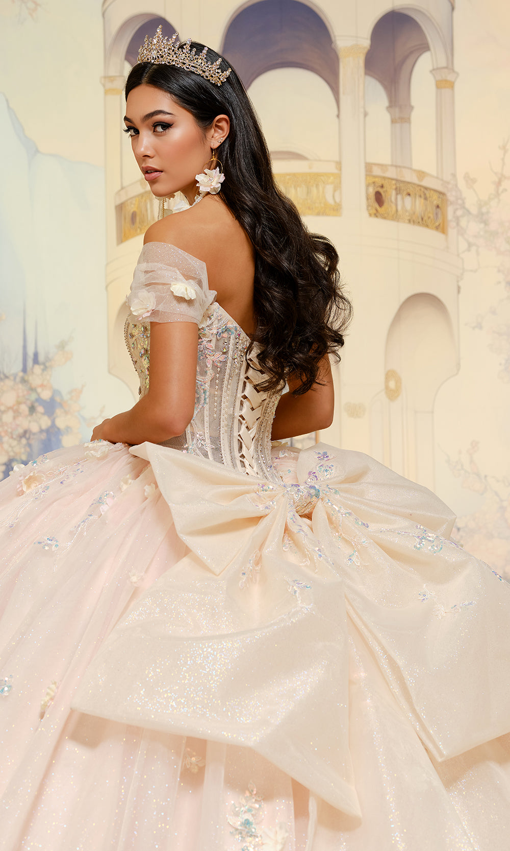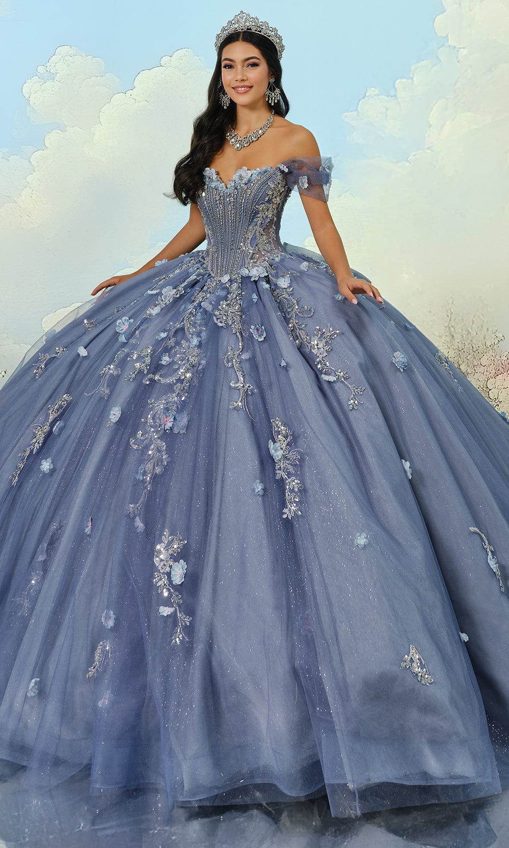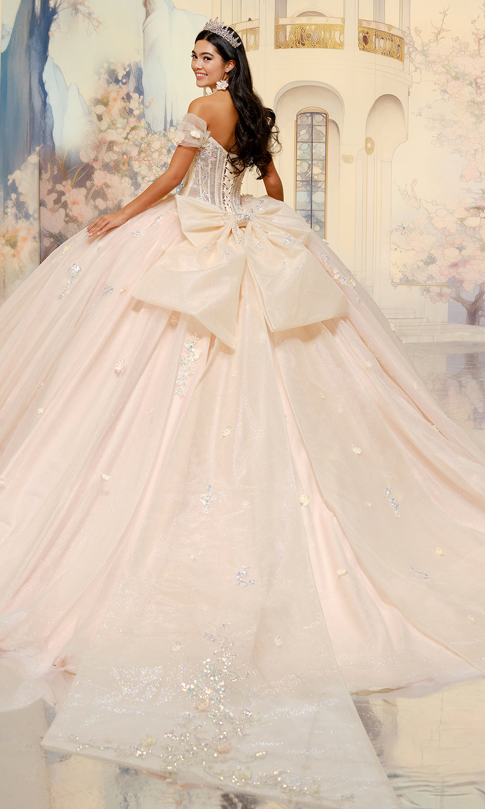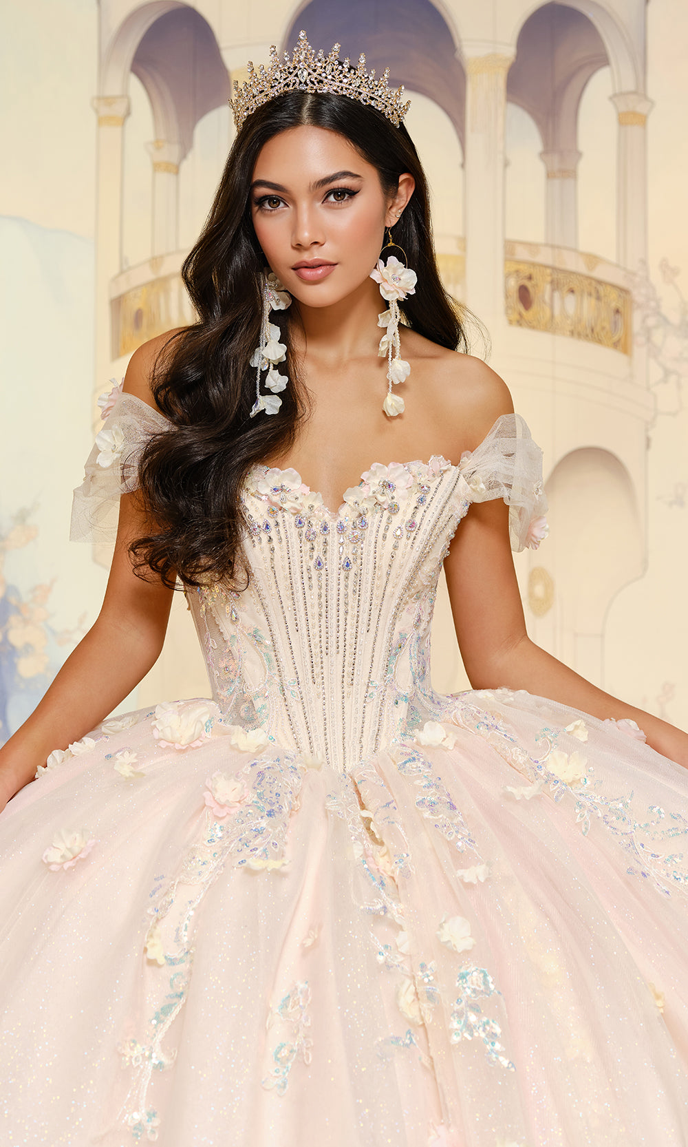Delicate floral embellishments and a whimsical bow detail set the tone for Princesa by Ariana Vara PR30202. The strapless sweetheart neckline and detachable off-shoulder straps add charm, while the corset bodice sculpts the waist. Layers of sparkling tulle create a voluminous ballgown skirt adorned with dimensional flowers and shimmering beaded accents throughout. A long sweep train and detachable back bow completes the fantasy with every step. Make an entrance to remember with the stunning silhouette of Princesa by Ariana Vara PR30202. Models are wearing French Vanilla, Lilac, and Slate colors.
