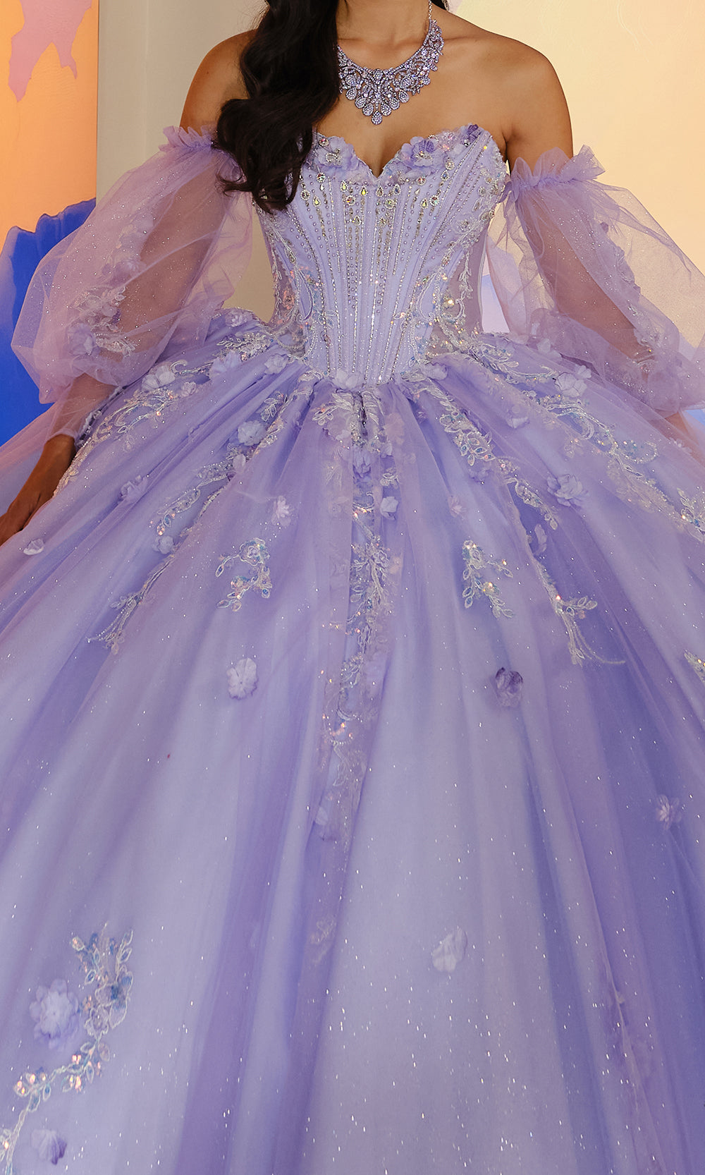 | Details: | Strapless, Corset Bodice, 3D Floral Appliques, Embroidery, Beaded, Sequin, Pockets, Detachable Back Bow, Detachable Off- Shoulder Straps, Separate Three-Quarter Balloon Sleeves |