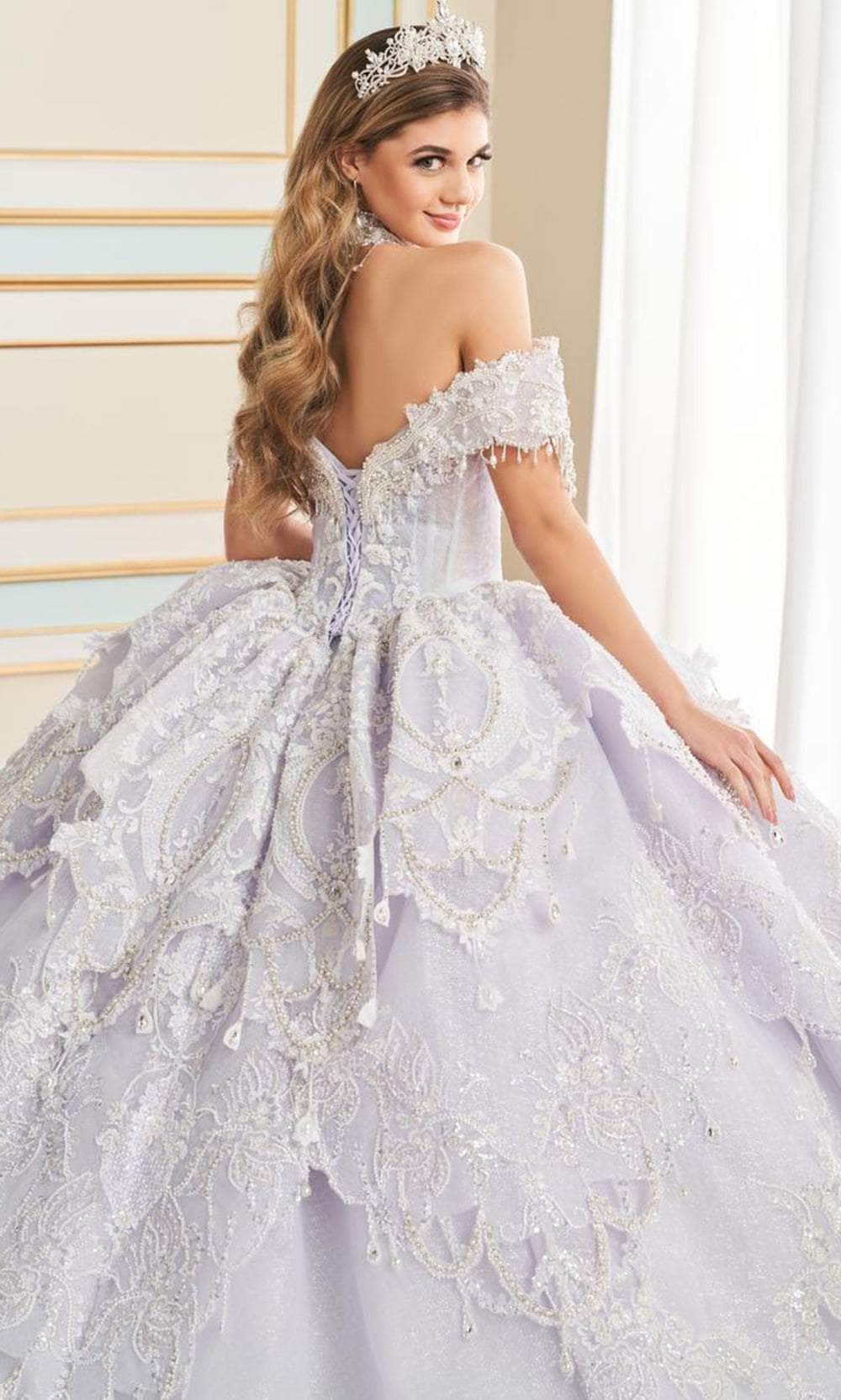 Walk in a defined sophistication and beauty with this stunning Princesa by Ariana Vara PR70101 gown. This beautiful ball gown features a sweetheart neckline and an off-the-shoulder design, adorned with delicate appliques, shimmering sequins, and sparkling stone accents that create a captivating look. Crafted from layers of glitter tulle and organza, the gown exudes a magical glow with every step. The Basque waistline adds a flattering shape, while the detachable off-the-shoulder straps provide versatile styling. Complete with a matching necklace and a skirt hoop for added volume, this Princesa by Ariana Vara PR70101 ensures a showstopping entrance on your special day. Model is wearing Frosted Lavender color.