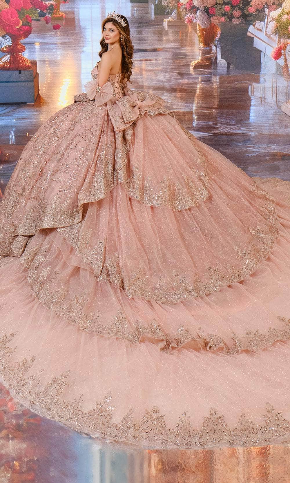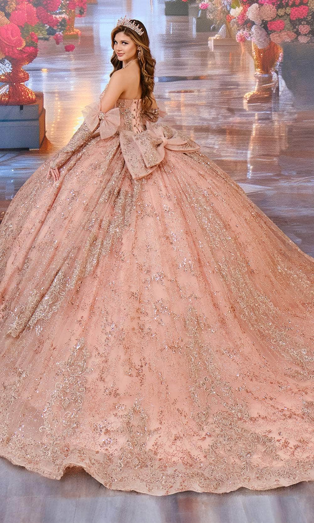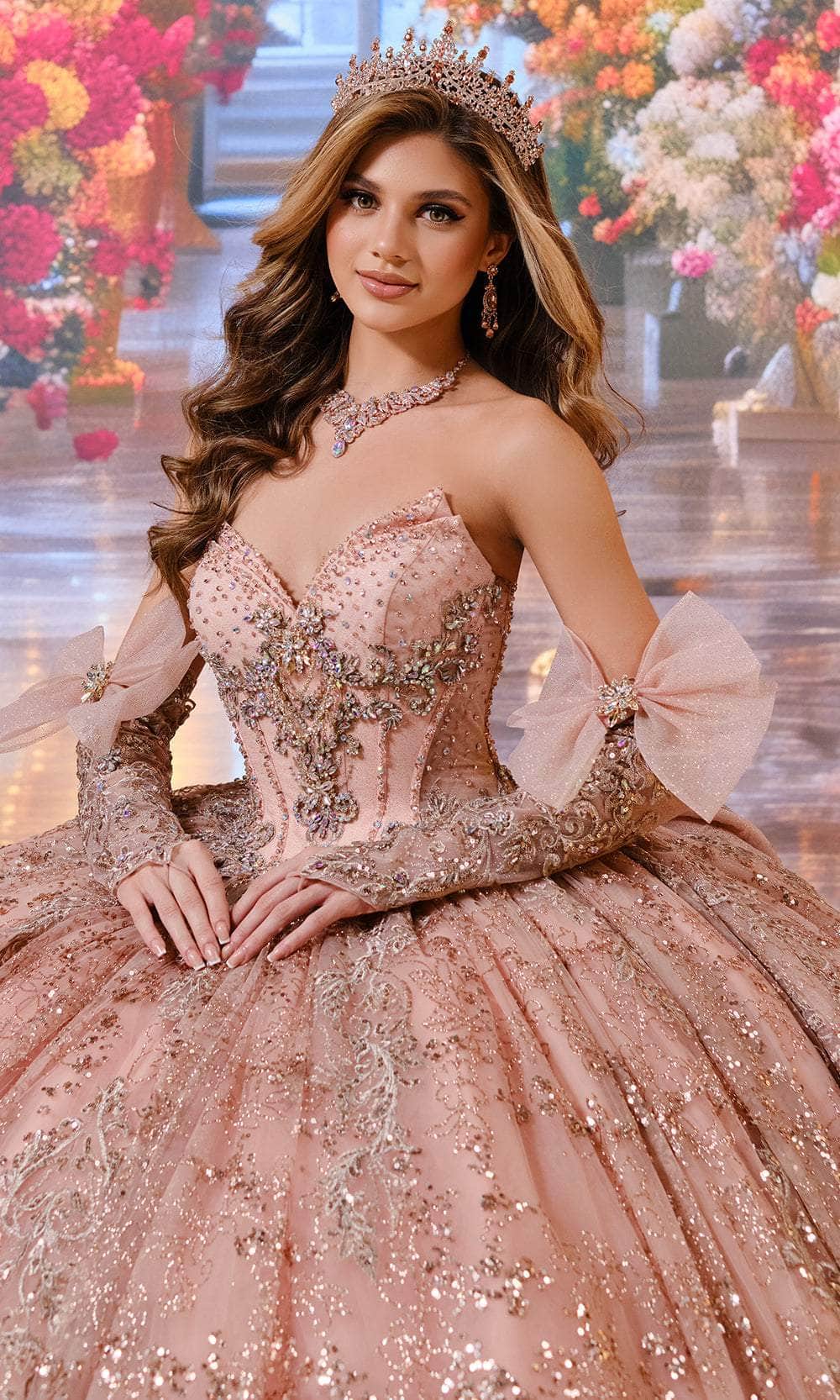 Introducing the Princesa by Ariana Vara Style PR70104, a gown designed to make you the center of attention. This strapless ballgown features a v-neckline and a Basque waistline that accentuates your figure. The combination of cracked ice fabric, shimmering metallic lace applique, beaded and sequins creates a dazzling effect. Enhance your look with the detachable train, separate sleeves adorned with feminine bow accents, and a matching capelet. The detachable bow and sparkling rhinestone corset tie add the perfect finishing touches. Choose the Princesa by Ariana Vara Style PR70104 for your special occasion and make a lasting impression. Models are wearing Rose Gold, and Red/Gold colors.