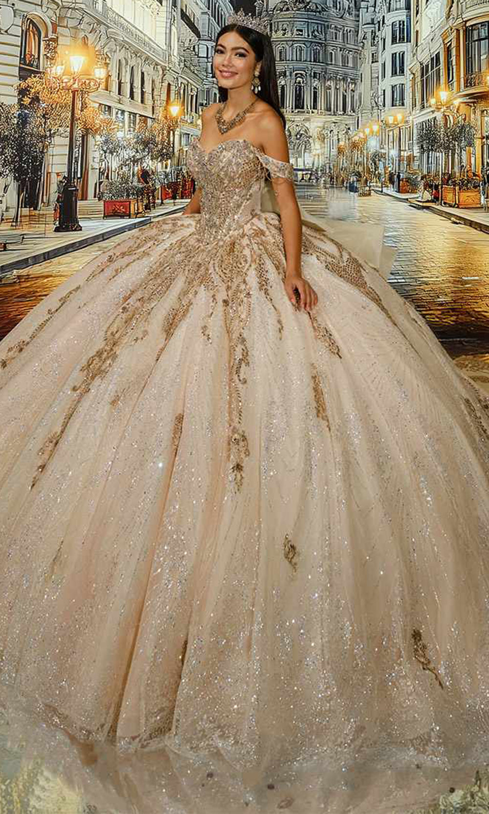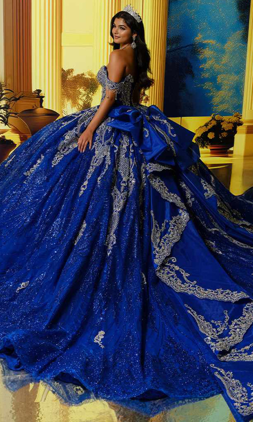 Princesa PR30224 captures attention with its dazzling brilliance and masterful design. Made from cracked ice fabric, it gleams with a reflective shimmer enhanced by metallic lace applique, sequins, and intricate beadwork. The detachable back bow and off the shoulder straps add versatility, allowing you to personalize your regal look. A modesty panel and capelet balance elegance with coverage, creating a harmonious ensemble. Perfect for milestone celebrations, Princesa PR30224 transforms each step into a display of elegance and poise. Models are wearing Royal/Silver, and Diamond Champagne/Gold colors.