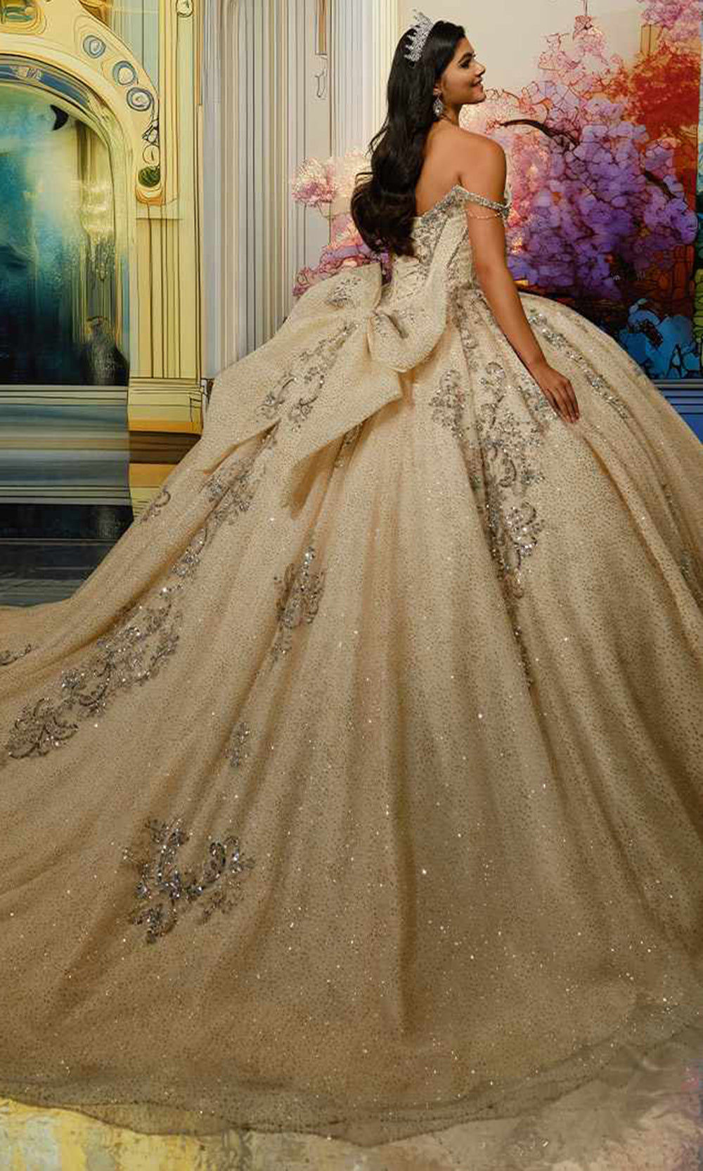 | Fabric: | Cracked Ice, Lace Applique, Sequin, Stone Accents, Beading & Crinoline |