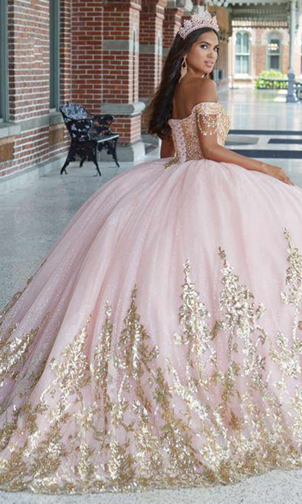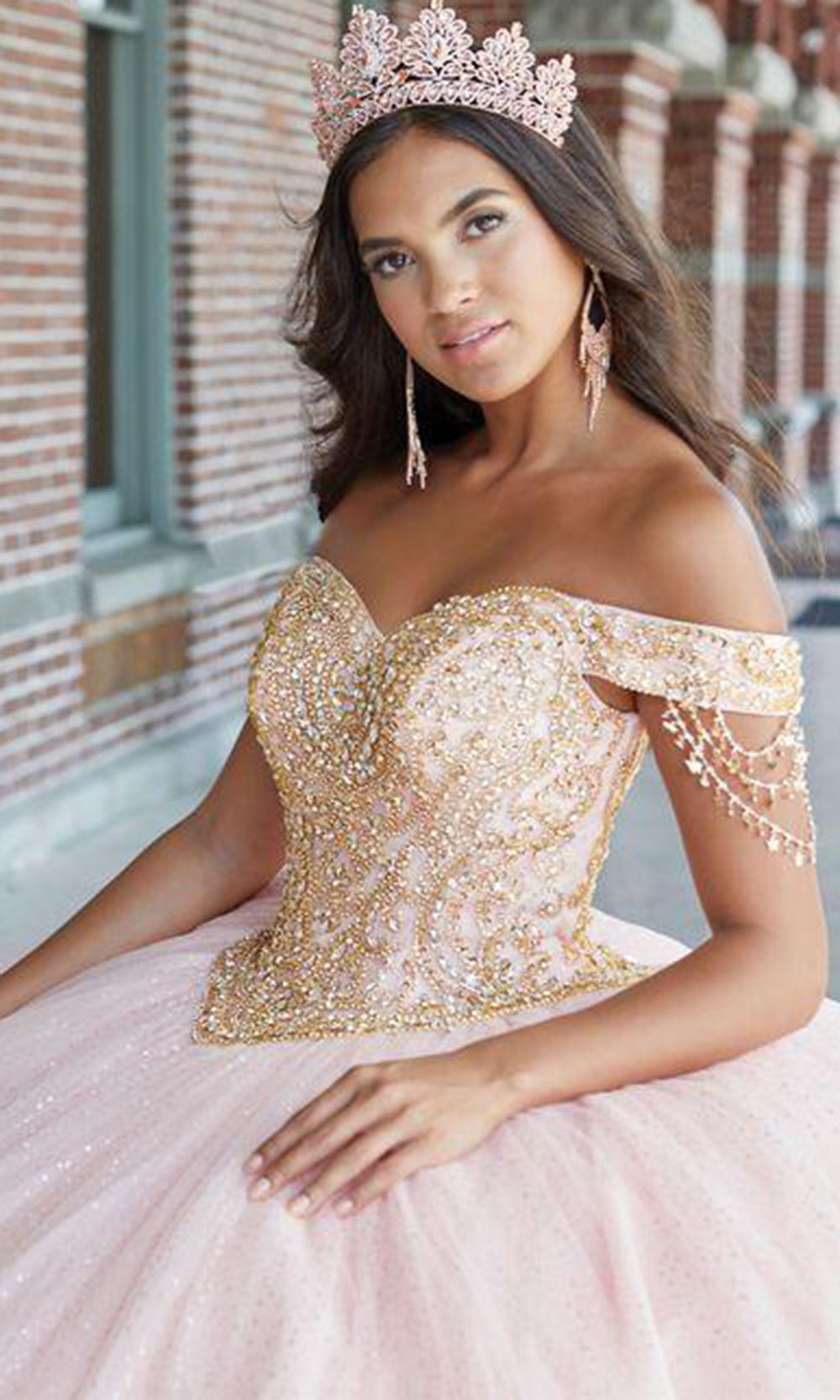 Elegant and effervescent, this dazzling quinceanera dress by House of Wu 26044 is a glamorous choice for your next special event. Achieve the next level of elegance as you wear this piece that features a fully beaded bodice with an off-shoulder neckline and butterfly detailing chain on the sleeves. The voluminous tulle ball gown skirt has train and lace appliques details. Orchestrate a spectacular evening of dazzling sophistication in this luxurious House of Wu 26044 creation. The model is wearing a Blush Gold color.