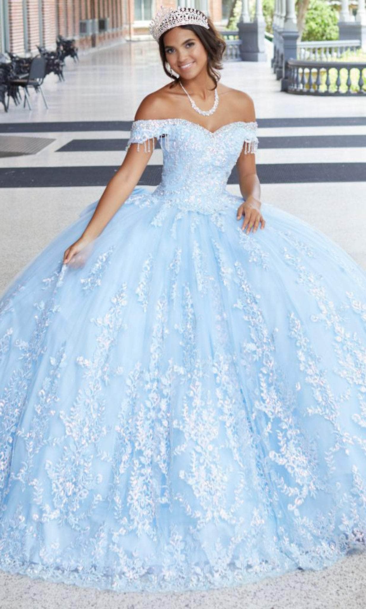 Surround yourself in limelight with this illustrious quinceanera dress by House of Wu 26045 creation. Sizzle all night as you wear this piece with an off-shoulder neckline and beaded fringes on the edge of the sleeves on its fully beaded bodice. The tulle ball gown skirt has lace appliques and finishes off with a train. This dress packs a stylish punch with color and sparkle that is fit for royalty! Design by House of Wu 26045 creation. Models are wearing Sky Solid, Wine/Gold, and Yellow Solid colors.