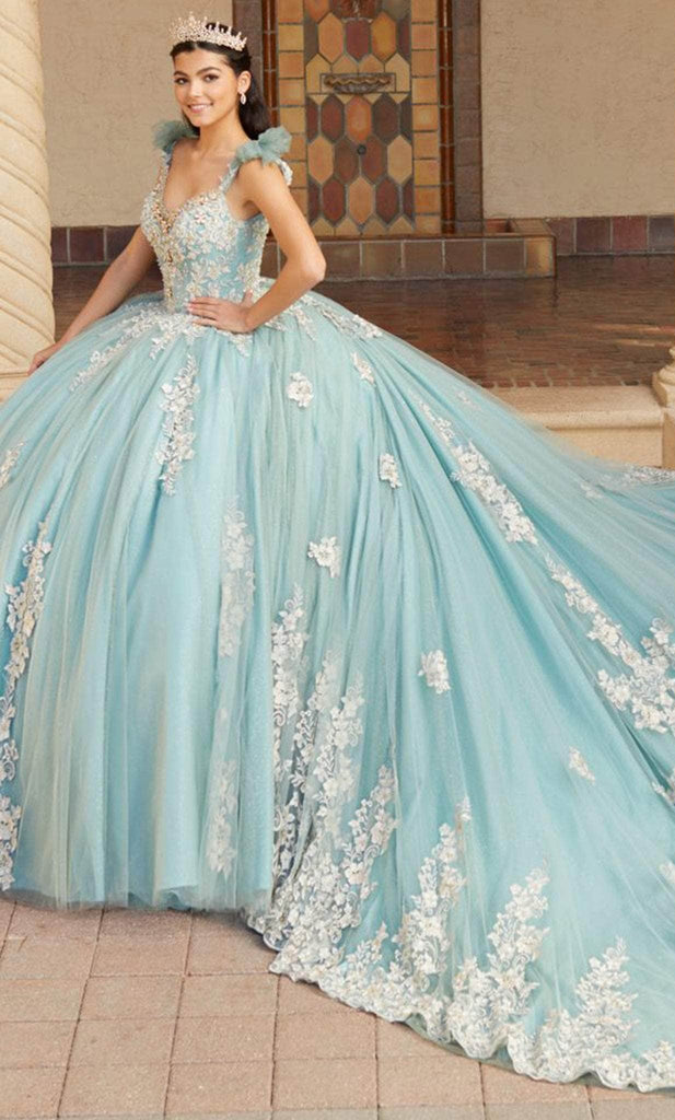 Experience a touch of elegance and a hint of playfulness with Quinceanera Collection 26059. A stunning ball gown featuring an off-the-shoulder V-neckline with ruffle details that can be styled on or off-the-shoulder. The bodice is decorated with delicate embroidered floral lace and intricate floral beaded rhinestone accents around the neckline and center front. The lace extends past the natural waist and flows down the sparkling tulle ball gown skirt, finished with a lace-up back and a royal train that adds the perfect finishing touch to this breathtaking design. Radiate confidence with this Quinceanera Collection 26059. Models are wearing Dusty Rose and Champagne and Seafoam and Champagne colors.