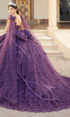 Flutter with elegance and grace in the exquisite Quinceanera Collection 26062 gown. Let the enchanting butterfly lace and detachable cape add a touch of magic to your special day. This piece boasts a V off-the-shoulder neckline with three-dimensional straps and a corset illusion bodice that will leave you in awe. The butterfly lace embroidery covers the bodice and ballgown skirt, while the lace-up back, tulle panels, and oversized detachable bow add an extra touch of glamour. Make your special event a moment to remember with Quinceanera Collection 26062 masterpiece. Models are wearing Aqua, Plum, and Rose colors.