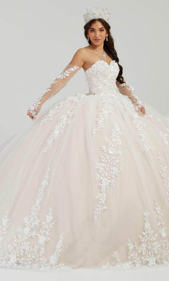 Look jaw dropping in this dramatic House of Wu 26070 for your quinceneara or prom! Enchanting in a ballgown silhouette, this number is embellished with dainty 3d floral appliques forming leafy foliage on a sheer overlay. The detailed bodice offers a cinched waist and a strapless sweetheart neckline, while the dramatic skirt flows into a long chapel train. This glittering House of Wu 26070 creation is perfect for a standout style and flawless fit. Models are wearing Ivory/Champagne, and Meadow colors.