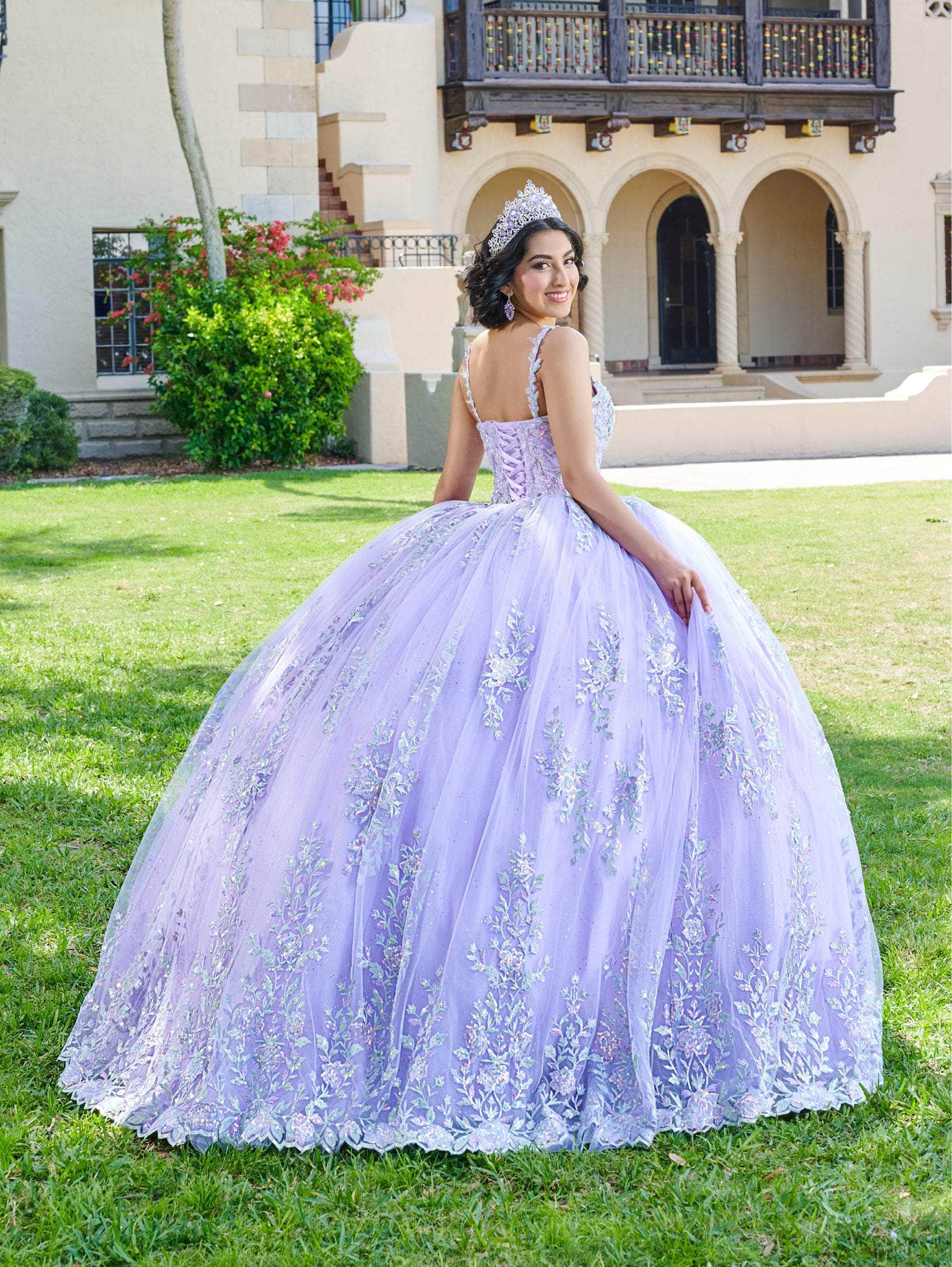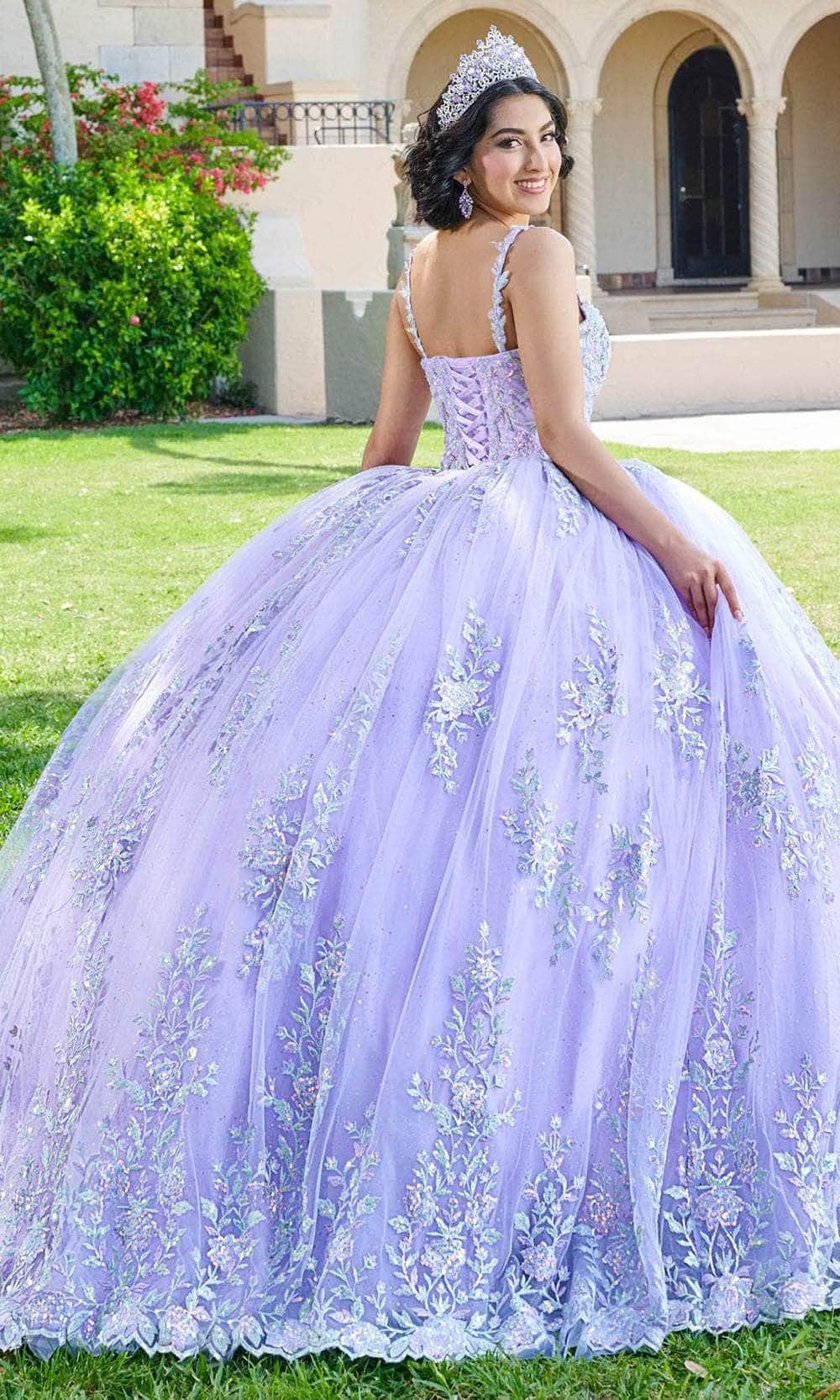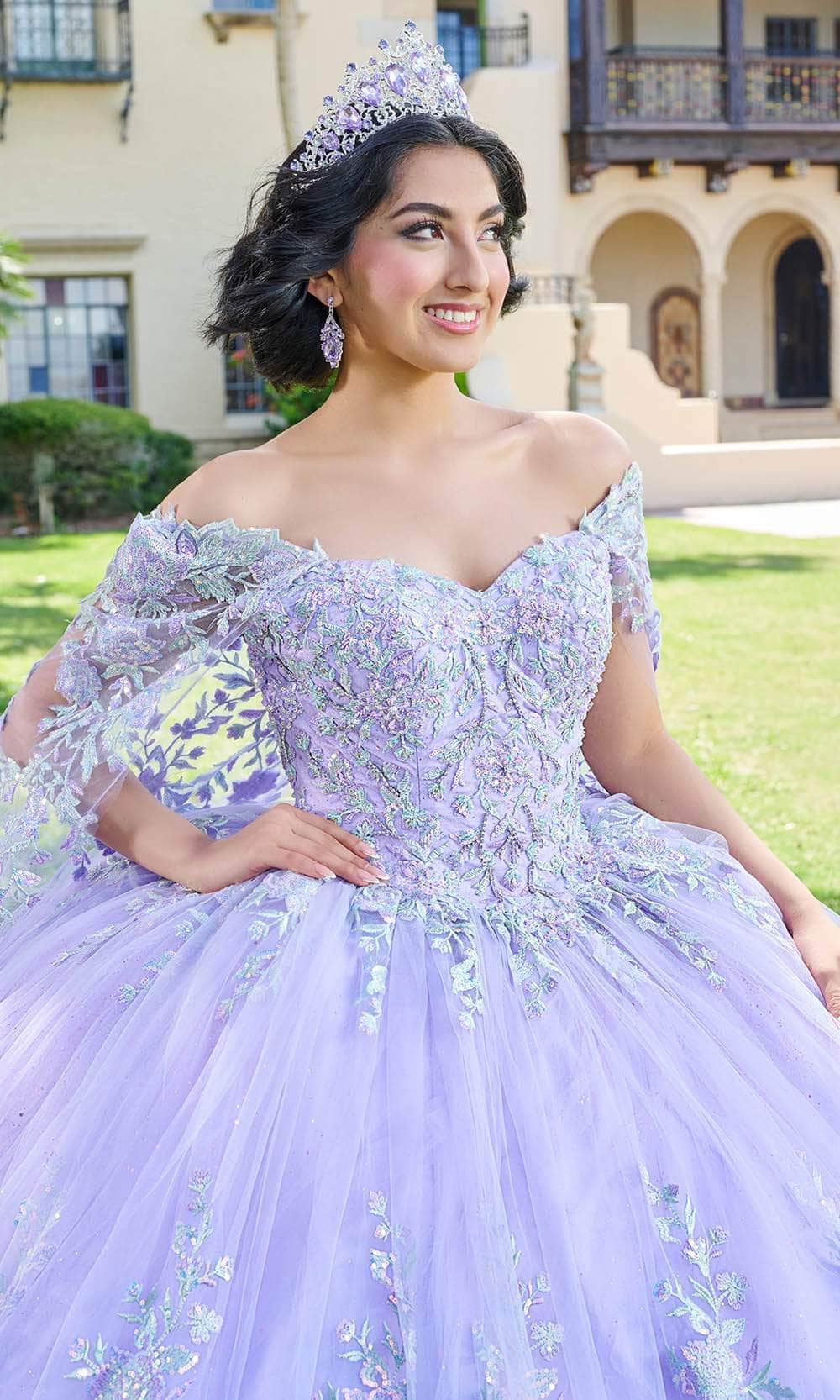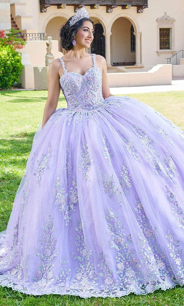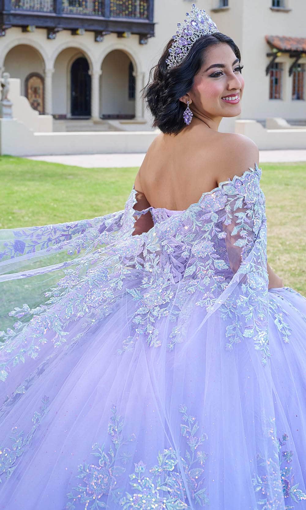 Make a statement with the Quinceanera Collection by House of Wu 26074, showcasing a captivating ballgown. The sweetheart neckline, paired with delicate spaghetti straps covered with lace, beautifully frames the beaded bodice, exuding a timeless allure. Adorned with a matching lace/tulle cape, this ensemble creates an ethereal and enchanting effect. Multiple layers of tulle in the ball gown skirt, along with a lace hem border, create an enchanting silhouette, finished with a lace-up back and sweep train. Quinceanera Collection by House of Wu 26074 you may experience an enchanted world. Models are wearing Lilac Multi and Sky Multi colors.