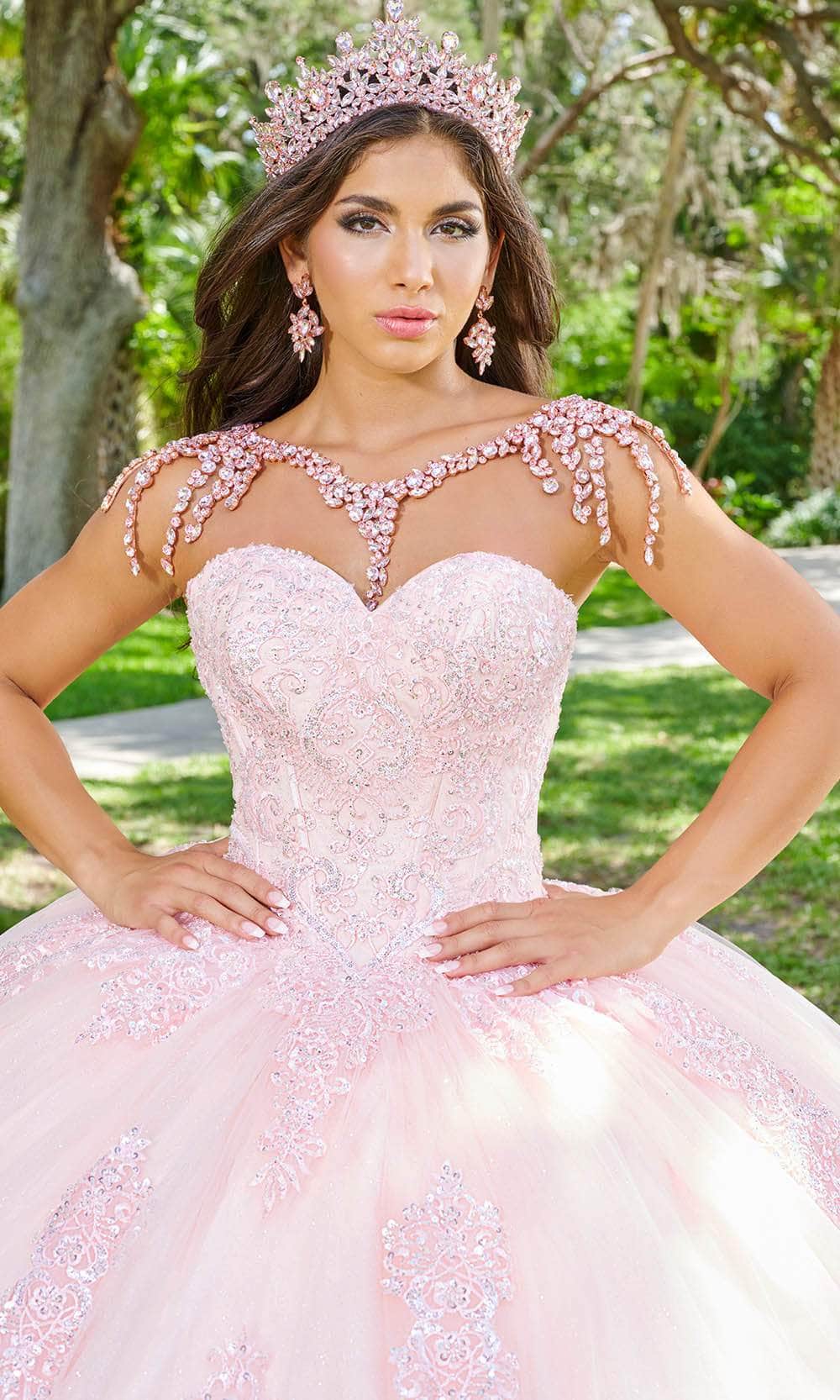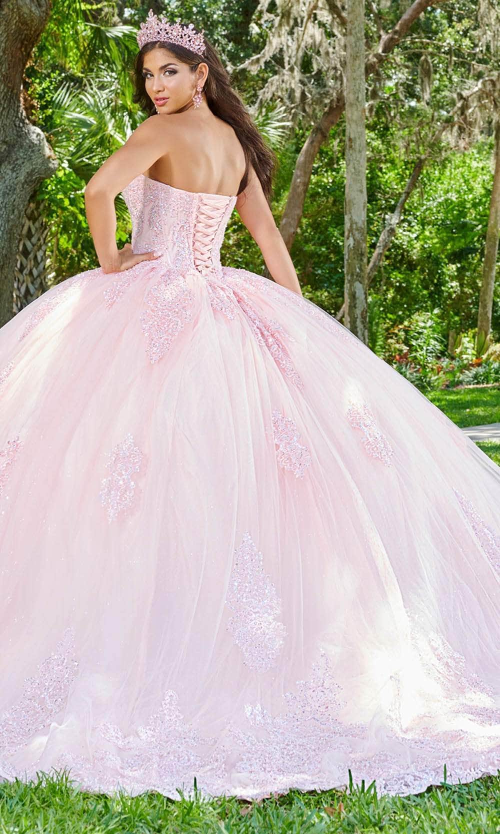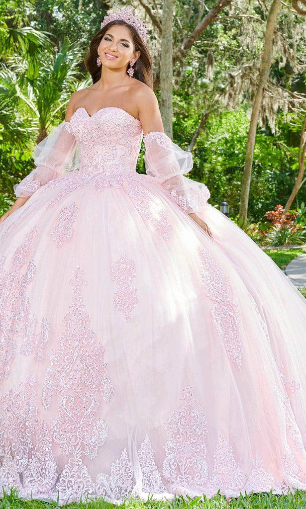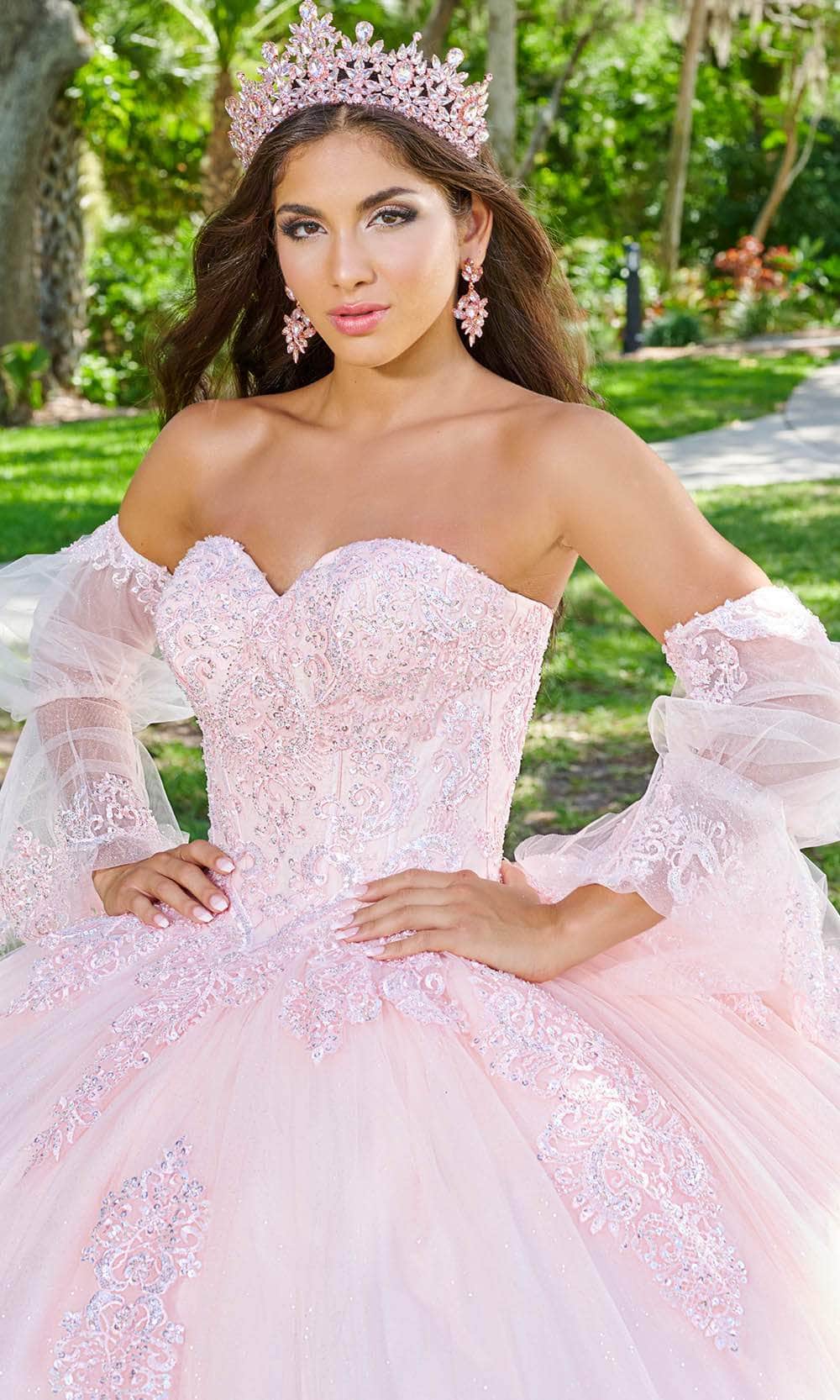 Experience enchantment with the Quinceanera Collection by House of Wu 26076, a breathtaking strapless ballgown. The Sweetheart neckline accentuates the grace of this ensemble, enhanced by the detachable puffy sleeves for a touch of timeless elegance. The princess ball gown skirt, adorned with intricate bead embroidery border hem, adds a regal charm. With a lace-up back and a train, this Quinceanera Collection by House of Wu 26076 ensures a captivating and memorable entrance for your special occasion. Model is wearing Blush Silver color.