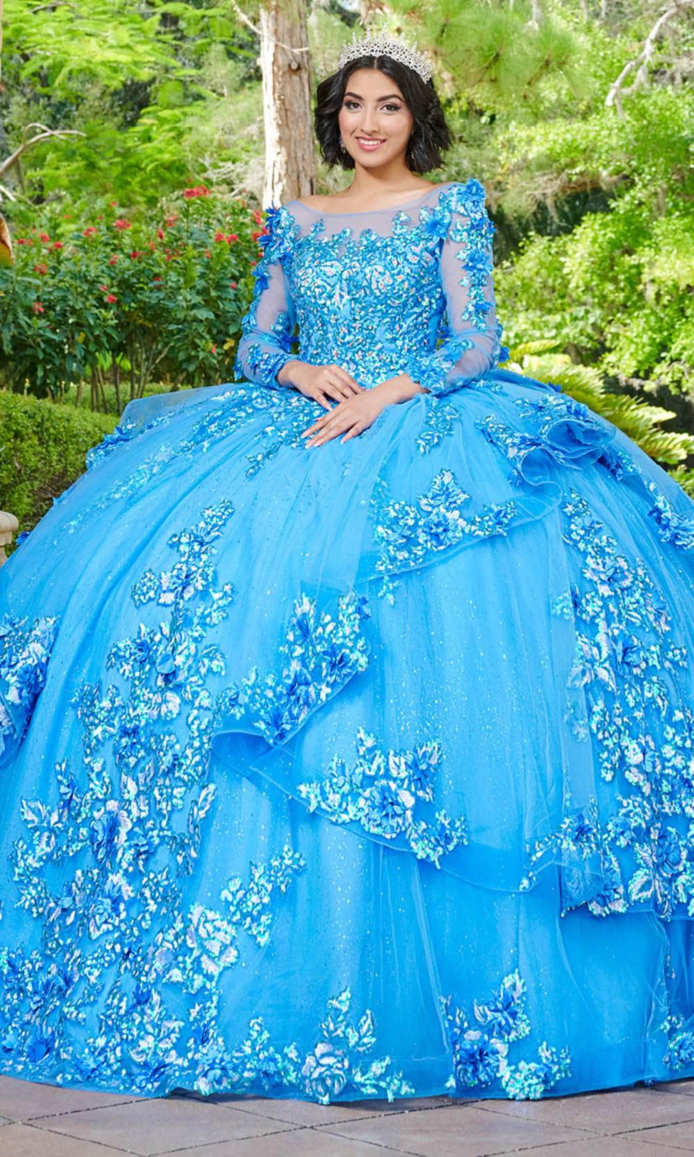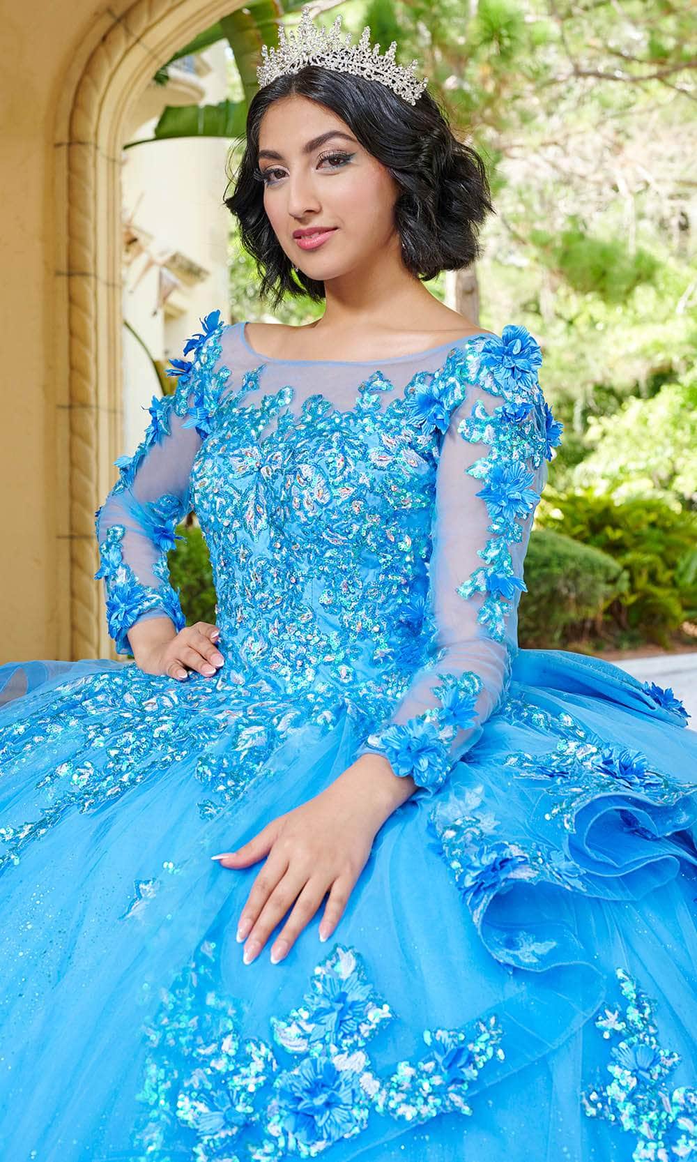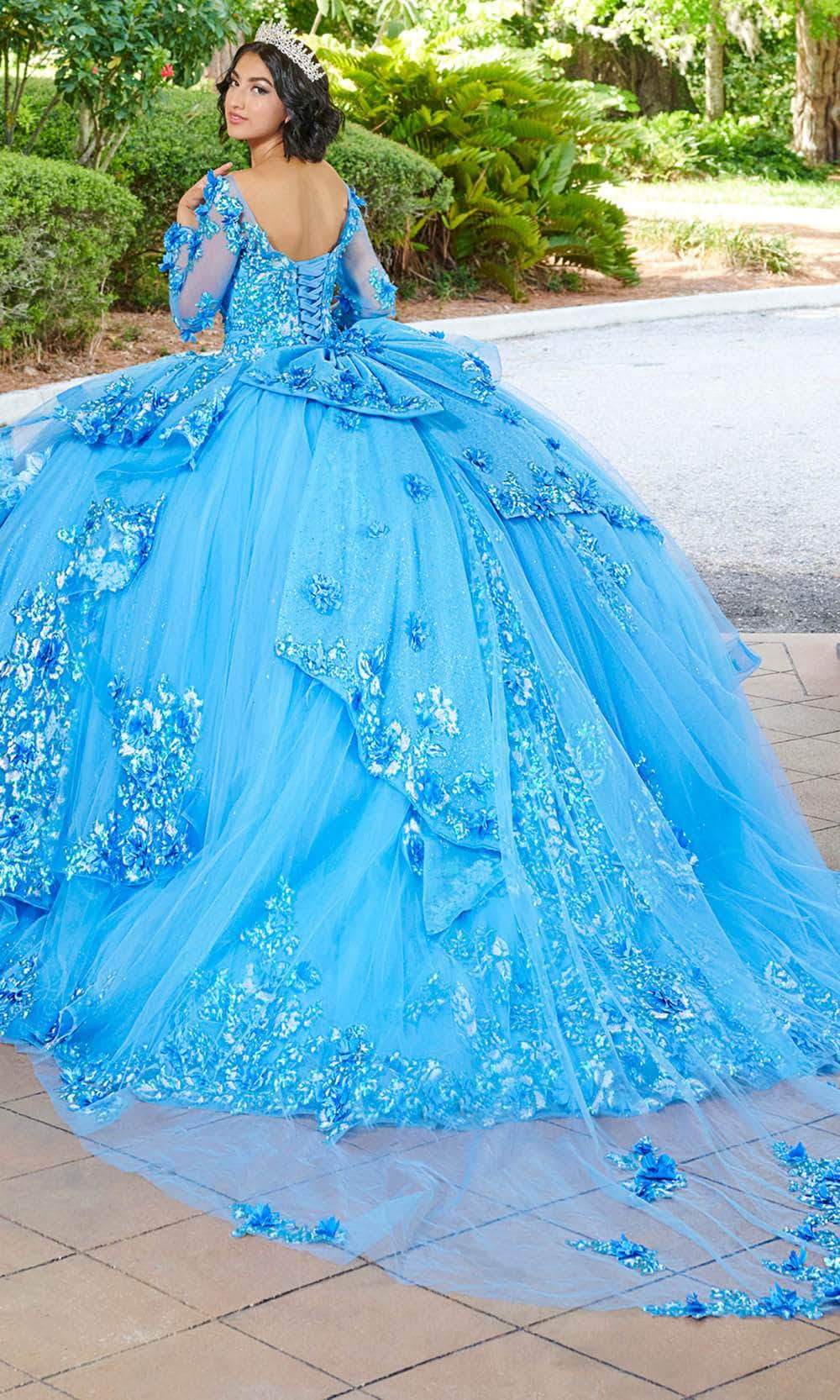 Sophistication meets enchantment in every detail of the mesmerizing Quinceanera Collection by House of Wu 26082. Featuring a captivating ballgown with a Bateau Illusion neckline, adorned with intricate lace appliques and elegant long sleeves, exudes timeless grace and sophistication. The ball gown skirt, enhanced with back ruffle detail and a charming bow accent, creates an ethereal and enchanting effect, complemented by the sheer train. With a lace-up back. Embrace the enchanting allure Quinceanera Collection by House of Wu 26082. Model is wearing Montego Blue color.