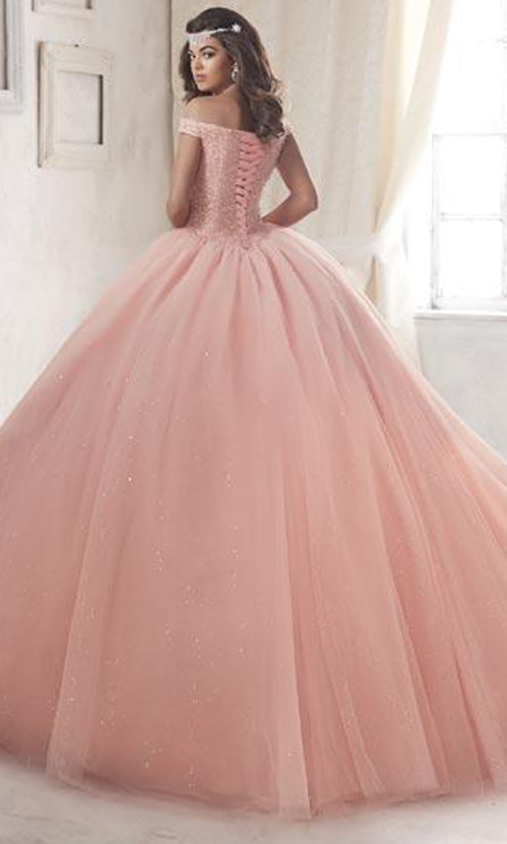 Infuse your special event with stellar style in this glimmering stylish gown from Quinceanera Collection 26844. This gorgeous gown is bursting with impeccable details with its densely sequined and beaded bodice that features an off-shoulder neckline and lace up back. The full ball gown skirt splays down in brilliant displays of beaded and sequin tulle layers, with a sparkle tulle layer underneath. This gown finishes with a splendid train. This gown by Quinceanera Collection is ideal for the lady in the making who wants to exude classic sophistication while living out her modern-day fairytale. Model is wearing the Rose Petal color.