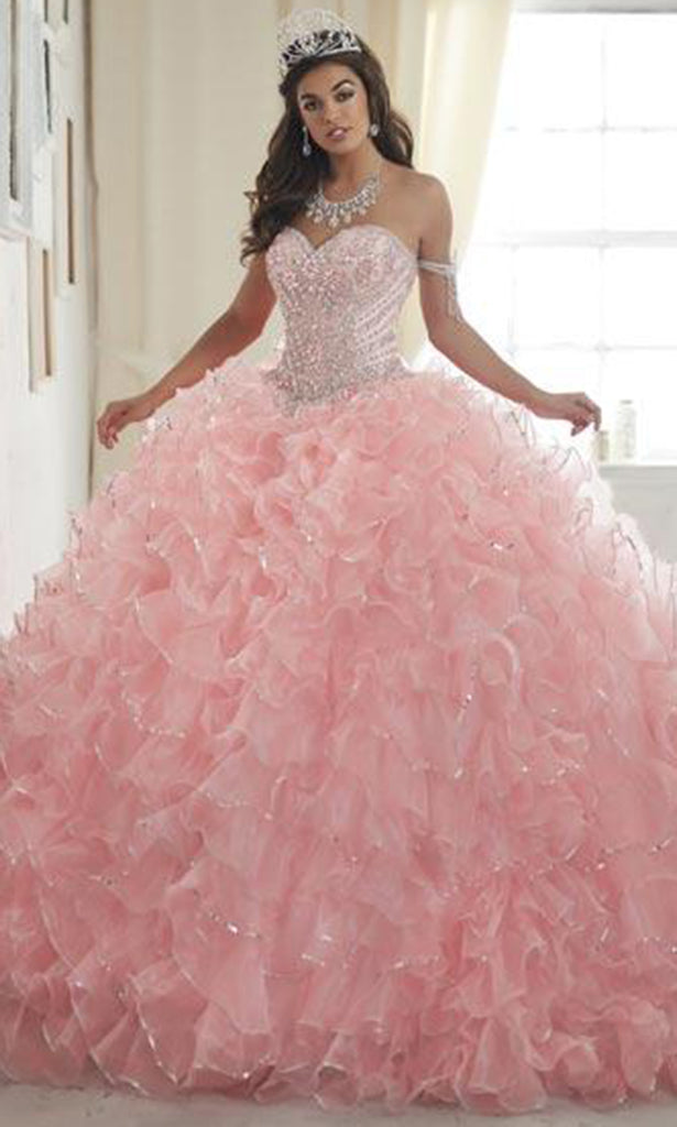 Charm everyone by your sheer femininity as you sparkle with beauty when you celebrate wearing this impeccable ballgown from Quinceanera Collection 26845. This strapless dreamy elegance features a pronounced sweetheart neckline and flattering lace up back, and bodice lavishly festooned with crystal bead accent. The voluminous skirts flow effortlessly with layers of ruffled iridescent organza trimmed with sequin edges. Have confidence that your grand entrance will be everything it deserves to be when you wear this Quinceanera Collection ballgown.