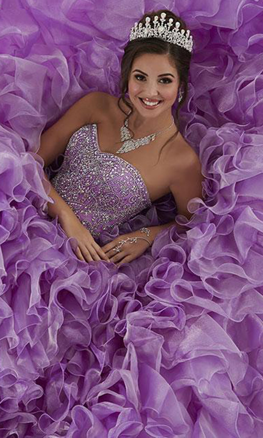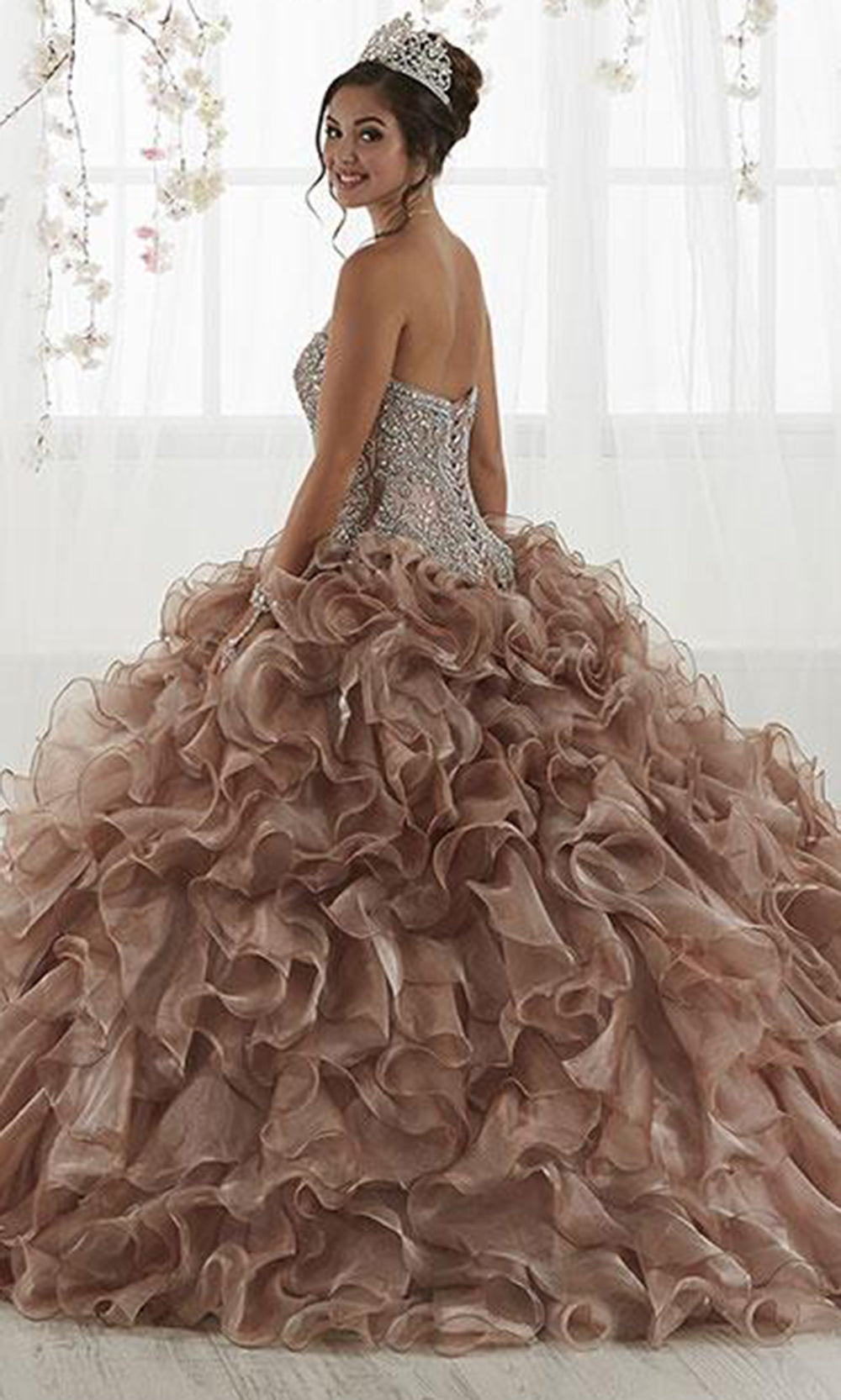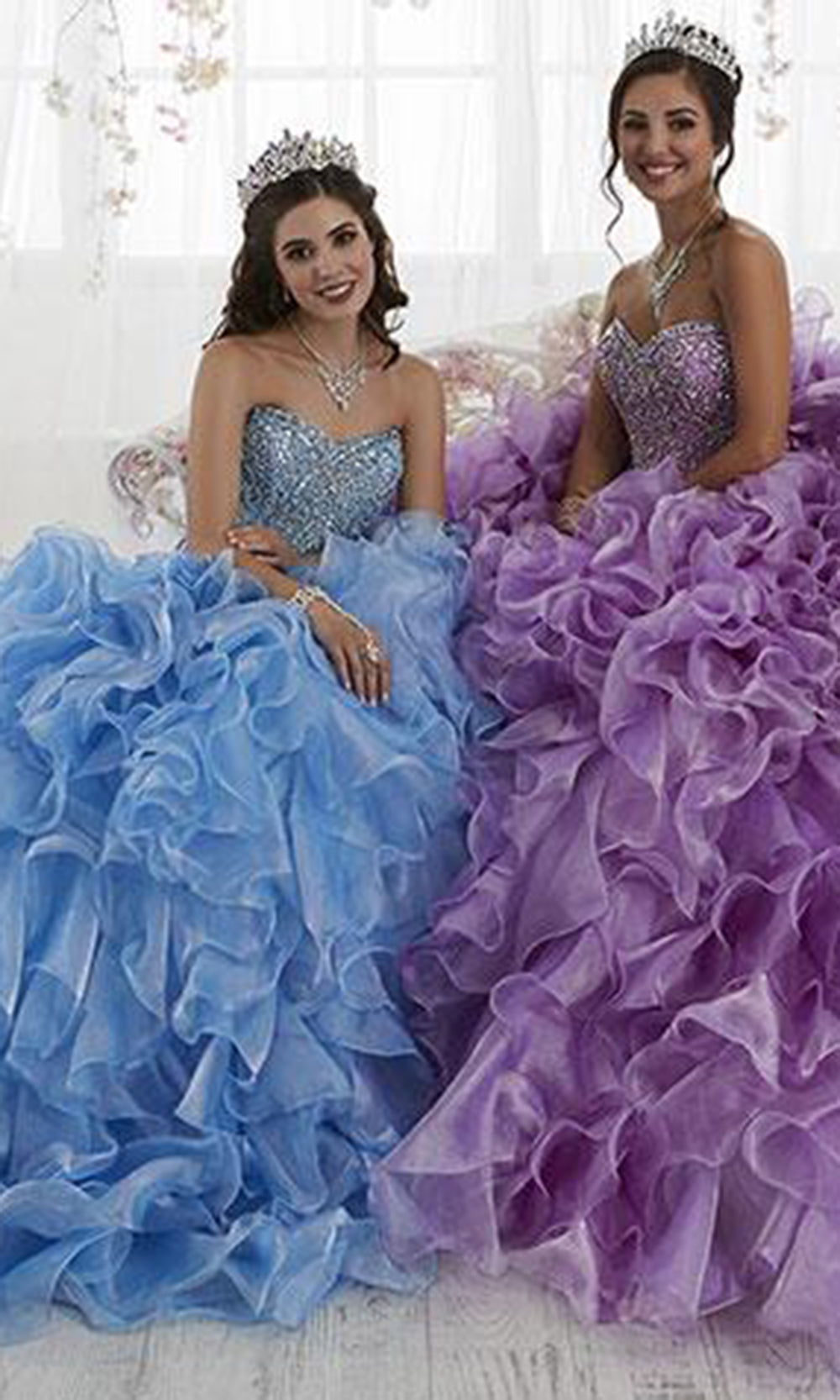 Look every bit like a dream in this fascinating Quinceanera Collection 26924 creation. Exquisitely studded with iridescent rhinestones on a corset-boned bodice, this dazzling piece reveals a strapless sweetheart neckline paired with a lace up open back. Gorgeous ruffles of organza forms its ballgown silhouette with a trailing train. Glow with an iridescence that captivates in this Quinceanera Collection masterpiece.