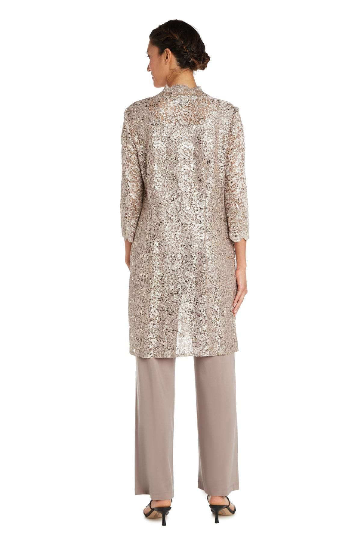 Make a stylish entrance in this masterpiece from R&M Richards 1993p. Decorated with luxurious metallic lace, this elegant three-piece set includes a sleeveless top with a scoop neckline and wide shoulder straps that drop to the midrise scoop back. Additionally, the quarter-length jacket features scalloped edges and an open front that adds an extra layer of charm. The bottom has a pair of straight pants that glides to the full-length hemline. This &M Richards 1993p style is perfect for special occasions or evening events. Model is wearing Champagne color.