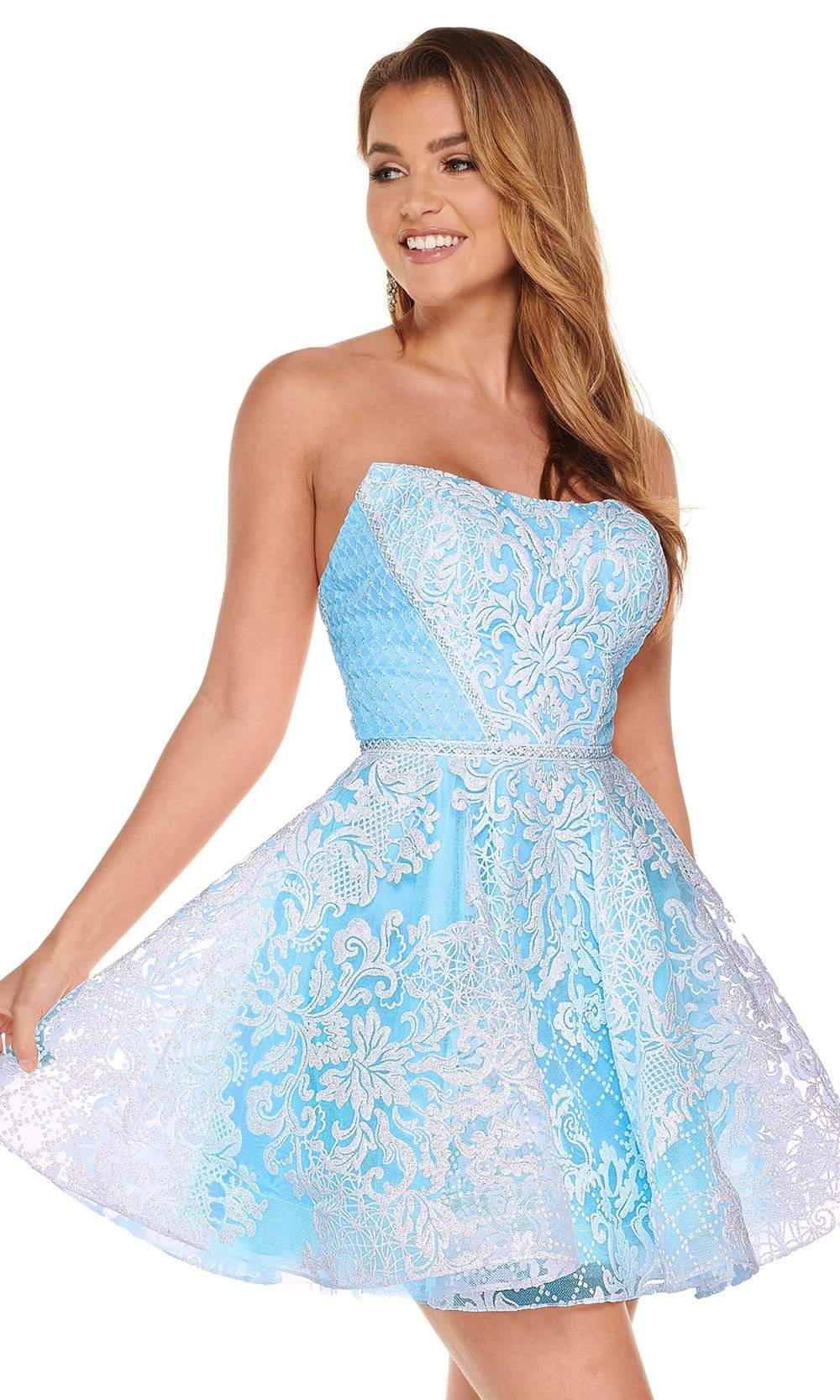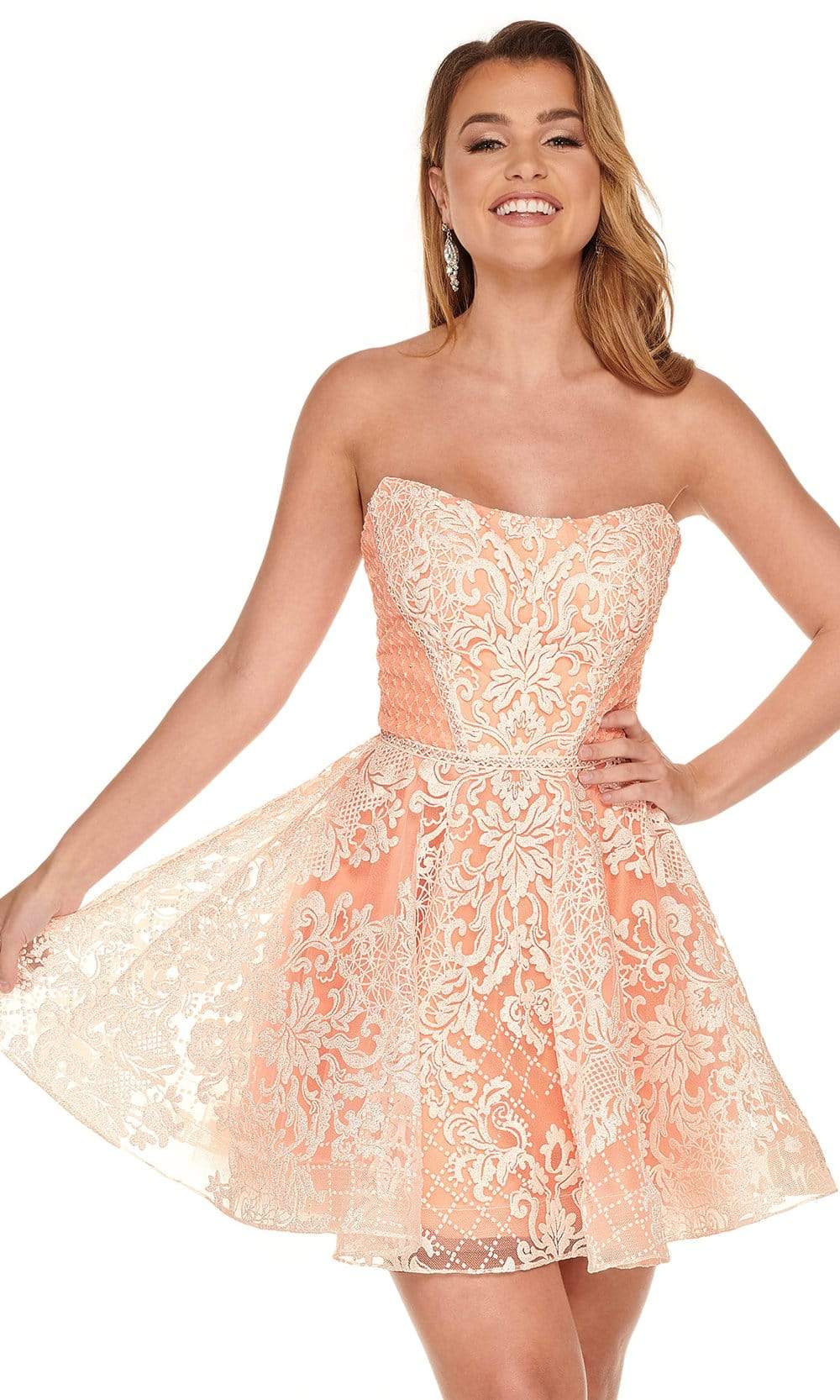 Show off your classy style when you wear this cocktail dress by Rachel Allan 40062. This oh! so pretty and classy fit and flare, glitter patterned tulle dress showcases a strapless bateau neckline with mid-open back, fitted bodice and an A-line silhouette, lined mini-skirt. This design by Rachel Allan is perfect for a standout style and flawless fit for an remarkable Homecoming.