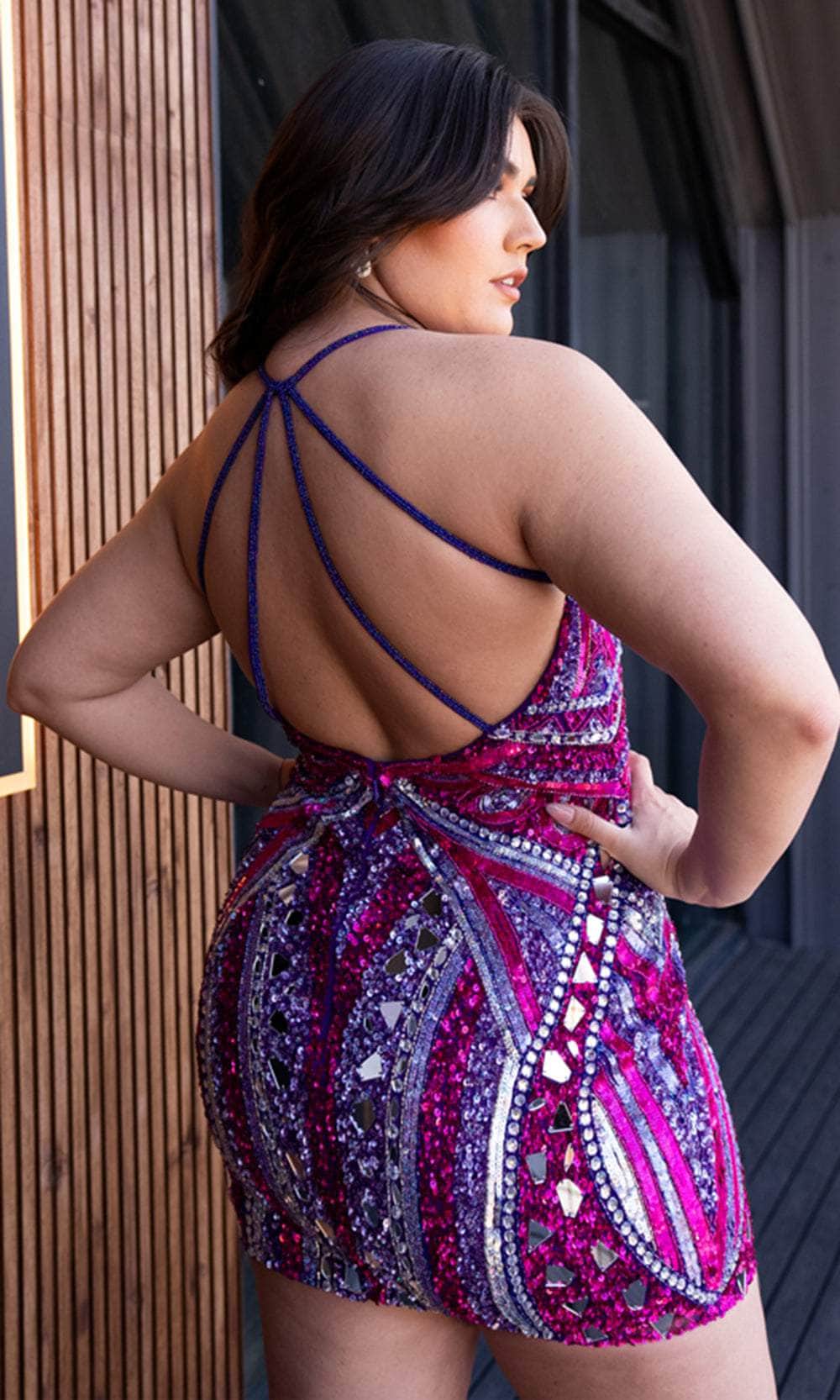 Dress to impress in the Rachel Allan 40403 masterpiece. This sleeveless dress is festooned with geometric patterns of beaded and sequins, combined with cut-glass mirrors that catch the light from every angle. Features are the appealing deep v-neckline, and spaghetti straps that produce a strappy design in the open back. The skirt molds a sheath silhouette that flatters your figure and finishes with a sexy short hemline. This Rachel Allan 40403 dress is guaranteed to elevate you as the star of the party! Models are wearing Black Multi, Lime Multi, Purple Multi, and Royal Multi colors.