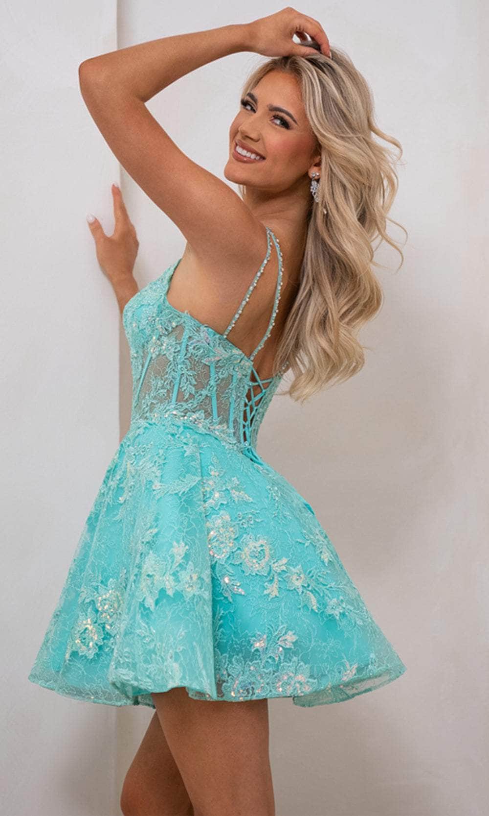 Capture that striking presence Rachel Allan 40430 is a captivating dress adorned with intricate embroideries and sparkling sequins. The sleeveless sheer corset bodice showcases a plunging V-neckline, while a lace-up tie at the back ensures a perfect fit. Complementing the bodice, the short-length A-line silhouette skirt adds a touch of playful elegance. This exquisite Rachel Allan 40430 is designed to dazzle, making it an ideal choice for any special occasion where you want to shine. Models are wearing Light Blue and Aqua colors.