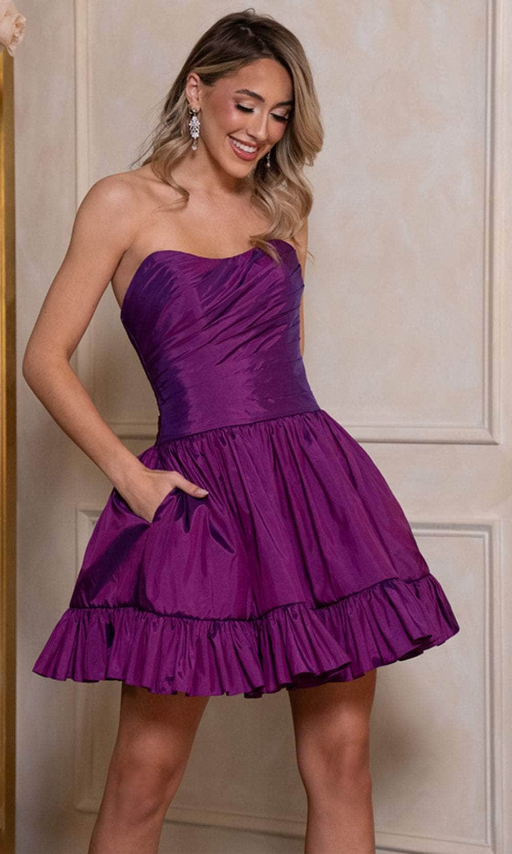 Make a statement in this must-have creation from Rachel Allan 40470. This strapless design features a romantic sweetheart neckline, and a ruched detail that draws attention to your upper body. An open back with tie closure adds a dash of allure. With a gathered natural waist, the skirt creates a beautiful A-line silhouette that stops at the mid-thigh to show off your legs. Completing the look are the ruffle tiers on the hem that bring playfulness and drama. This Rachel Allan 40470 dress is guaranteed to make you feel exceptional! Models are wearing Candy Pink, Peacock, Red, Tangerine, and Ultraviolet colors.
