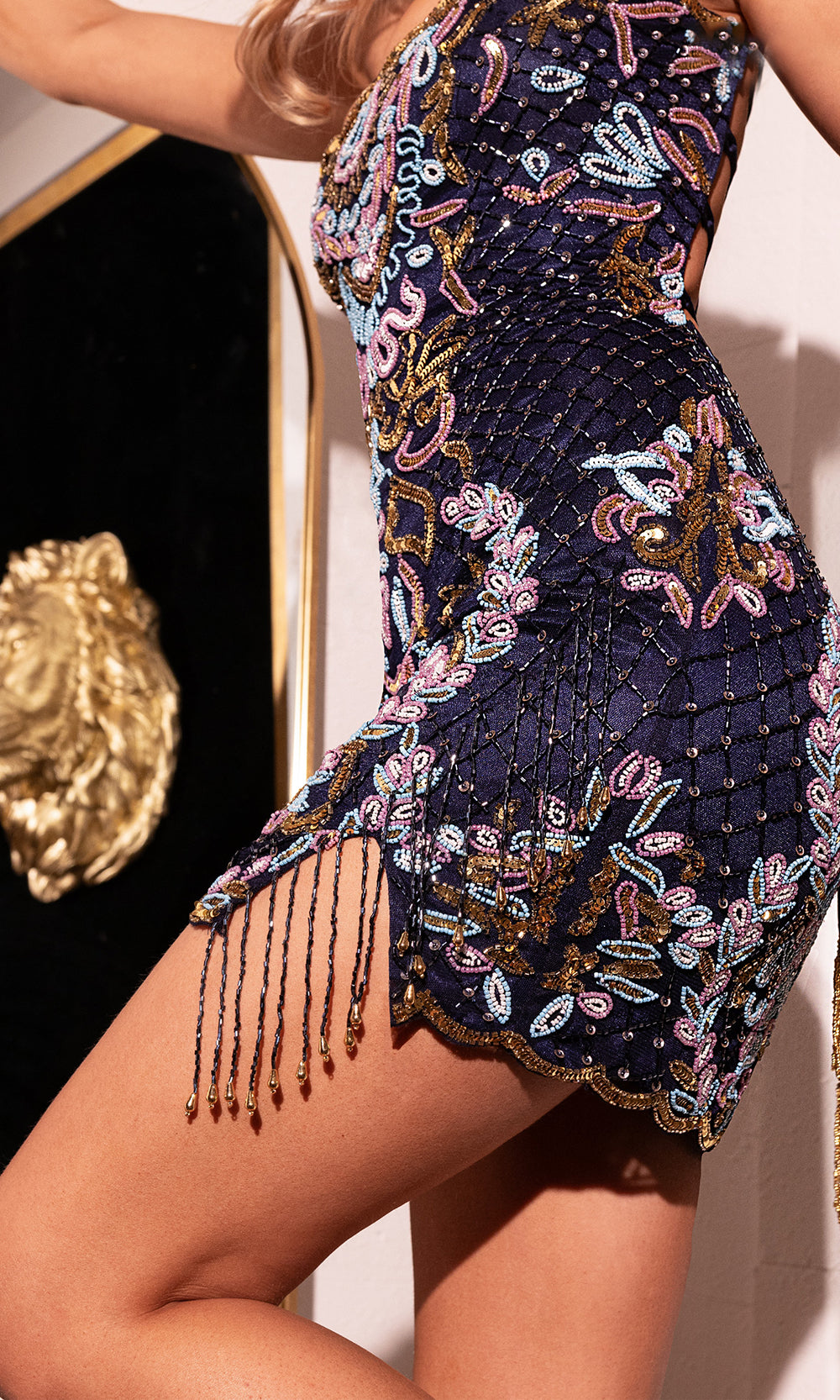 | Fabric: | Stretch Tulle, Beading, Beaded Fringe |