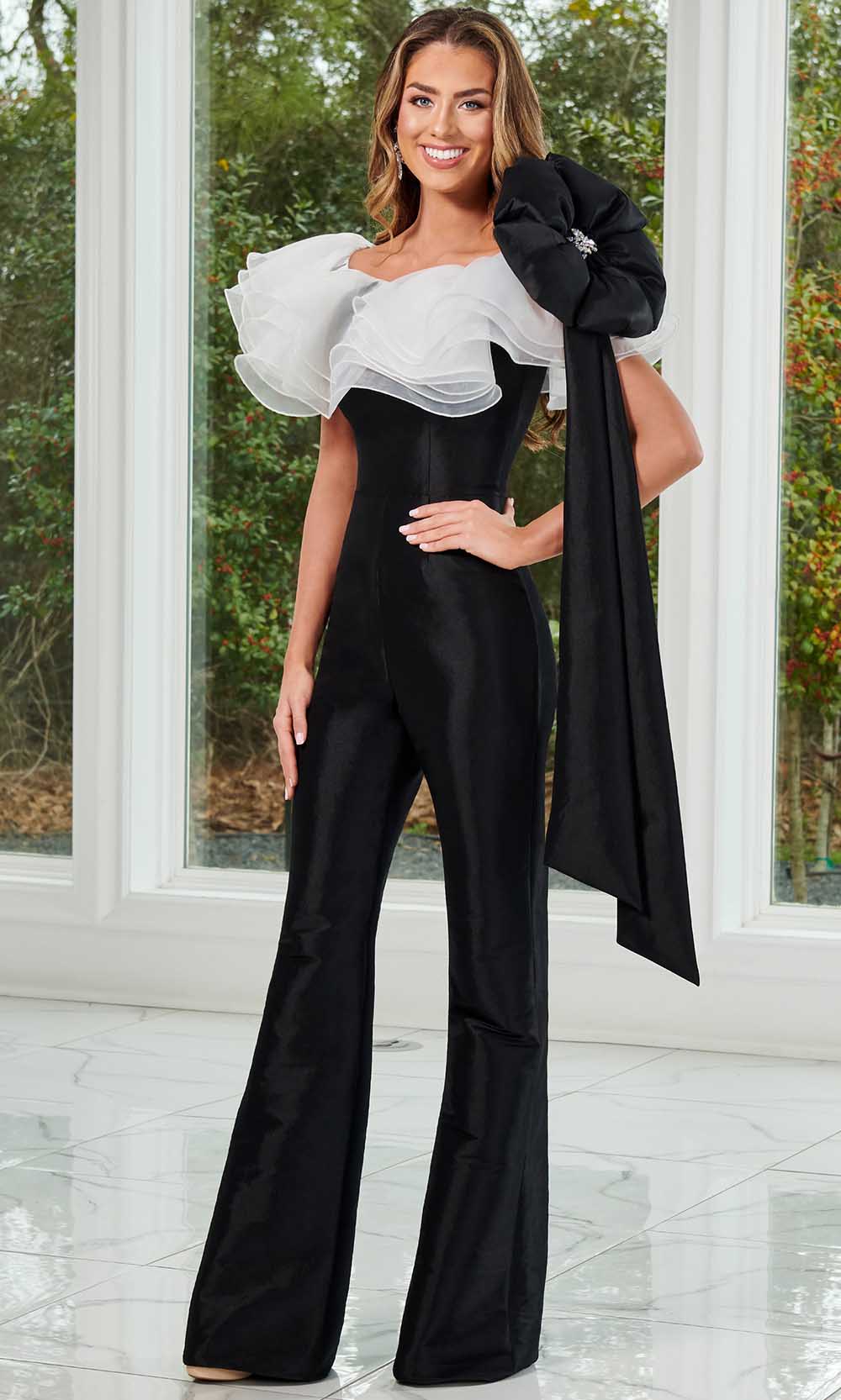 Fantasize a night of eloquent style and poise at your black-tie event while wearing this charming Rachel Allan 50171. Mesmerizes in this organza jumpsuit that offers charm and beauty as it parades an off-shoulder neckline adorned with an elegant taffeta ruffle and a bow detail is added to bring a sophisticated look. The bodice is tailored with seams and the bottom is tailored in a pair of long leg pants. This Rachel Allan will make you feel all royal and radiant looking. Models are wearing Black White, and Aqua colors.