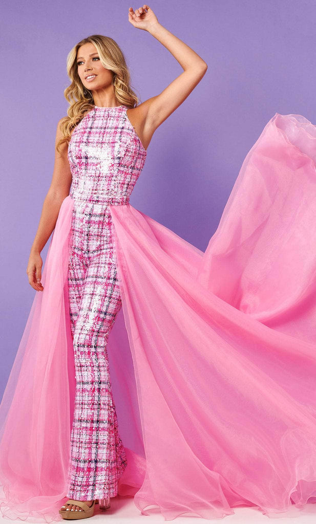 Paint a picture of pure grace as you channel your inner celebrity style with Rachel Allan 50229. Red carpet-ready in a stunning jumpsuit style, this piece is a sure standout for your nect event. Featuring colorful tartan plaid patterns, printed sequins add an interesting texture to the ensemble. The high halter neck style offers a modest look, while slightly flared pant legs make this dance-ready at all times. Achieve new heights of fashion in this exquisite evening gown by Rachel Allan 50229 Models are wearing Pink and Turquoise colors.
