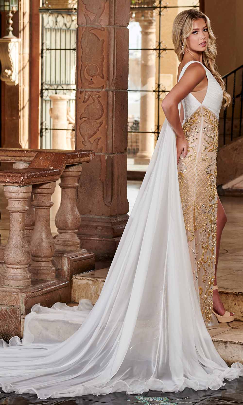 The Rachel Allan 50261 gown is a luxurious chiffon masterpiece that will make heads turn at any event. With a one shoulder neckline, ruched bodice, and high slit, this gorgeous gown is adorned with an exquisite beading pattern and stylish cape-like train on the shoulder. Perfect for pageant nights or any special occasion, this one-of-a-kind designer piece from Rachel Allan dazzles with luxury and sophistication. Models are wearing Jade, and Nude/White colors.