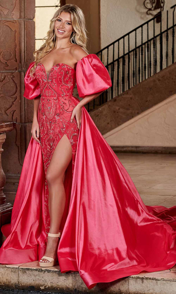 Experience elegance and glamour with the Rachel Allan 50270 Gown. Crafted from soft taffeta, this luxe dress features sparkling crystal stones and detachable bubble puff sleeves, offering you the perfect look for any special event. Its plunging neckline and high front slit show off just enough skin, while the sweeping train adds a unique touch of sophistication. Look and feel your best in this stunning gown from Rachel Allan. Models are wearing Coral, and Lilac colors.