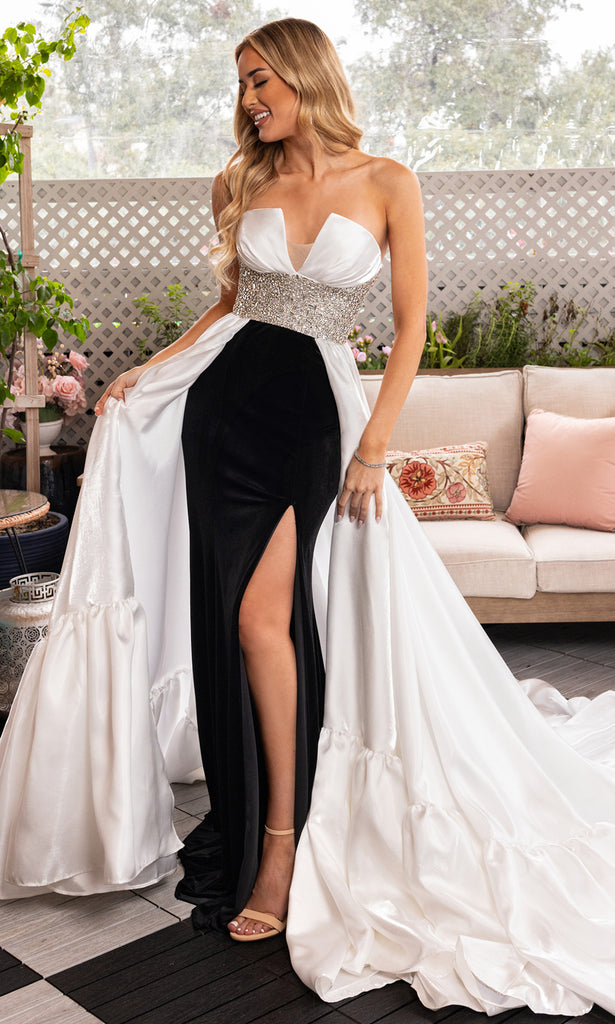 Unexpected glamour meets timeless charm in the Rachel Allan 50381, a combination of rich velvet and flowing crystal satin. The strapless v-neckline flatters the decolletage, while the glittering beadwork highlights the natural waist and mid-open back. Luxurious velvet hugs the frame, opening at the thigh for a bold slit, while an exaggerated ruffled hem overskirt adds motion and grandeur. Both structured and sweeping, the Rachel Allan 50381 is the epitome of luxury eveningwear made to captivate from every angle. Model is wearing Black White color.