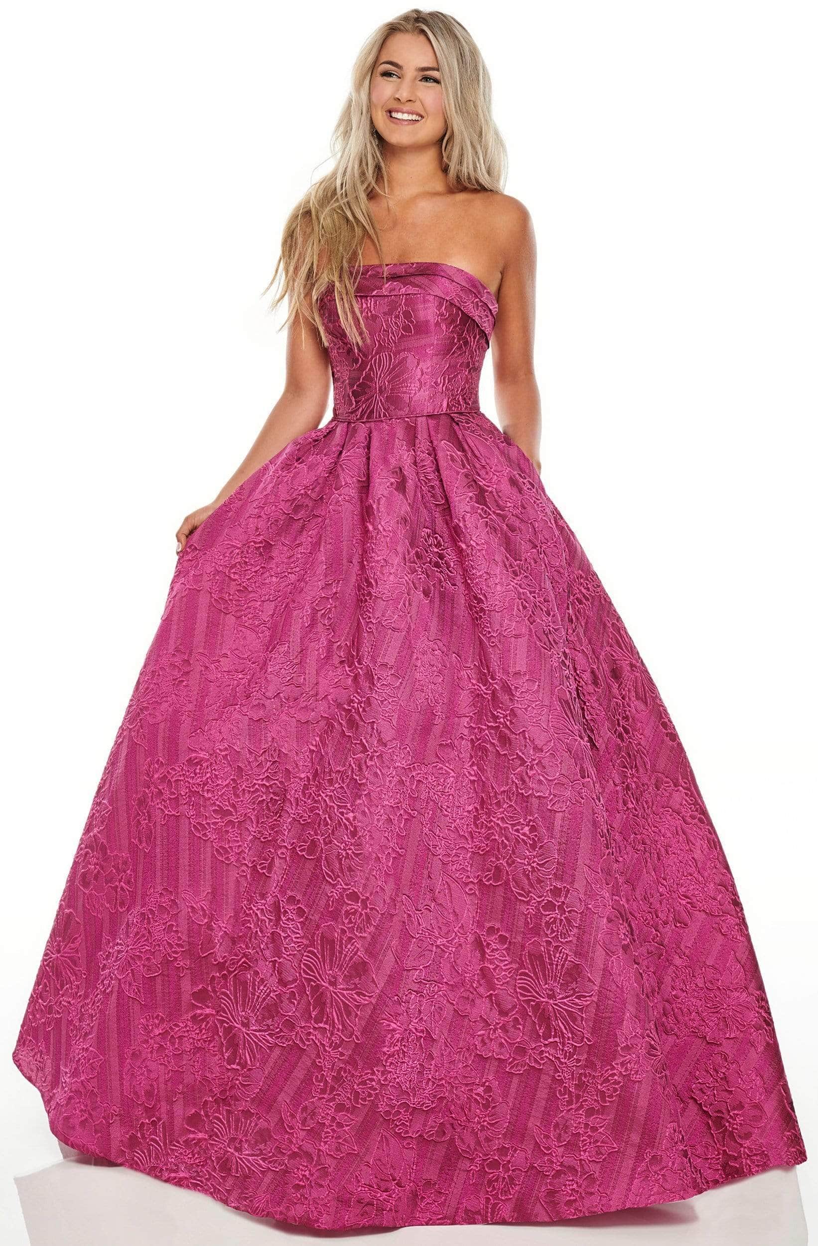 Embrace a wonderful evening in this remarkable creation by Rachel Allan 7013*. Made with a delicate floral jacquard fabric, this strapless gown accentuates your natural beauty. The straight-across neckline has subtle fold-over detailing, and the open back gives a touch of seductiveness. From the natural waist, the pleated skirt strikingly flares out a ballgown silhouette and flows to the sweeping train. Bloom with loveliness in this Rachel Allan 7013*'s exquisite gown. Models are wearing the Fuchsia, and Yellow colors.