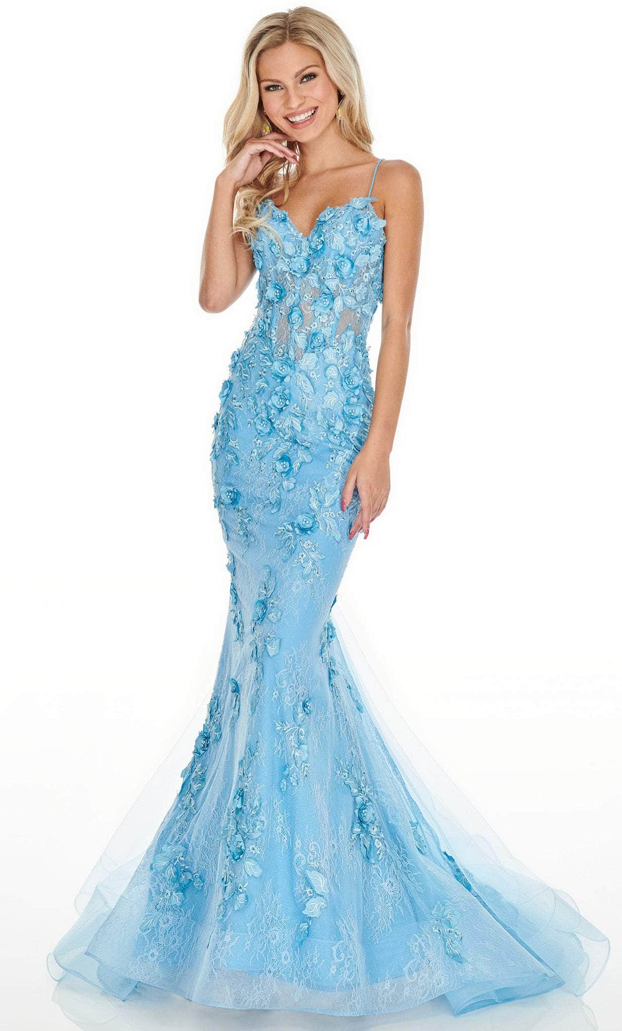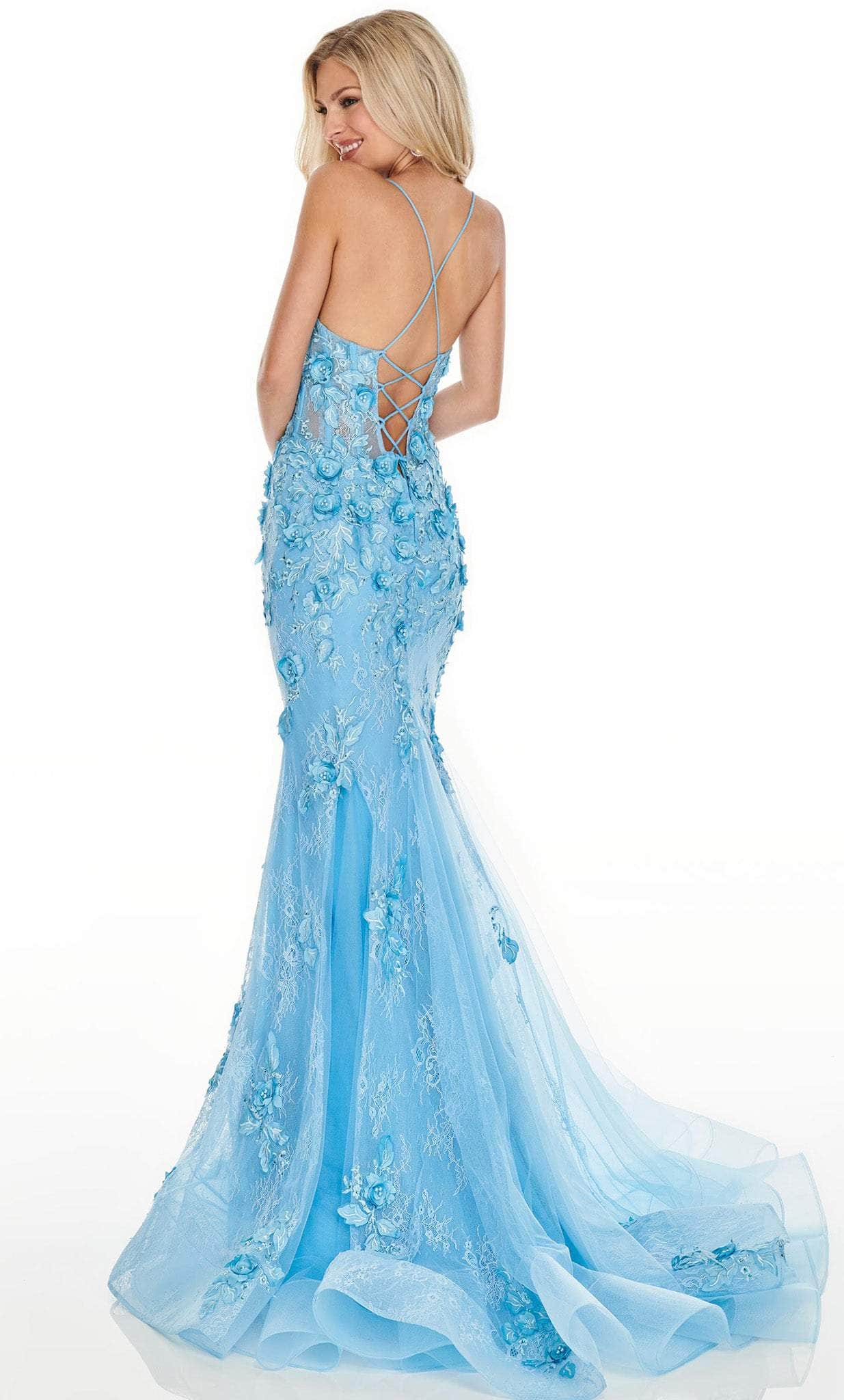 Embrace a wonderful evening in this wondrous creation by Rachel Allan 70278. This sleeveless gown has a sheer corset boning bodice with a v-neckline and is designed in gorgeous 3D floral lace appliques and scattered beads throughout its length. Supported by spaghetti straps, the open back has a lace-tie detail for a customized fit. The full length skirt is accented with godets to create a stunning trumpet silhouette, completed in horsehair hem and sweeping train. Flatter your finest assets as you enthrall the crowd in this Rachel Allan 70278 masterpiece. Models are wearing the Blush, Lilac, Sky Blue and Yellow colors.