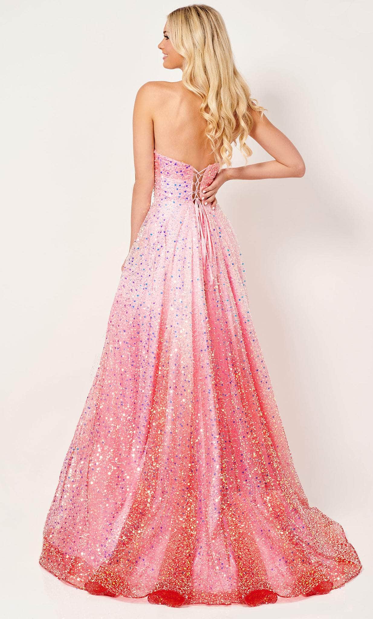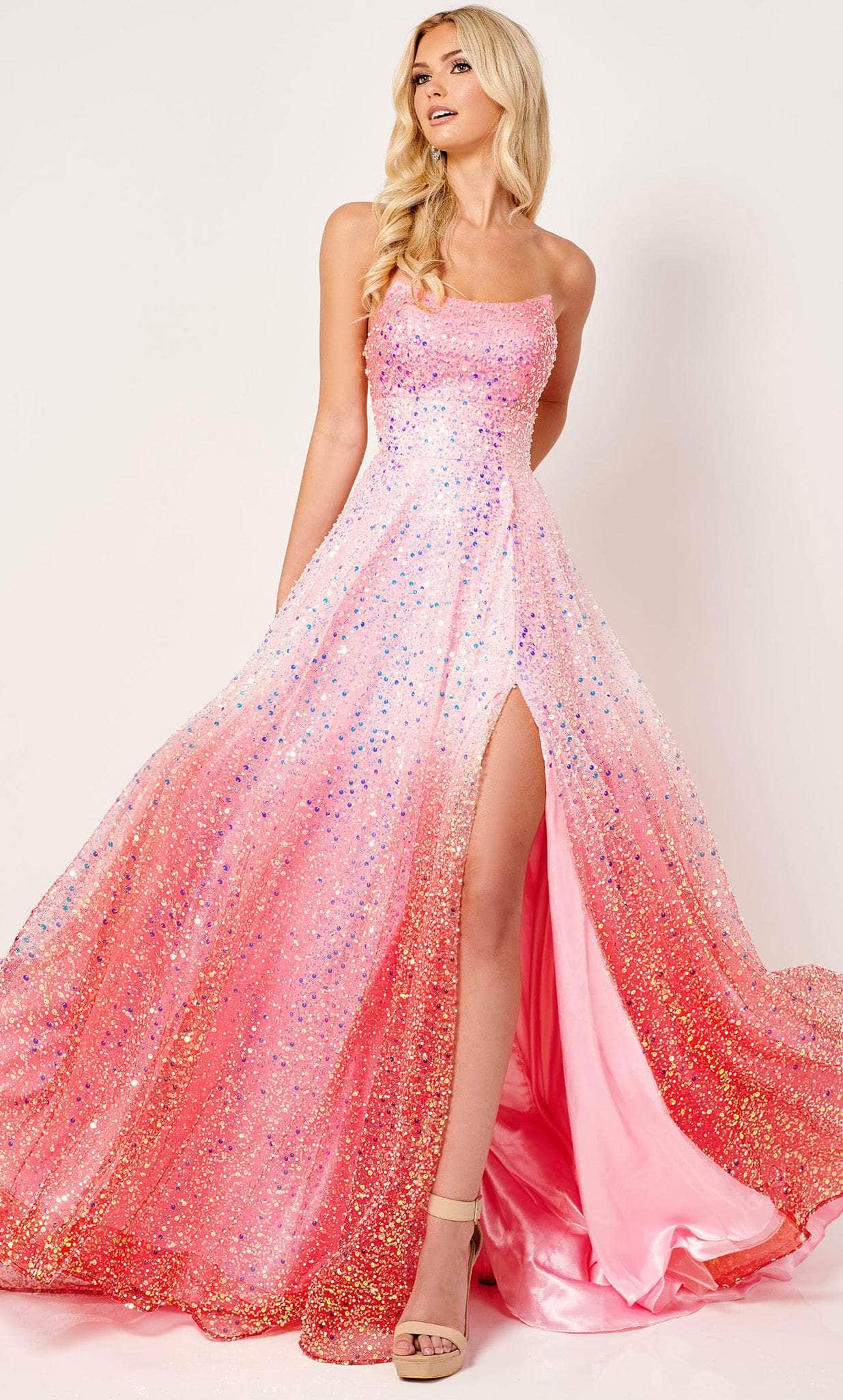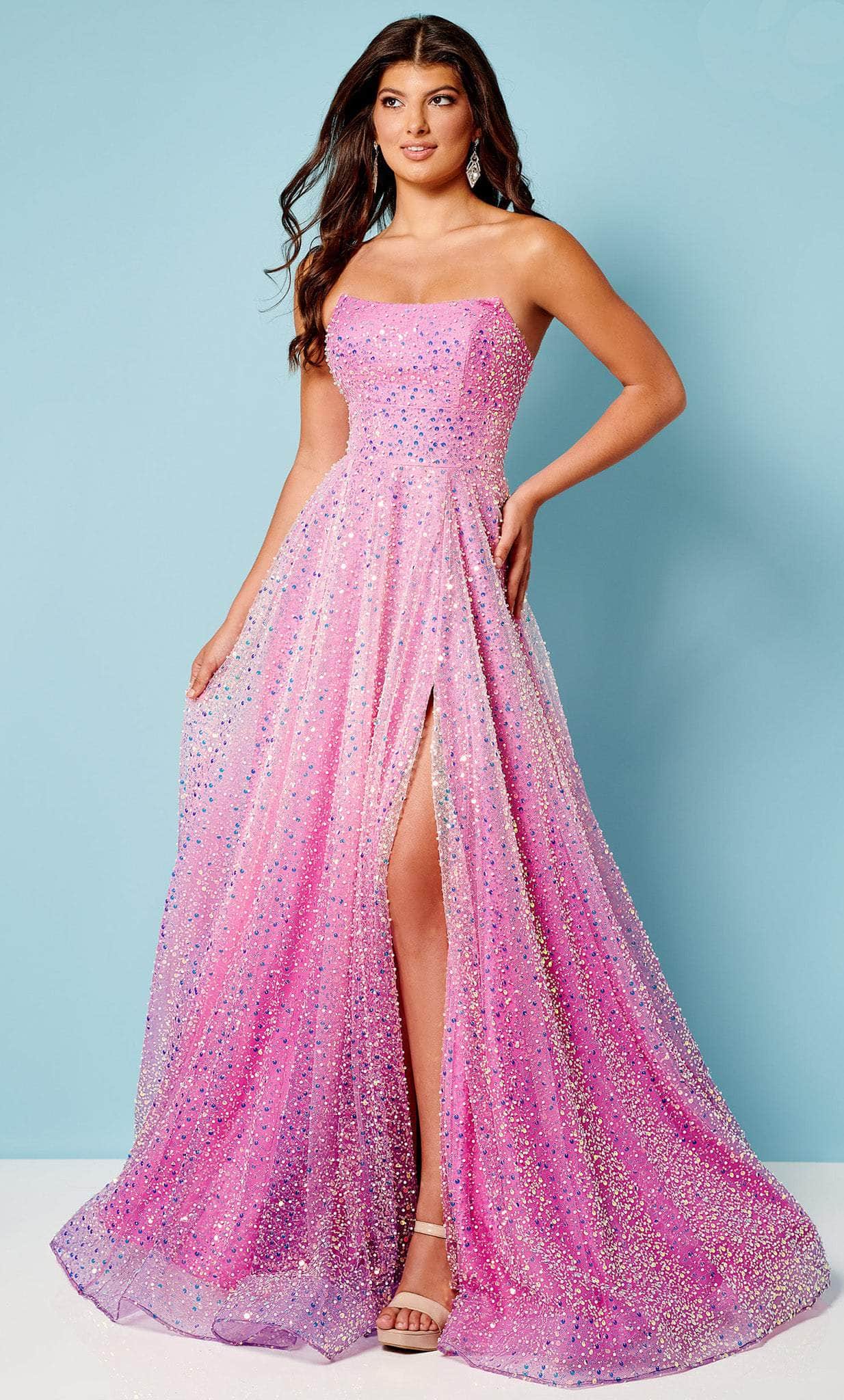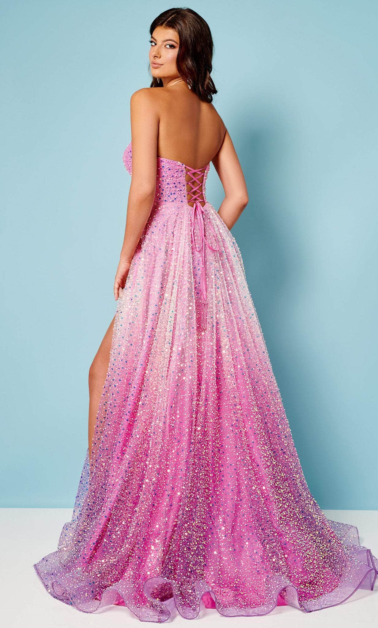 Capture the glitz as you walk down the aisle in this stunning Rachel Allan 70292 long dress. This gown sparkles as it is beautifully embellished with sparkling paillettes. This winning piece flaunts a strapless bodice with a straight-across neckline. The mid-open back is secured with a center zipper closure. The full-length skirt parades in an A-line silhouette and ends with a sweep train. A slit is added for an elegant touch. Wear this picture-perfect Rachel Allan 70292 masterpiece to exude a classic charm on your big day. Models are wearing Coral Ombre, Periwinkle Ombre, and Pink Ombre colors.