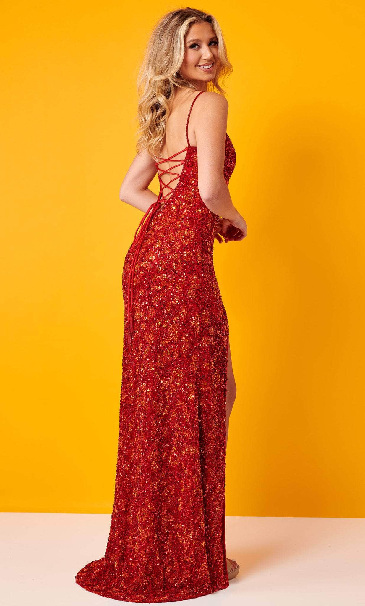 Show off your trendsetting style when you wear this Rachel Allan 70424. Opening with an elegant scoop neckline, this floor length gown offers a classy column silhouette. It has thin, beaded shoulder straps that extend to a strappy open back. The skirt's silhouette is cut with a high front slit, revelaing the bold inner lining. Meanwhile, a stunning array of multicolored sequins give a dazzling, multifaceted appeal to the ensemble. Make a lasting impression wearing this Rachel Allan 70424 masterpiece. Models are wearing Coral Gold, Ocean Lilac and Red Orange colors.