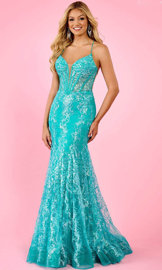 The fascinatingly made Rachel Allan 70491 gown is the intersection of beauty and sophistication. Crafted from a gorgeous spectacle of glitter tulle material, it forms an illusion V-neckline with delicate spaghetti straps. With a corset-style bodice and lace-up back, this dress exudes an upscale aura, shaping an adorned mermaid silhouette that gracefully extends into a sweeping train. This Rachel Allan 70491 creation harmoniously blends structure and femininity. Models are wearing the Jade, Light Pink, and Powder Blue colors.