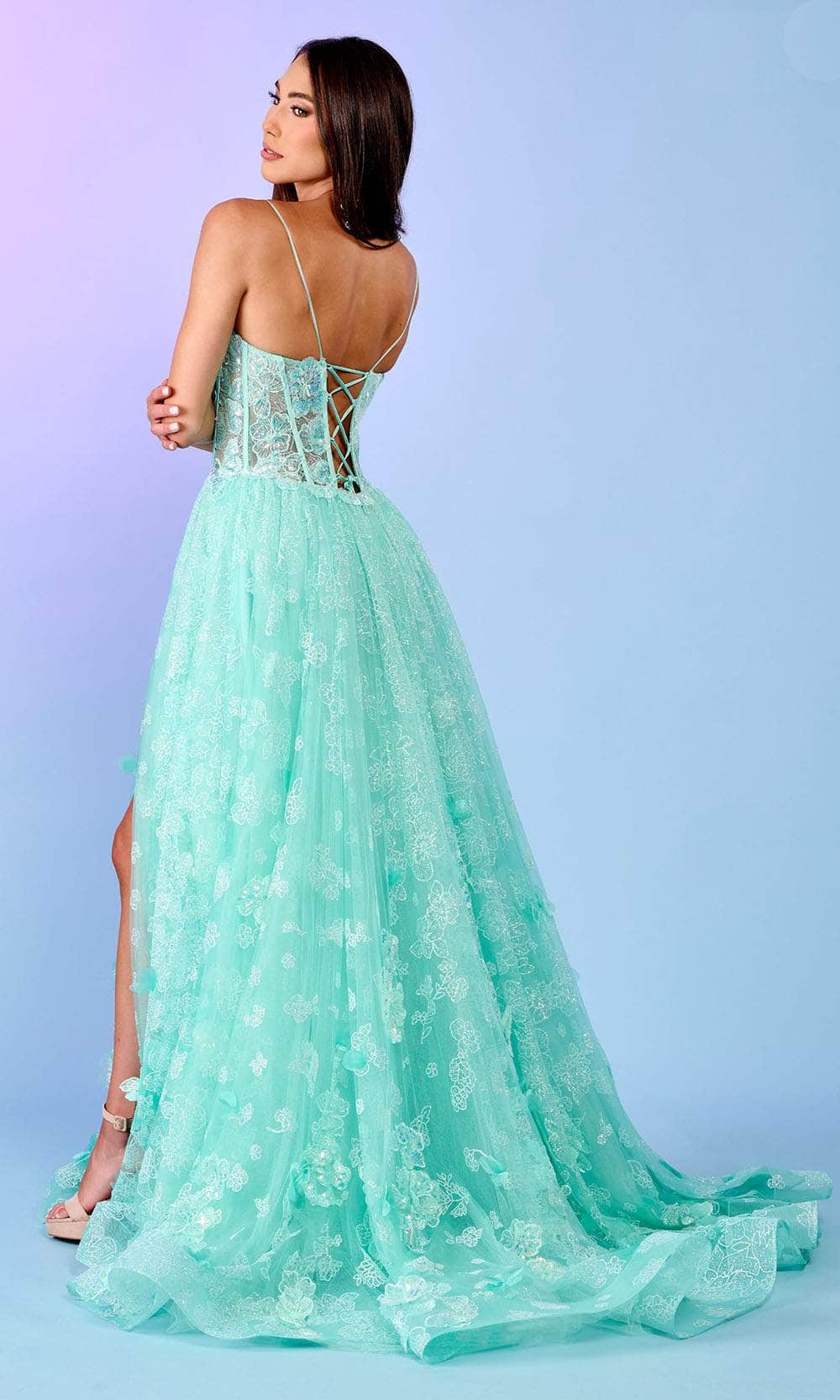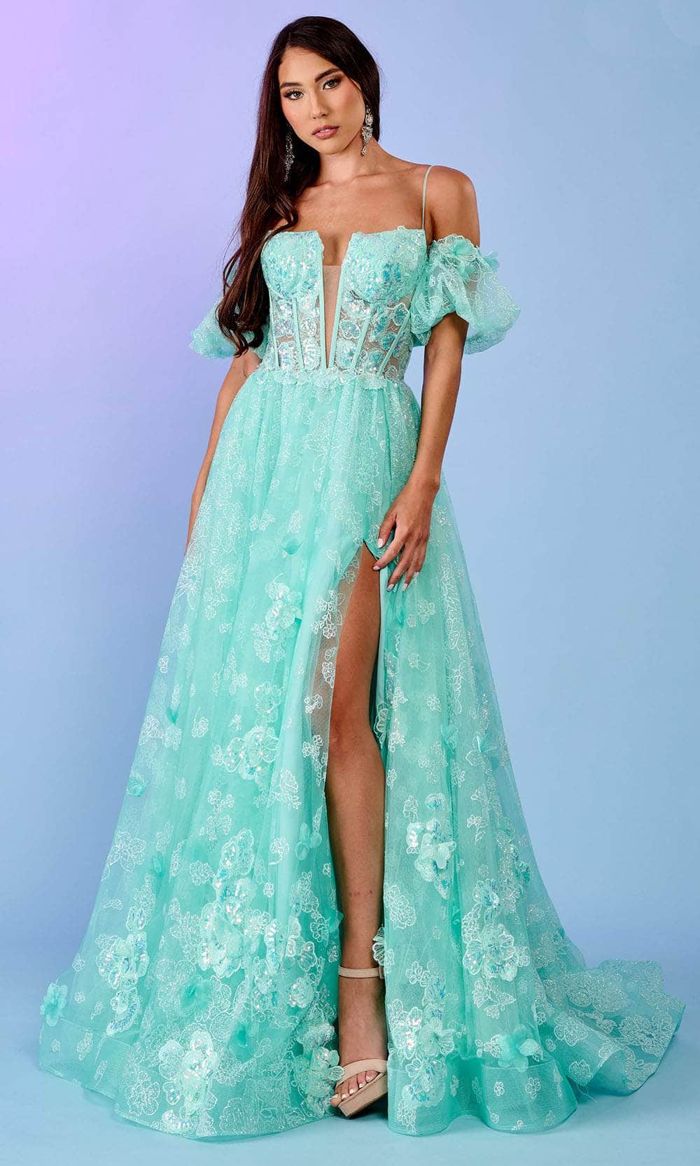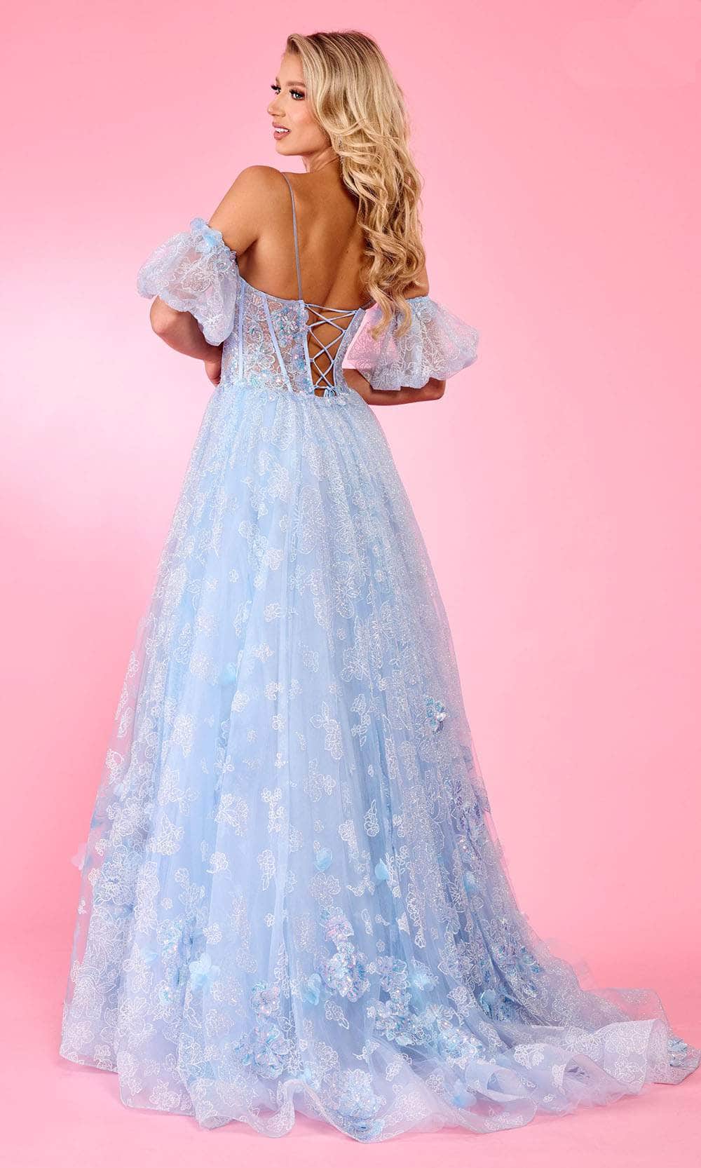 Give your unequivocal approval to the Rachel Allan 70557 creation and revel in its awe-inspiring beauty! This extraordinary tulle gown features a mesmerizing glittery texture and impeccable details that leave a lasting impression. The off-the-shoulder neckline exudes an elegant aura, while the addition of intricate beading and 3D flower appliques provides a touch of subtle radiance that ensures you will shine throughout the event. Complete with a tasteful slit, the A-line skirt gracefully drapes into a sweeping finale. Whatever the occasion, the Rachel Allan 70557 masterpiece is sure to captivate hearts and dazzle eyes with admiration. Models are wearing the Light Blue, Lilac, and Mint colors.