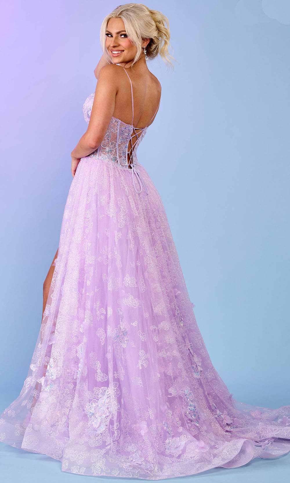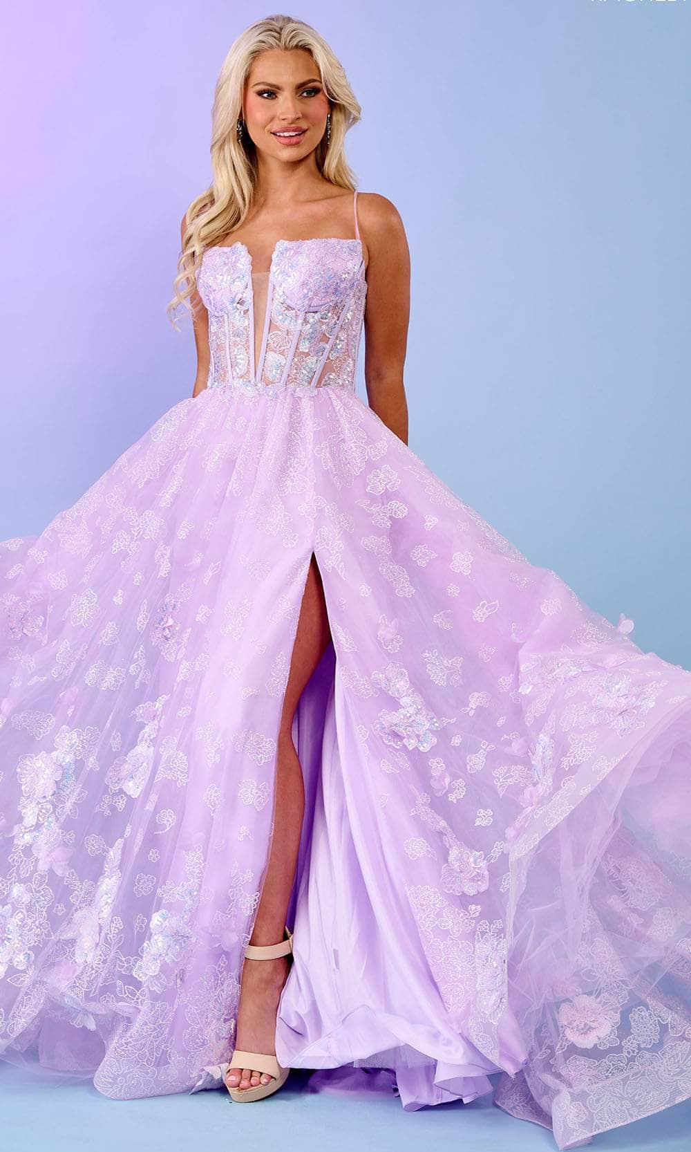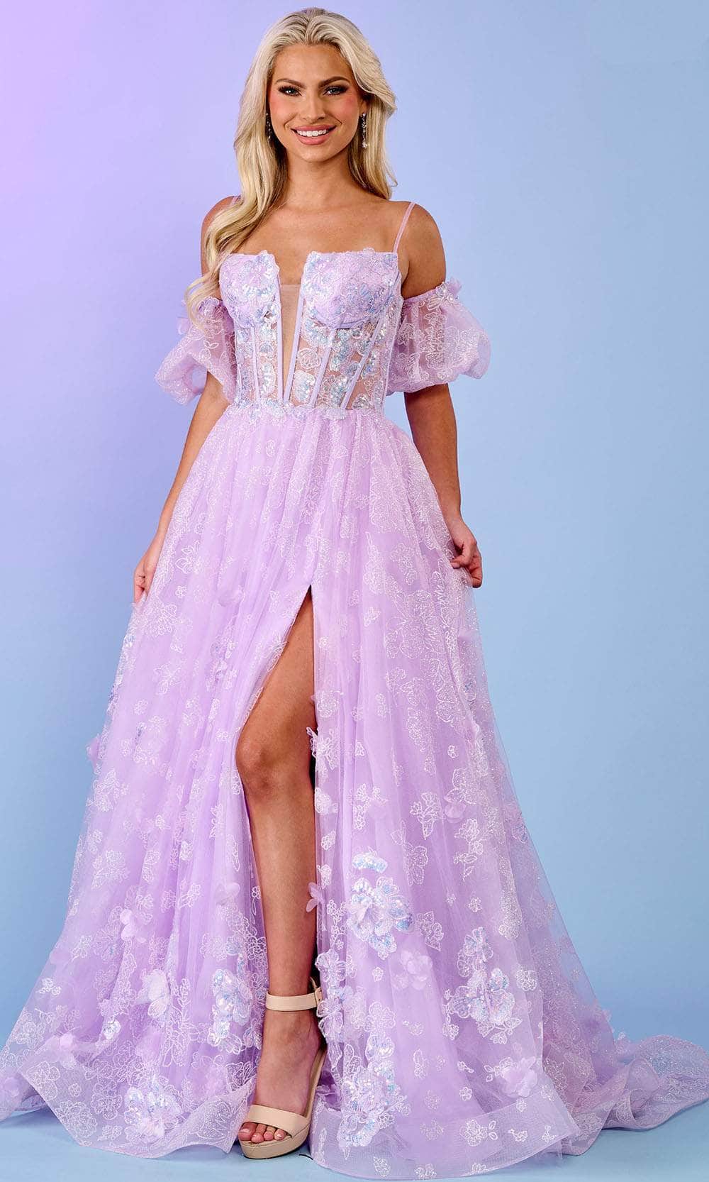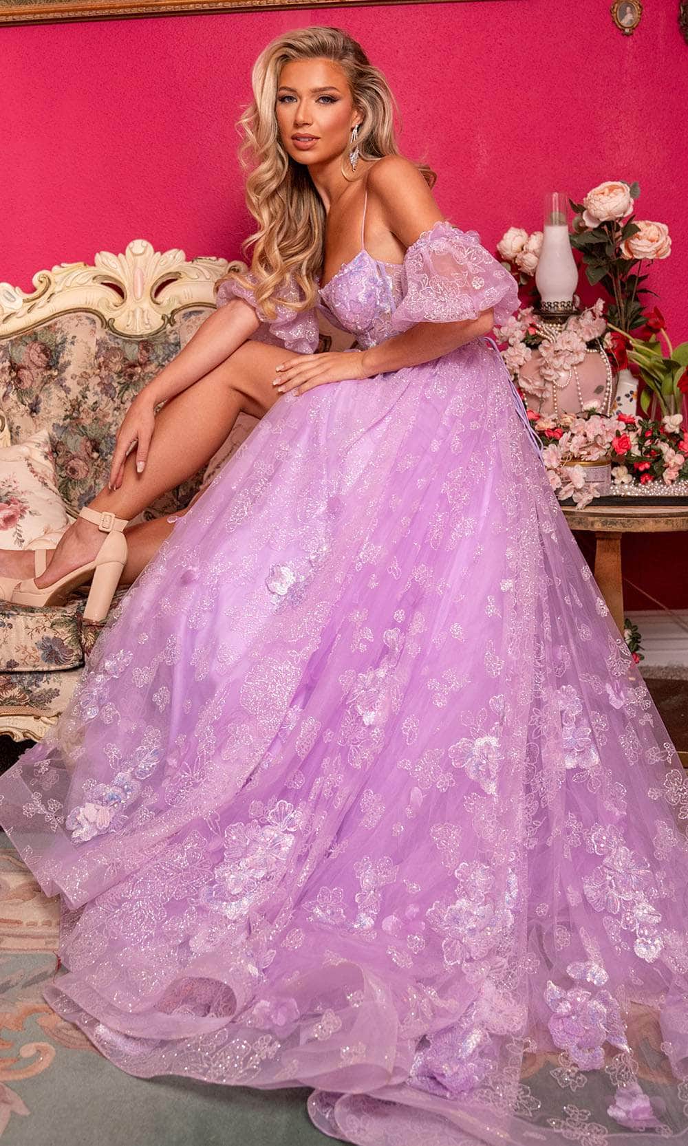 Give your unequivocal approval to the Rachel Allan 70557 creation and revel in its awe-inspiring beauty! This extraordinary tulle gown features a mesmerizing glittery texture and impeccable details that leave a lasting impression. The off-the-shoulder neckline exudes an elegant aura, while the addition of intricate beading and 3D flower appliques provides a touch of subtle radiance that ensures you will shine throughout the event. Complete with a tasteful slit, the A-line skirt gracefully drapes into a sweeping finale. Whatever the occasion, the Rachel Allan 70557 masterpiece is sure to captivate hearts and dazzle eyes with admiration. Models are wearing the Light Blue, Lilac, and Mint colors.