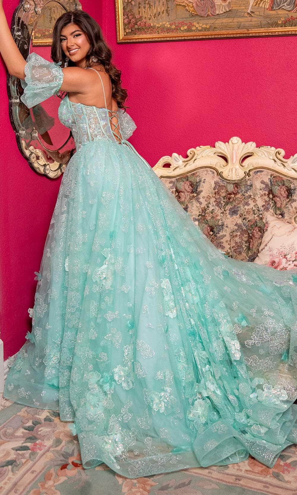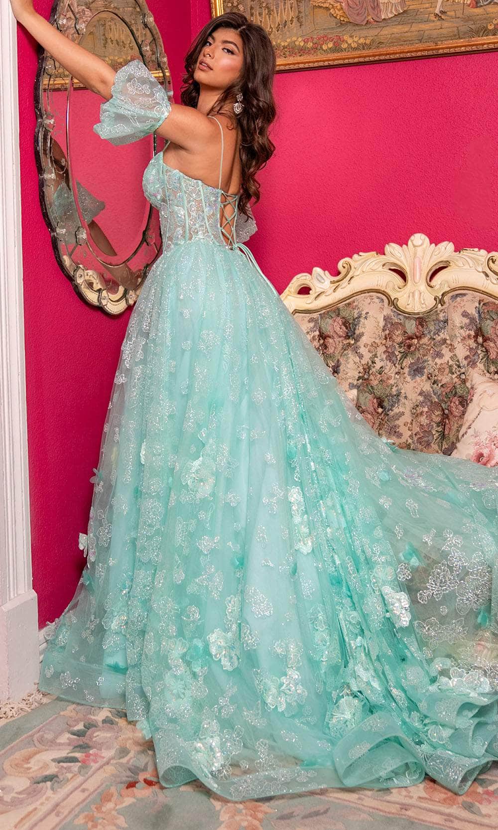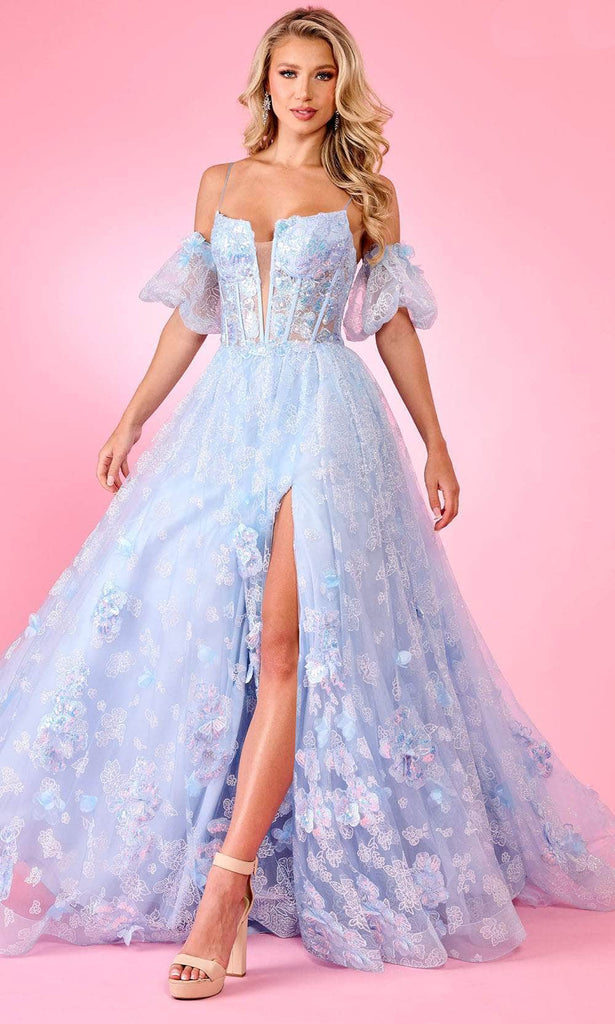 Details: Glitter Print, Embellished, Corset Boning, Puff Sleeves, Lace Up Back, High Slit, Sweep Train