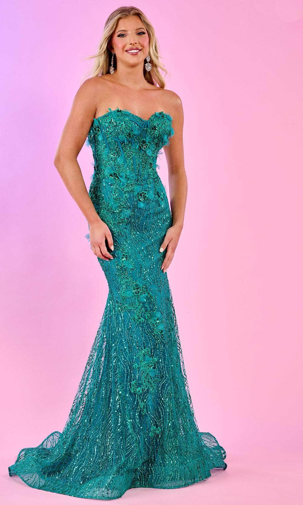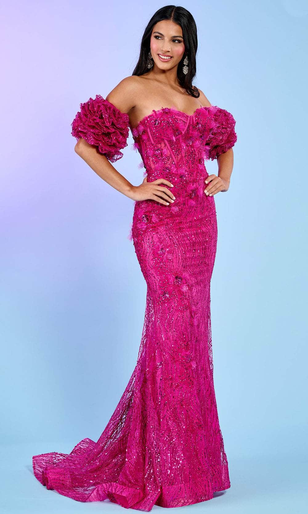 Elevate your presence and captivate with timeless elegance in the Rachel Allan 70580 creation. This dress is a work of art, designed with exquisite glittery fabrics and intricate appliques that blend glamour with a hint of femininity, resulting in a magnificent and unforgettable look. The addition of 3D flowers imparts an elevated sense of luxury to the gown, while the detachable ruffle arm bands provide that extra touch of allure, ensuring a mesmerizing appearance. The mermaid skirt flawlessly sculpts and gracefully flares to the floor, culminating in a gleaming train that exudes statuesque beauty and flair. Embrace this Rachel Allan 70580 masterpiece and be prepared to leave a lasting impression as you captivate the crowd with your presence. Models are wearing the Fuchsia, Jade, and Ocean Blue colors.