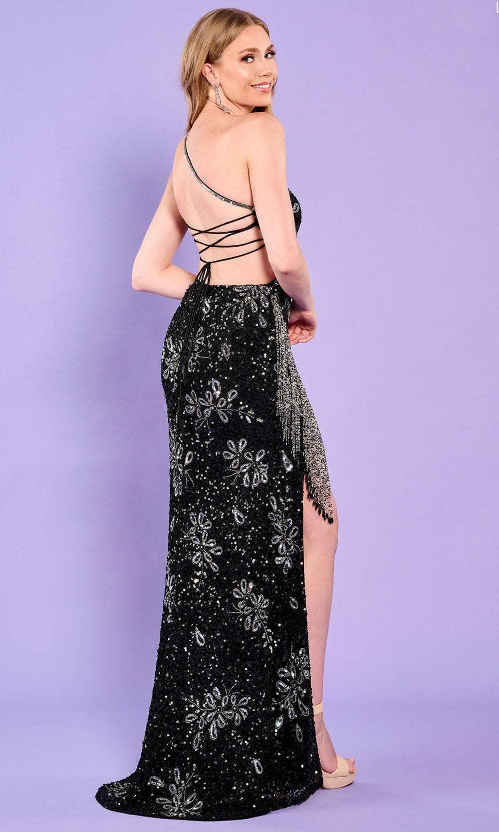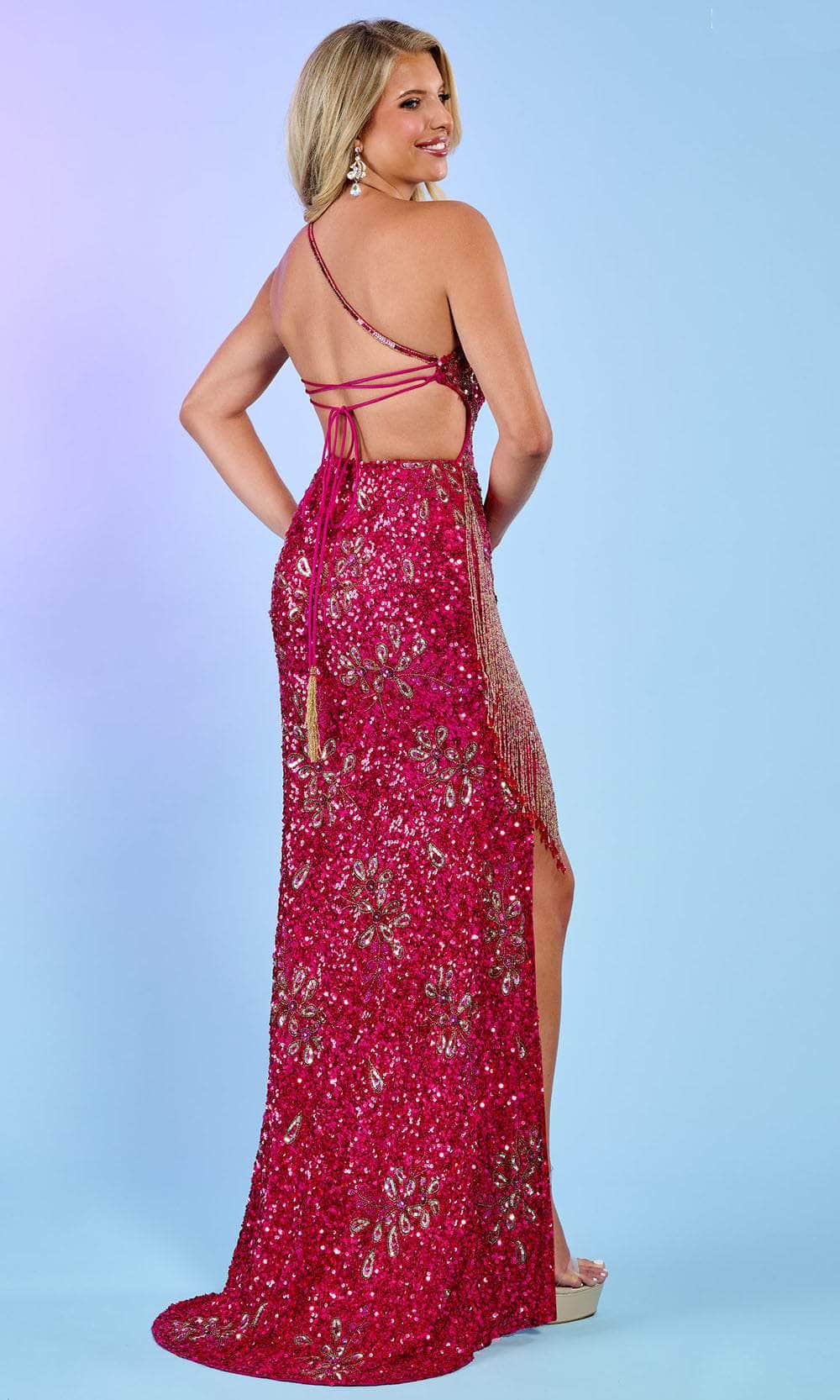 Prepare for an adventurous journey in the striking Rachel Allan 70584 evening gown. This dress features a captivating asymmetrical neckline and a single shoulder strap, complementing its fitted and sleeveless bodice. Its open back, tastefully fastened with lace, will captivate onlookers. Adorned entirely with sequins, this exquisite creation boasts a chic sheath skirt with a high slit, gracefully cascading to the floor and finished with a sweeping train. Make a statement as the belle of the ball in this breathtaking Rachel Allan 70584 masterpiece! Models are wearing Black Silver, Deep Magenta, and Royal Silver colors.