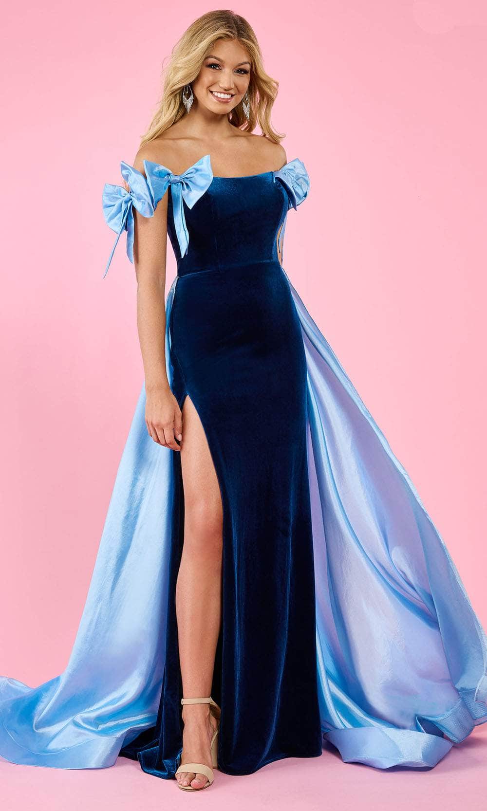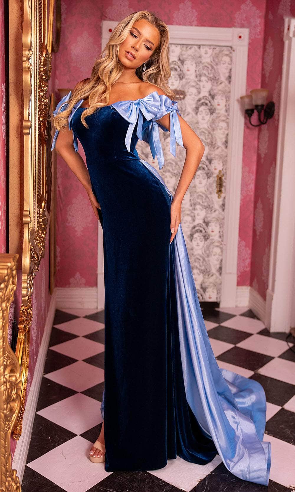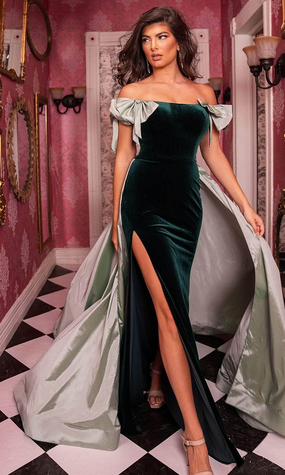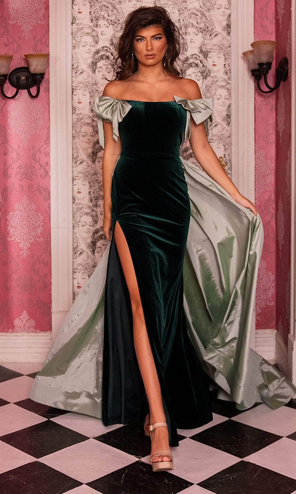 You are more than elegant when you wear this unbeatable gown from Rachel Allan 70597. Designed to beautifully accentuate your figure, this velvet gown presents a straight-across off-shoulder neckline and cap sleeves with unique bow accents. A zipper closure on the mid-open back properly secured the bodice. The skirt glides to the floor in a striking sheath silhouette and parts with a high slit for a sexy leg exposure. Complete by the enchanting A-line taffeta overskirt and sweeping train. Make your night one to remember in this Rachel Allan 70597 creation. Models are wearing Black Pink, Emerald Sage, and Navy Sky Blue colors.