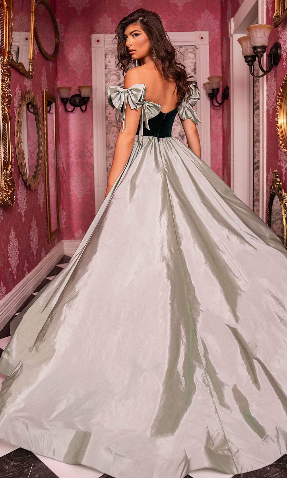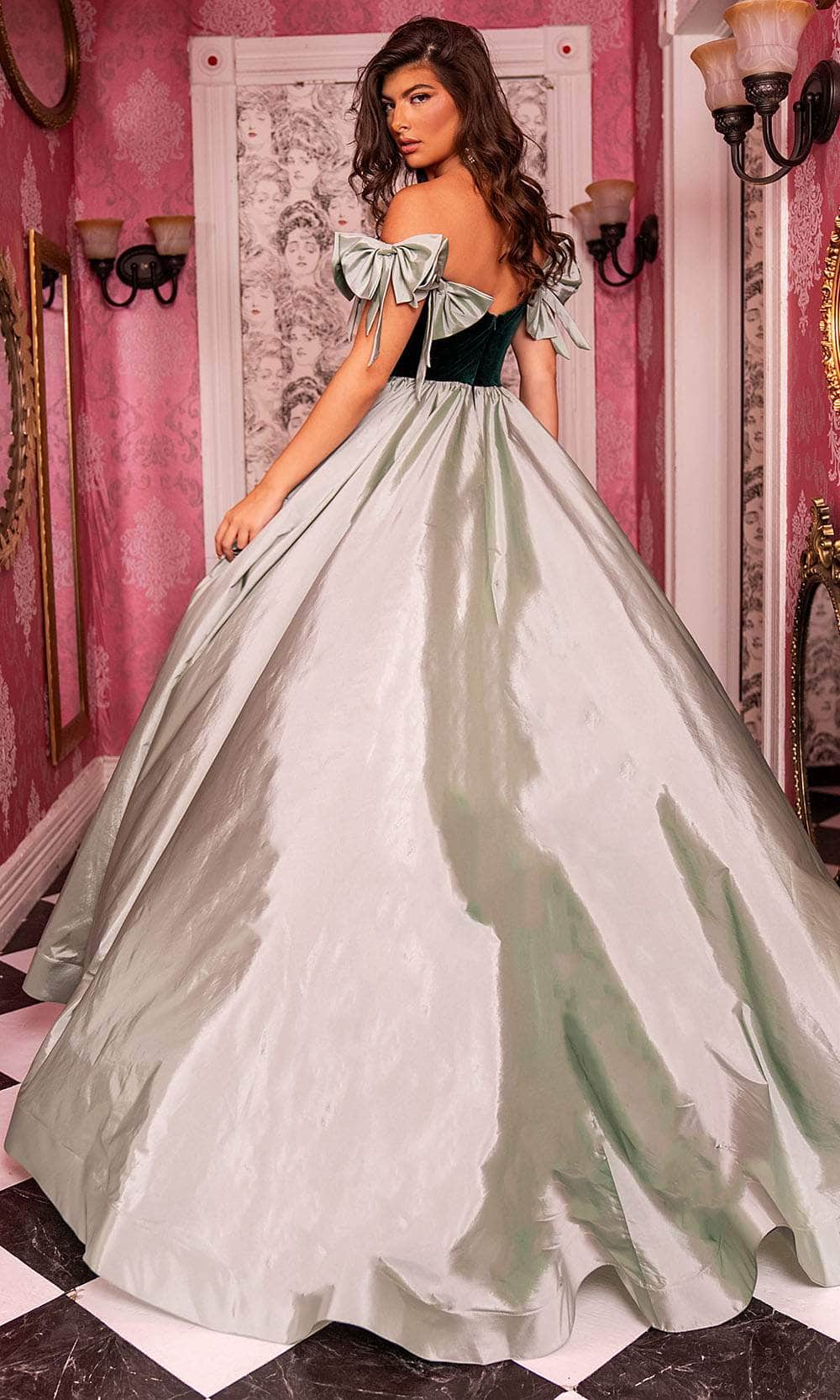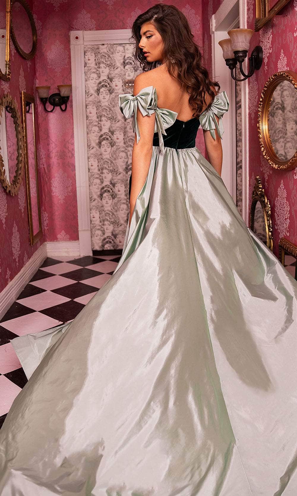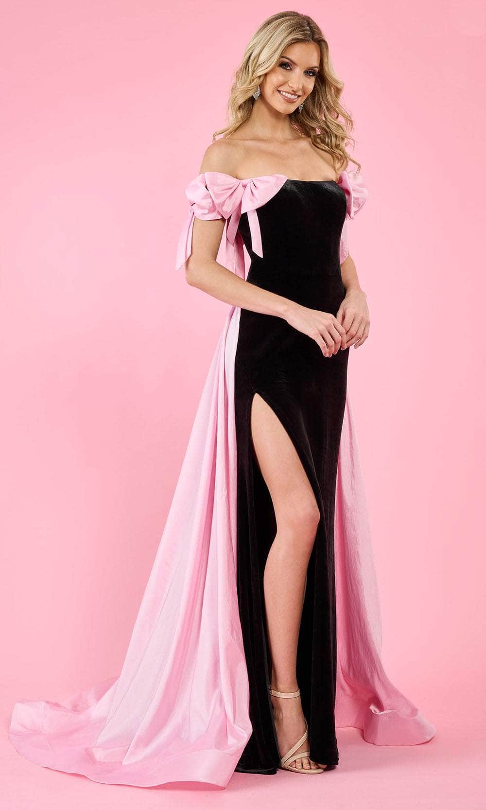 You are more than elegant when you wear this unbeatable gown from Rachel Allan 70597. Designed to beautifully accentuate your figure, this velvet gown presents a straight-across off-shoulder neckline and cap sleeves with unique bow accents. A zipper closure on the mid-open back properly secured the bodice. The skirt glides to the floor in a striking sheath silhouette and parts with a high slit for a sexy leg exposure. Complete by the enchanting A-line taffeta overskirt and sweeping train. Make your night one to remember in this Rachel Allan 70597 creation. Models are wearing Black Pink, Emerald Sage, and Navy Sky Blue colors.