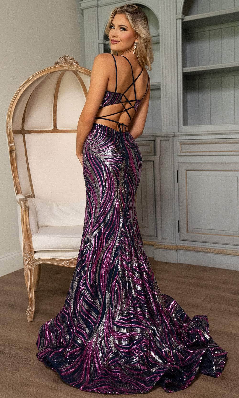 Turn heads in the dazzling Rachel Allan 70721, a gown designed for those who love to shine. This striking sheath gown is adorned with a mesmerizing abstract sequin pattern that glimmers with every movement. The sweetheart neckline paired with delicate dual spaghetti straps offers a flattering and elegant frame. A high slit adds an element of sophistication and allure, making this gown the perfect choice for glamorous evening events. This Rachel Allan 70721 masterpiece ensures you make a lasting impression. Models are wearing Black Tangerine, Lilac Purple, Navy Fuchsia, and Turquoise colors.