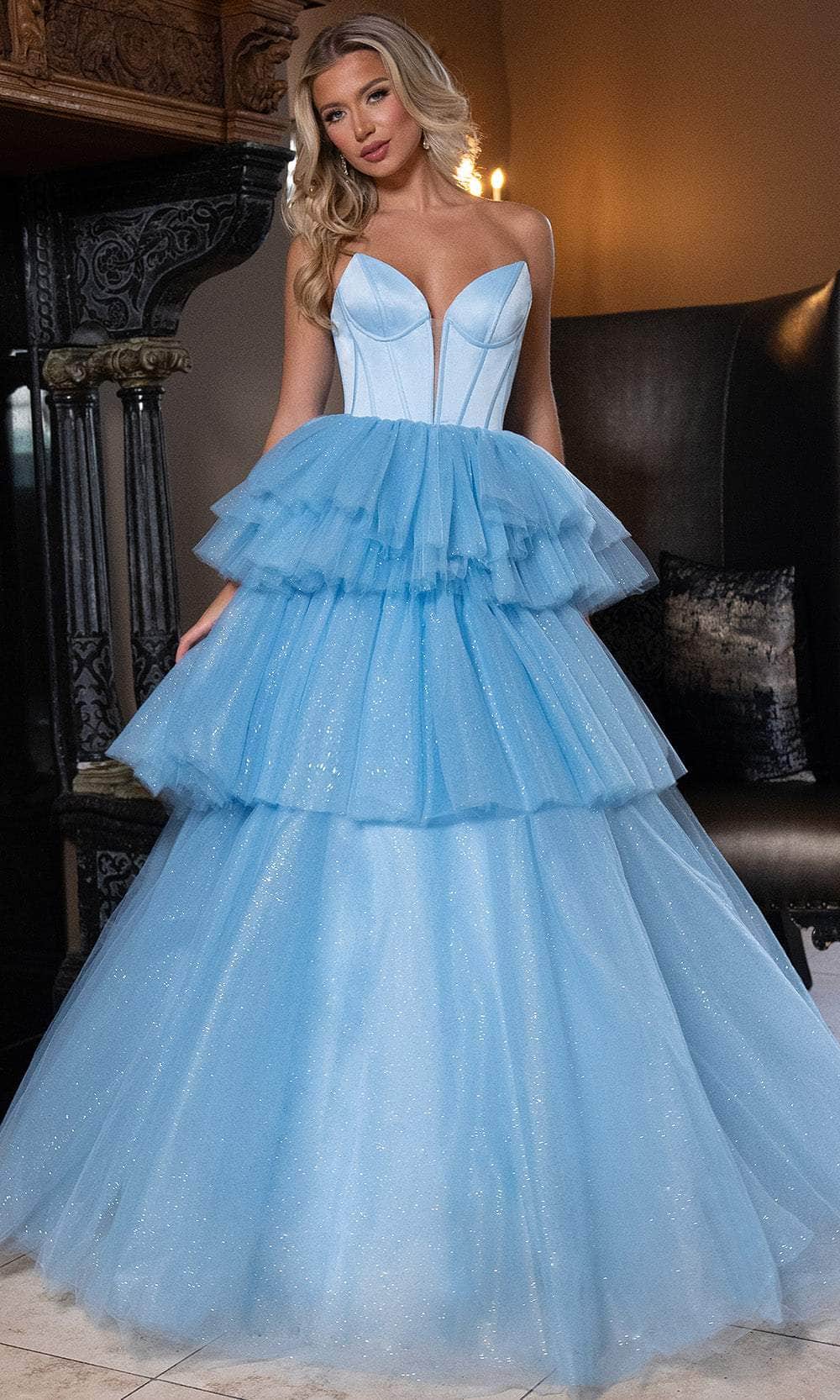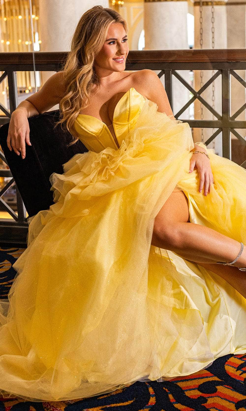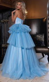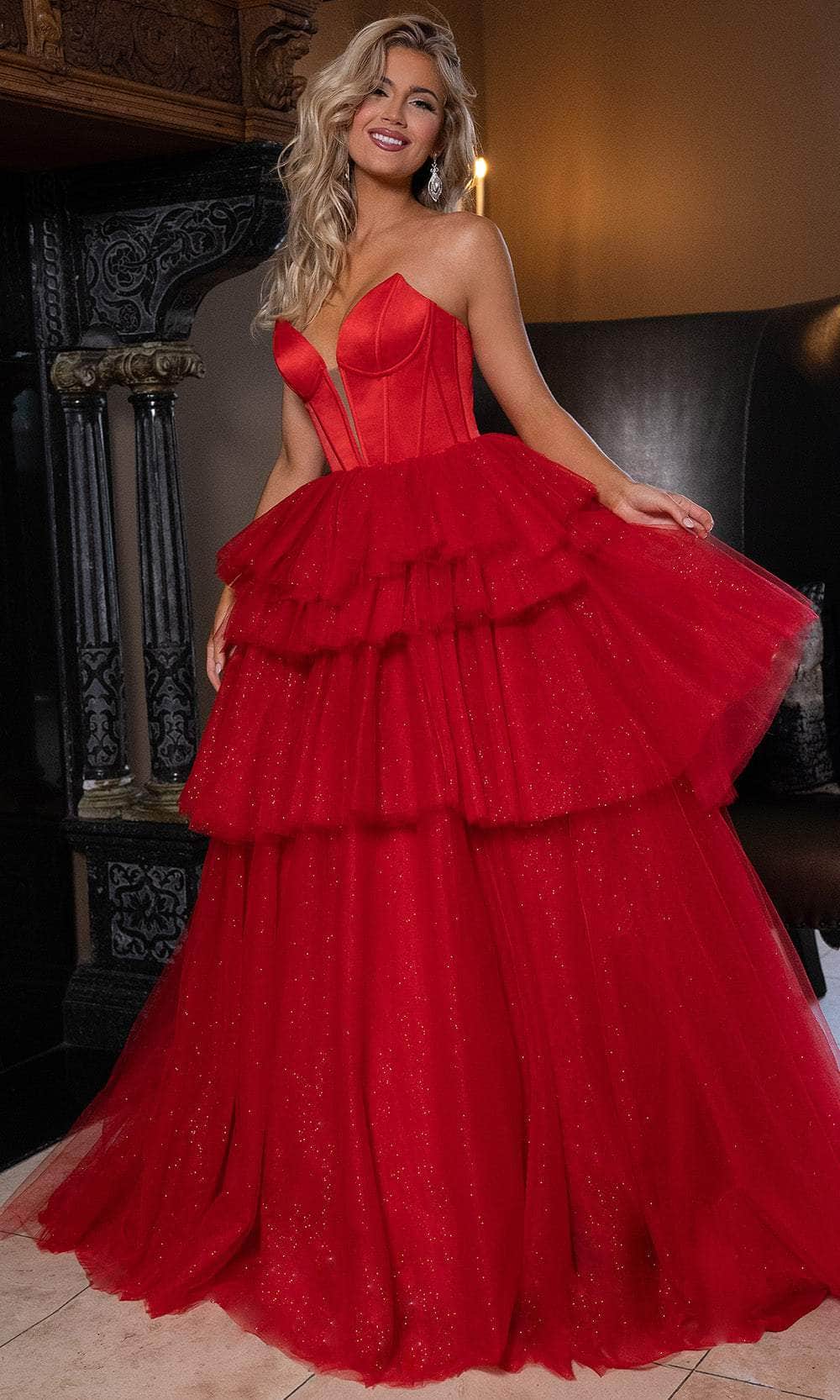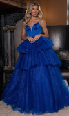 Step into a world of glamour with the Rachel Allan 70876, a gown designed to captivate with every twirl. Featuring a plunging v-neckline and structured corset bodice, this gown cinches the waist while the tiered ruffle skirt cascades into a voluminous ballgown silhouette. Shimmering with subtle glitter accents, it catches the light beautifully, making you the center of attention. Ideal for prom, gala, or formal affair, this gown delivers unmatched elegance. Make your grand entrance in the Rachel Allan 70876 and let your presence shine. Models are wearing Powder Blue, Red, Royal, and Yellow colors.