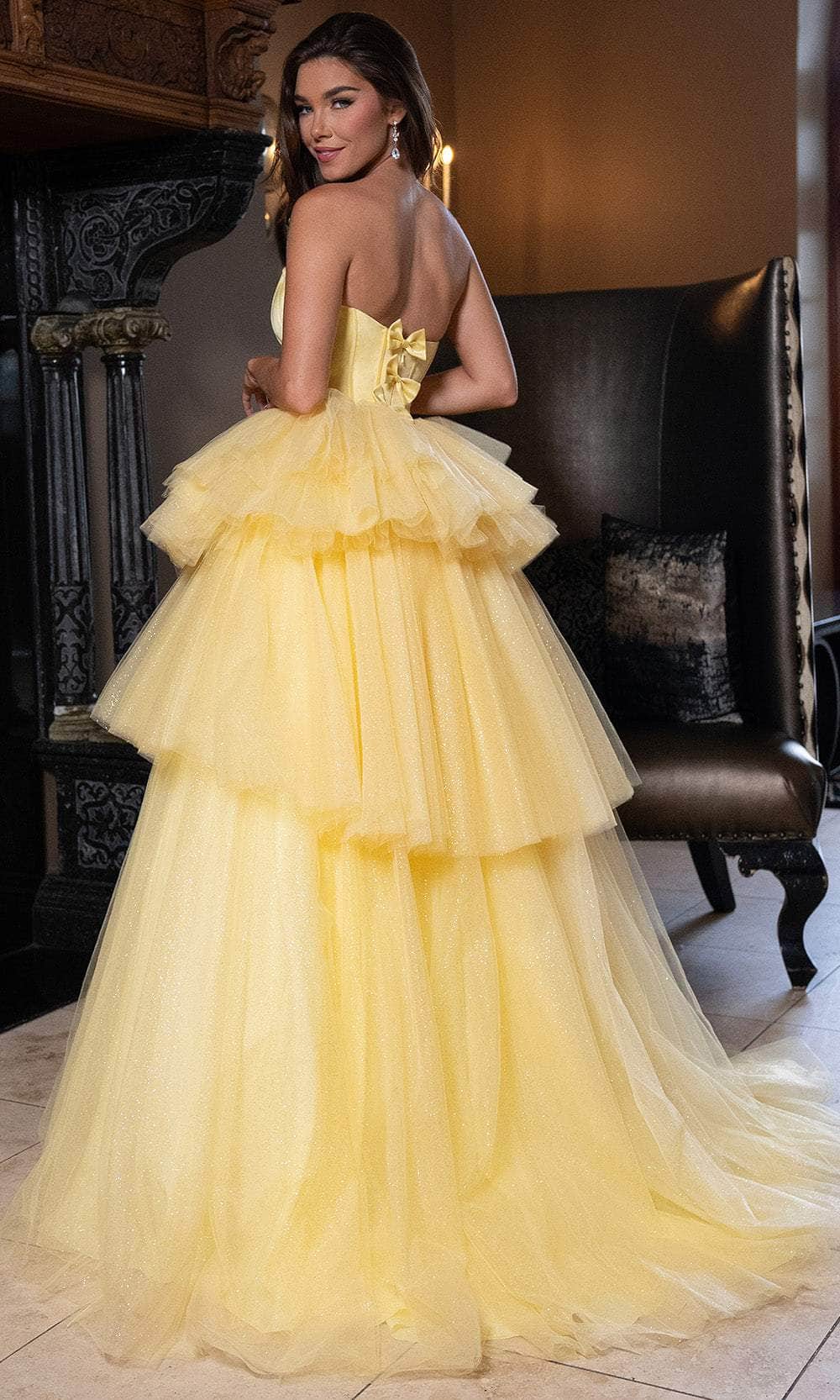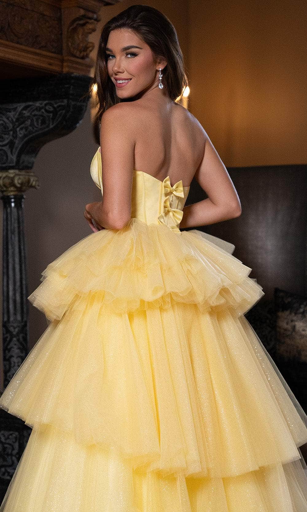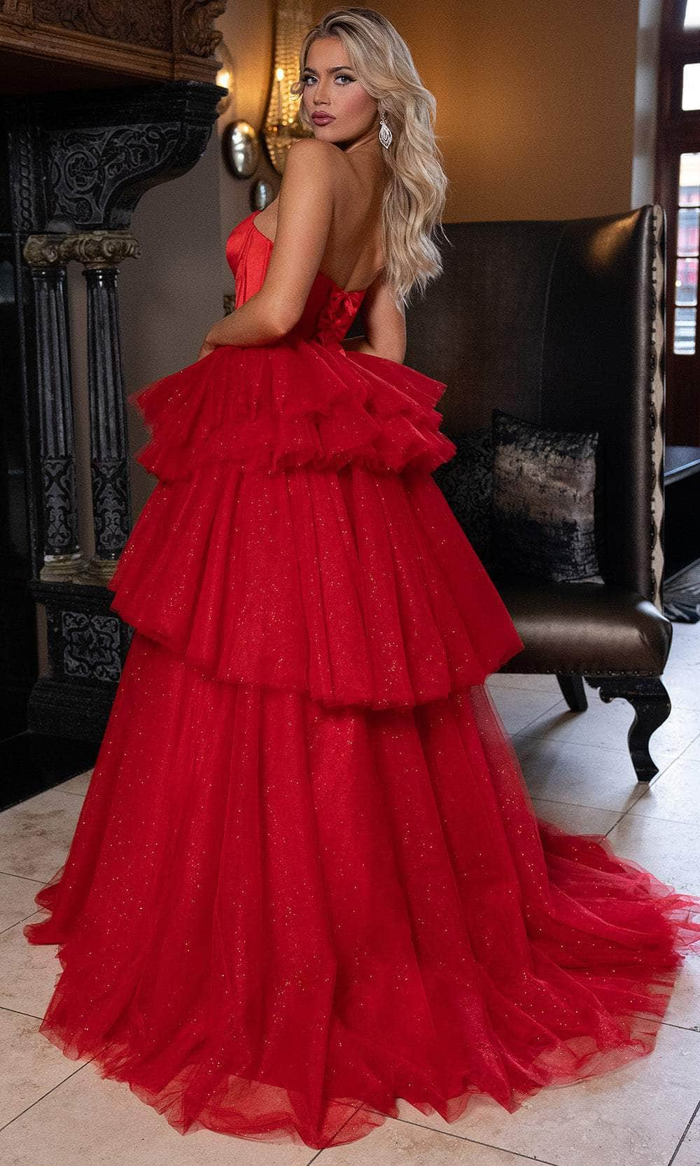 Step into a world of glamour with the Rachel Allan 70876, a gown designed to captivate with every twirl. Featuring a plunging v-neckline and structured corset bodice, this gown cinches the waist while the tiered ruffle skirt cascades into a voluminous ballgown silhouette. Shimmering with subtle glitter accents, it catches the light beautifully, making you the center of attention. Ideal for prom, gala, or formal affair, this gown delivers unmatched elegance. Make your grand entrance in the Rachel Allan 70876 and let your presence shine. Models are wearing Powder Blue, Red, Royal, and Yellow colors.