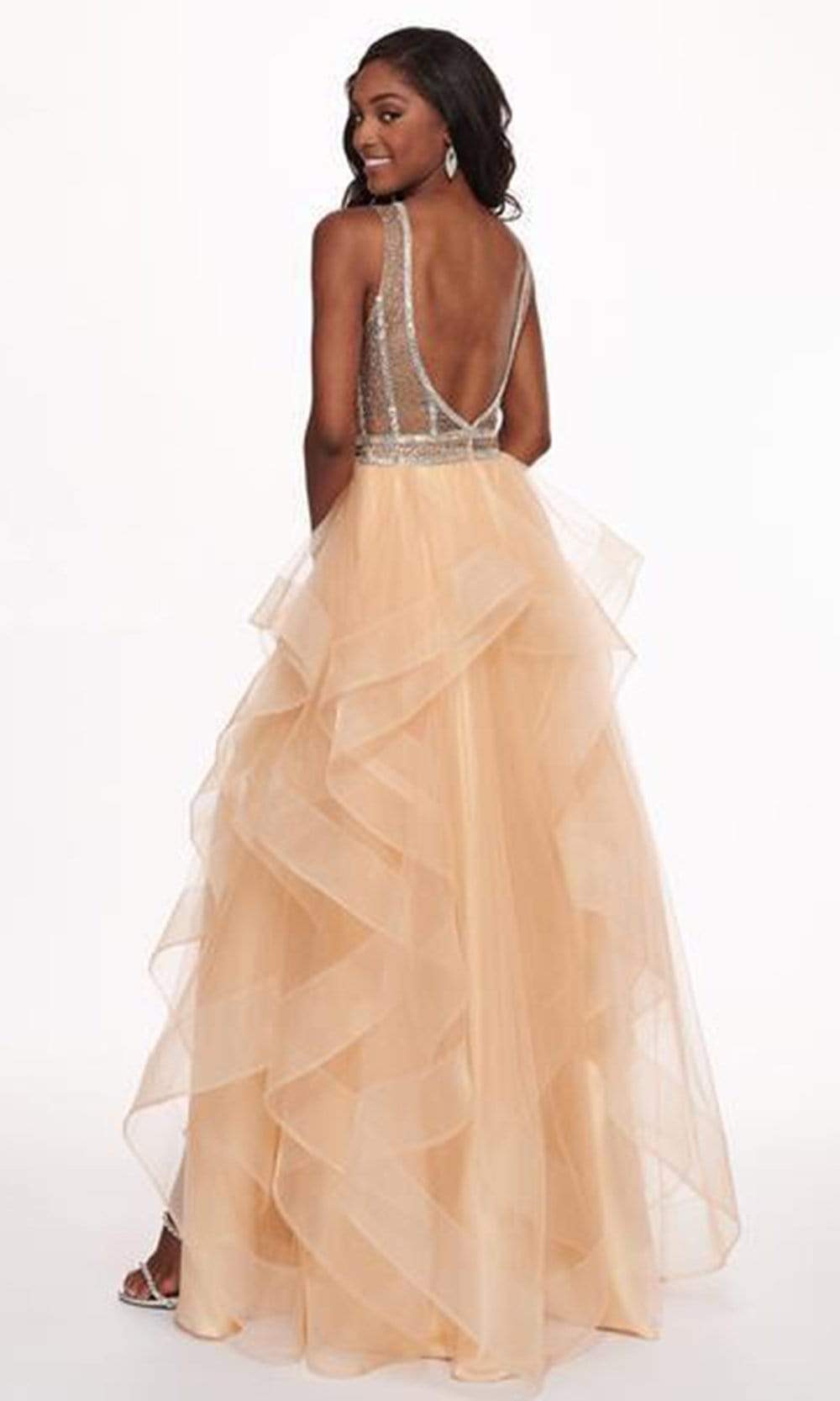 | Details: | Tulle, Beaded, Low scoop back, Sleeveless, Ruffled skirt, High-low hem, Back zipper closure, Lined |